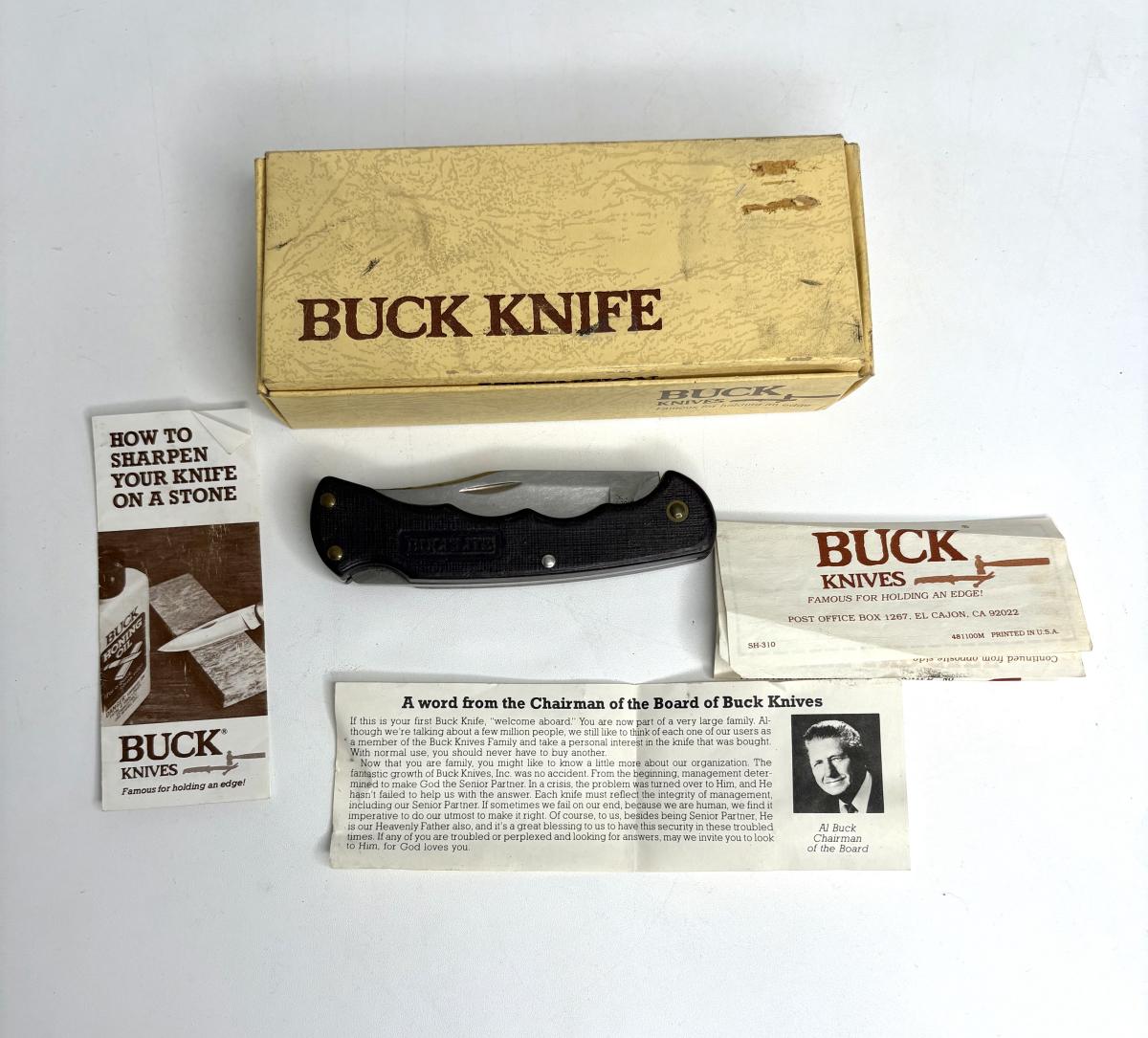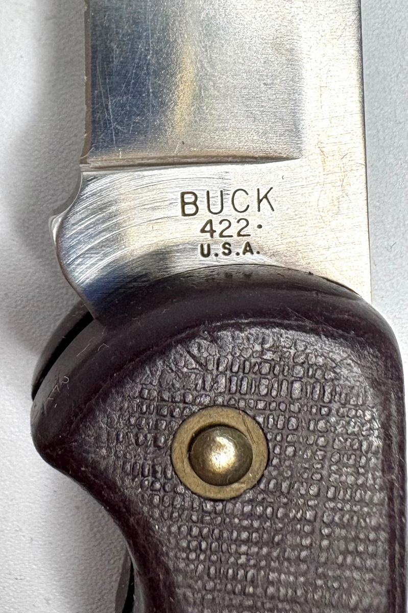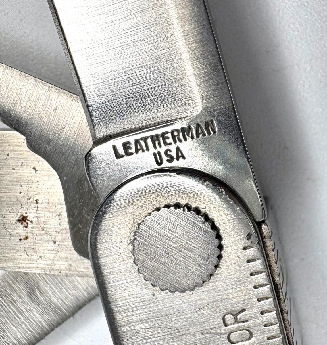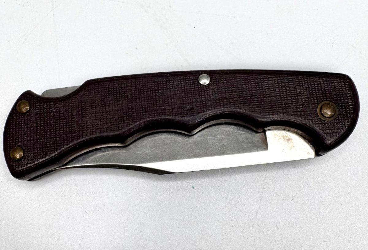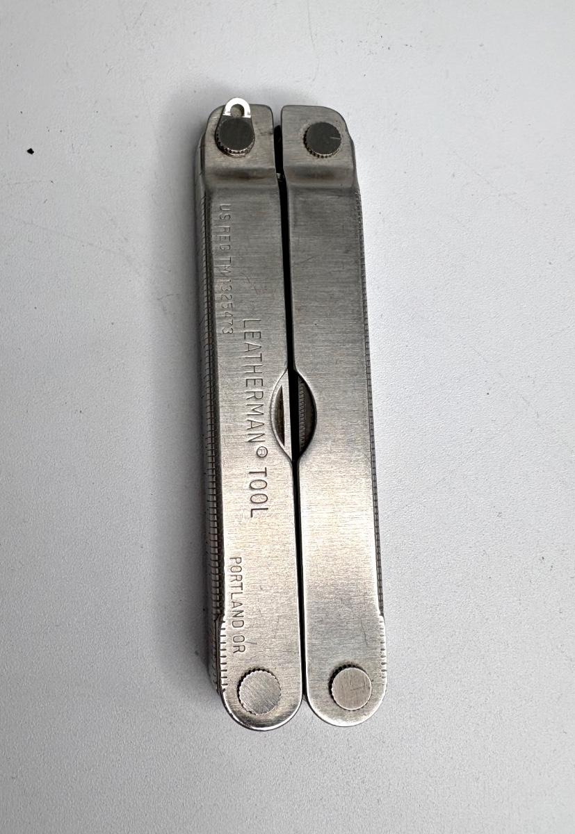 Buck knife is 4-1/4” long; Leatherman is 4” long; truck pocket knife is 3-1/3” long; cream colored knife is 3-1/4” long; red knife is 3” long; silver and brown knife is 2-1/2” long; steel knife is 2-1/2” long; sharpener is 3”.