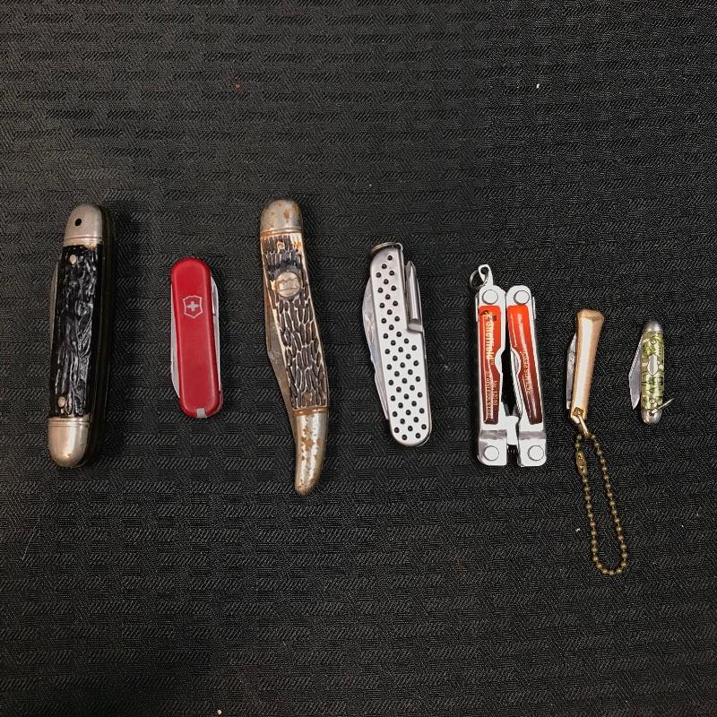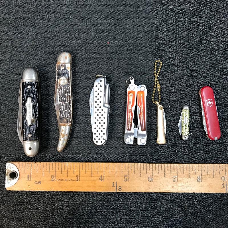 Lot of seven pocket knives in varying condition; see pictures. Some will have rust, dullness, or blunted tips.