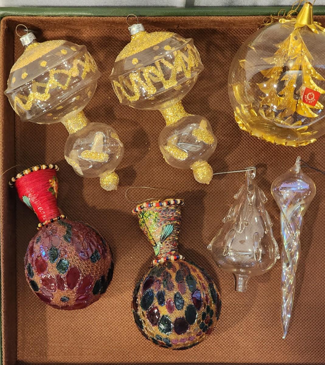 Lot of 7 Vintage Glass Christmas Ornaments - Some German. 1 Resl Lenz, Stained Glass