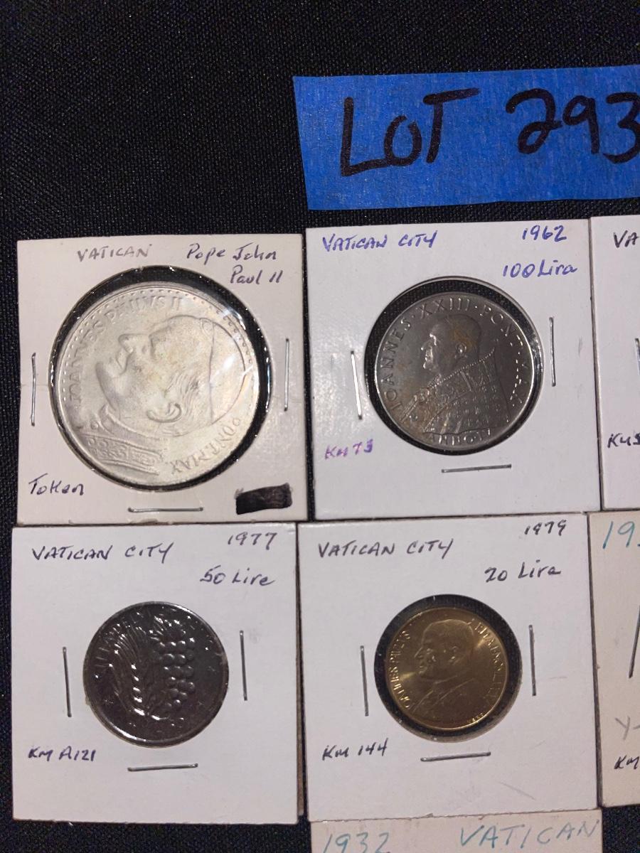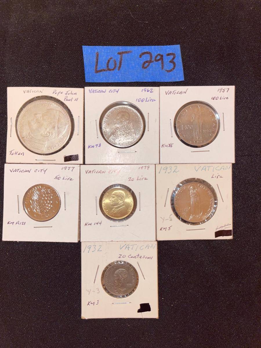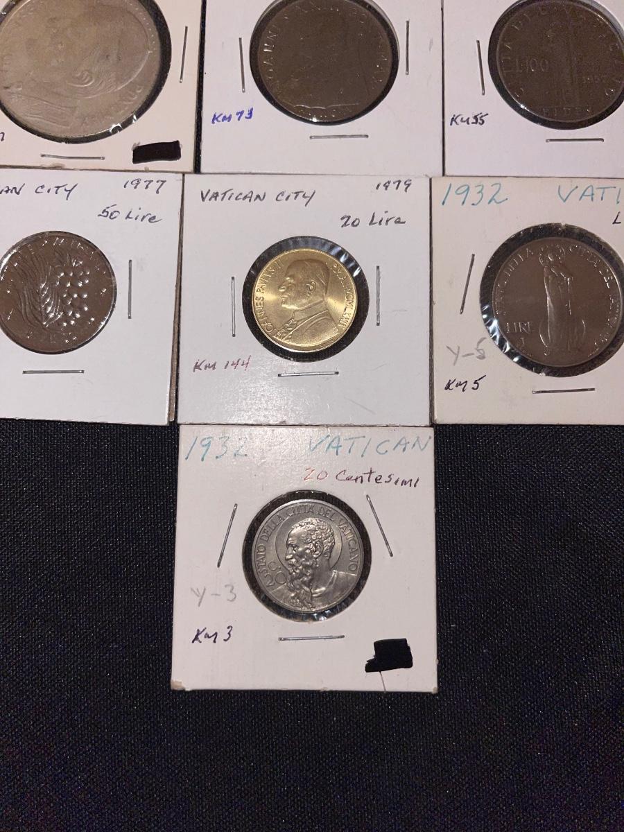 Lot of (7) vintage Italty vatican coins- Pope John Paul 2 Token, 1962 100 Lira km 73, 1957 100 lire km 55, 1977 50 lire km A121, 1979 20 lira km 144, 1932 lira km 5, 1932 20 centesimi km 3