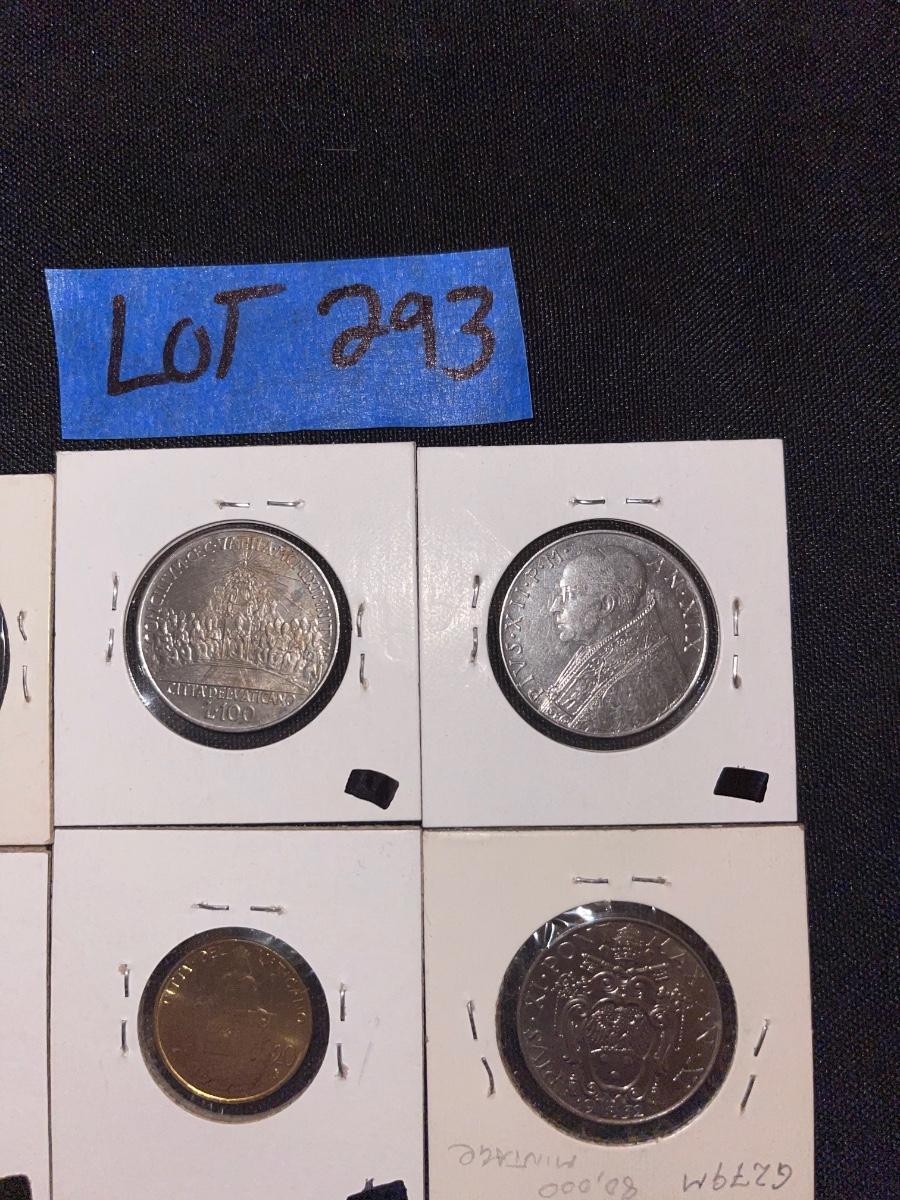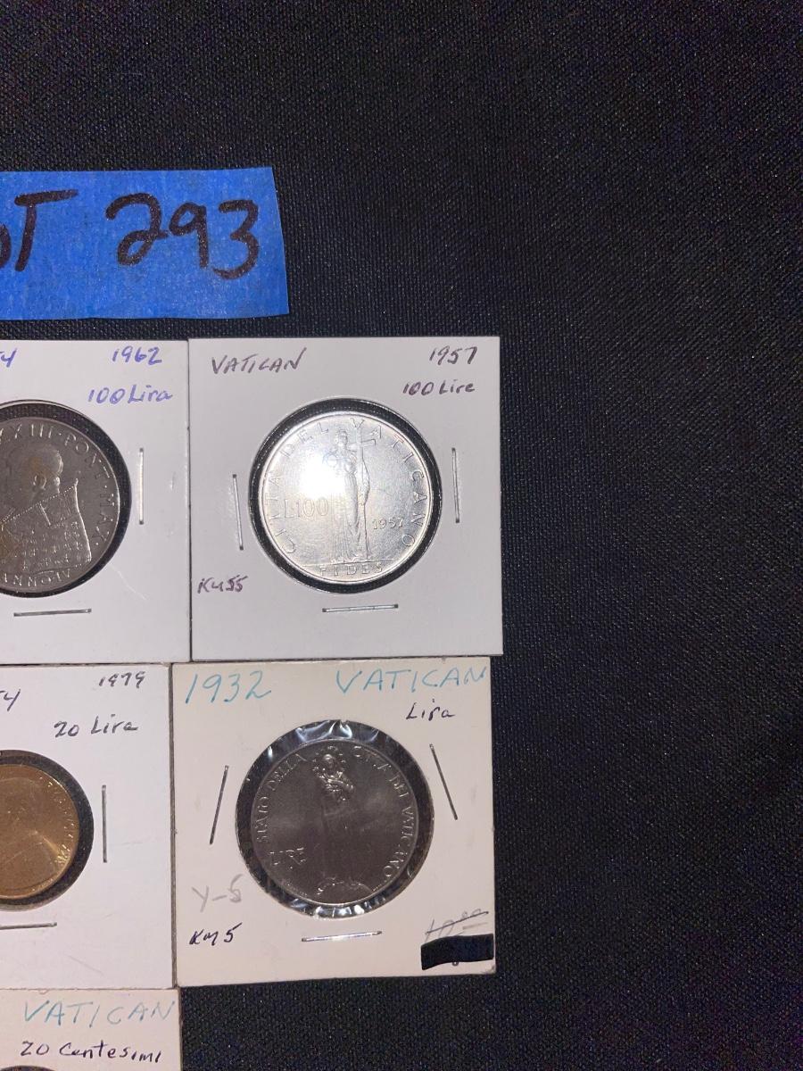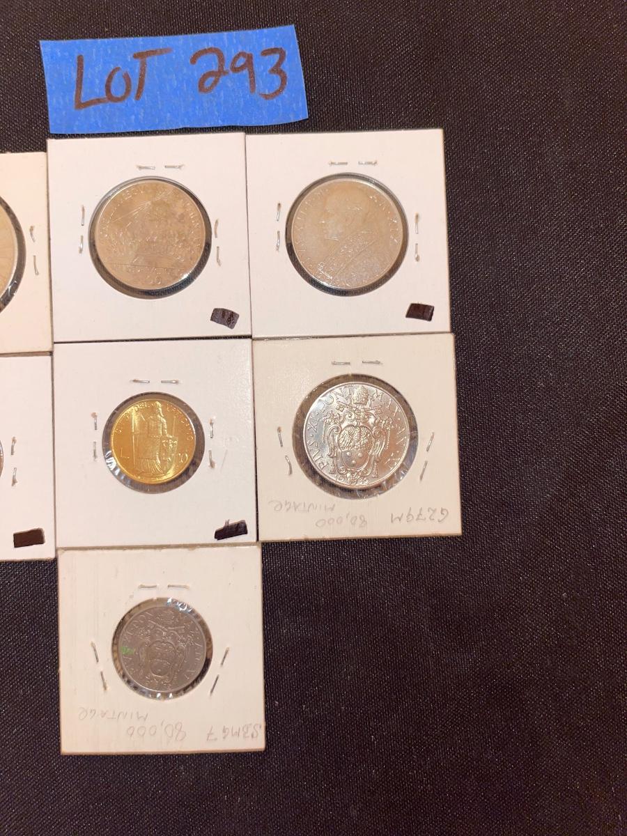 Lot of (7) vintage Italty vatican coins- Pope John Paul 2 Token, 1962 100 Lira km 73, 1957 100 lire km 55, 1977 50 lire km A121, 1979 20 lira km 144, 1932 lira km 5, 1932 20 centesimi km 3