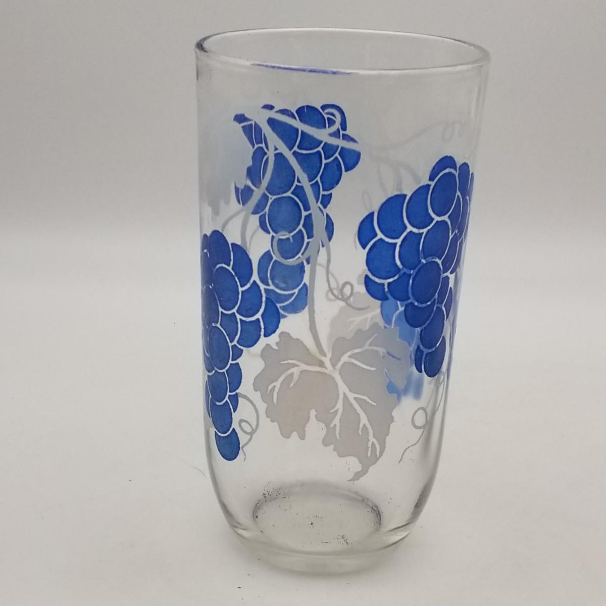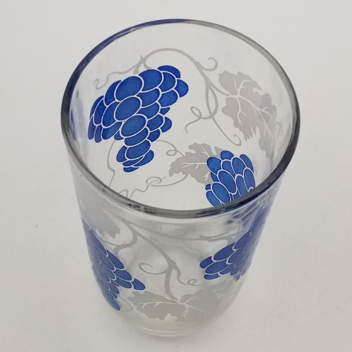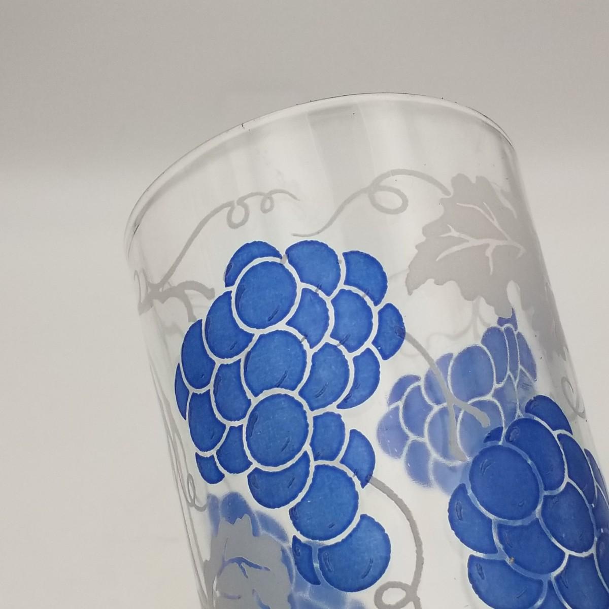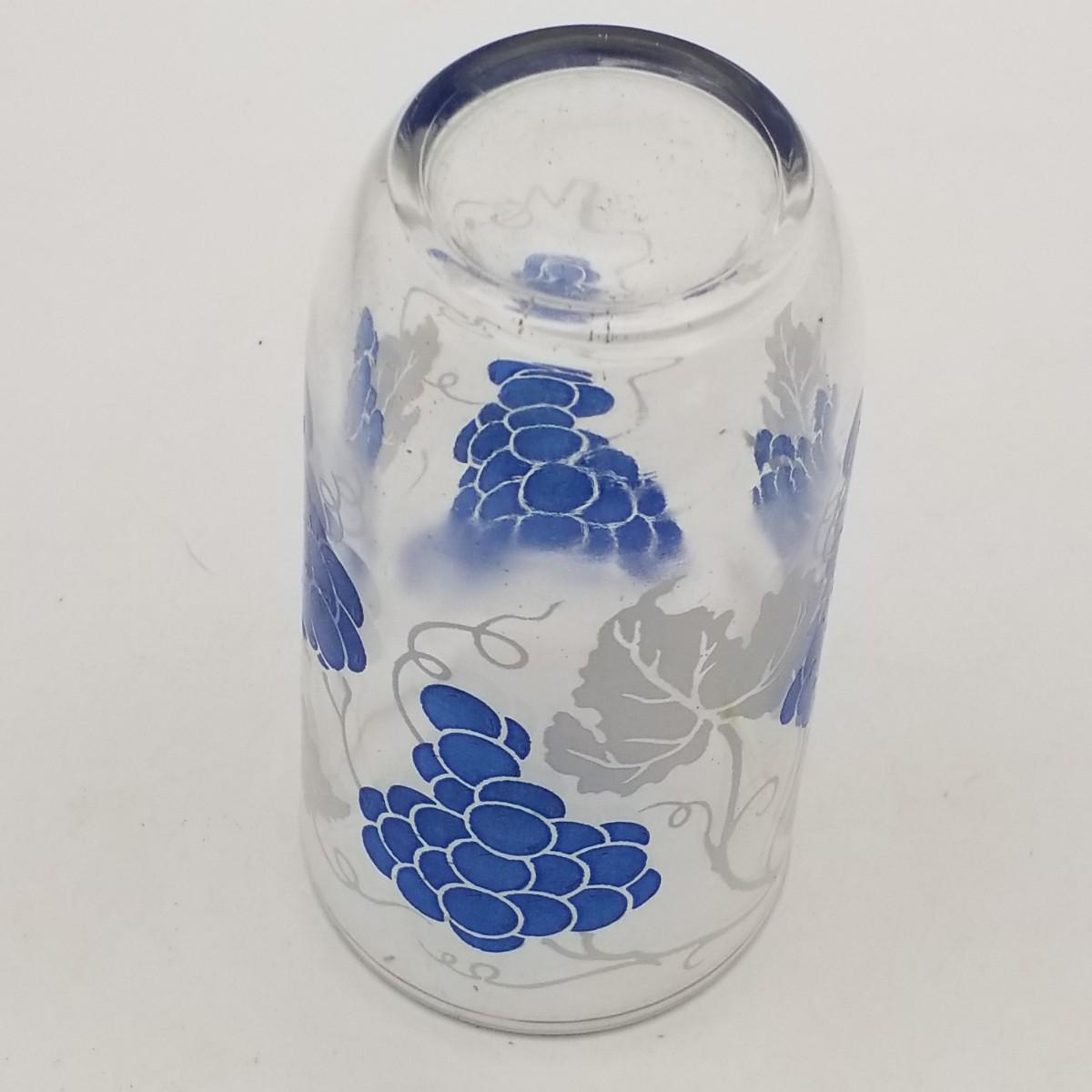 Set of 5 Clear, Blue and White Roly Poly Tumbler Glasses mid-20th Century Grape Grapevine Grape Leaves, measures approximately 2 1/2 wide x 4 3/4 inches tall.