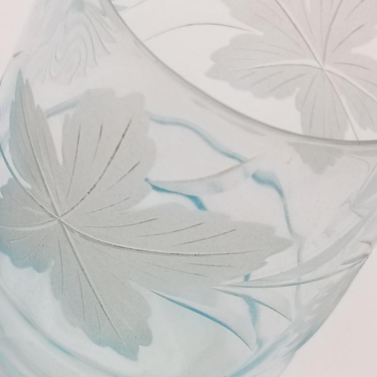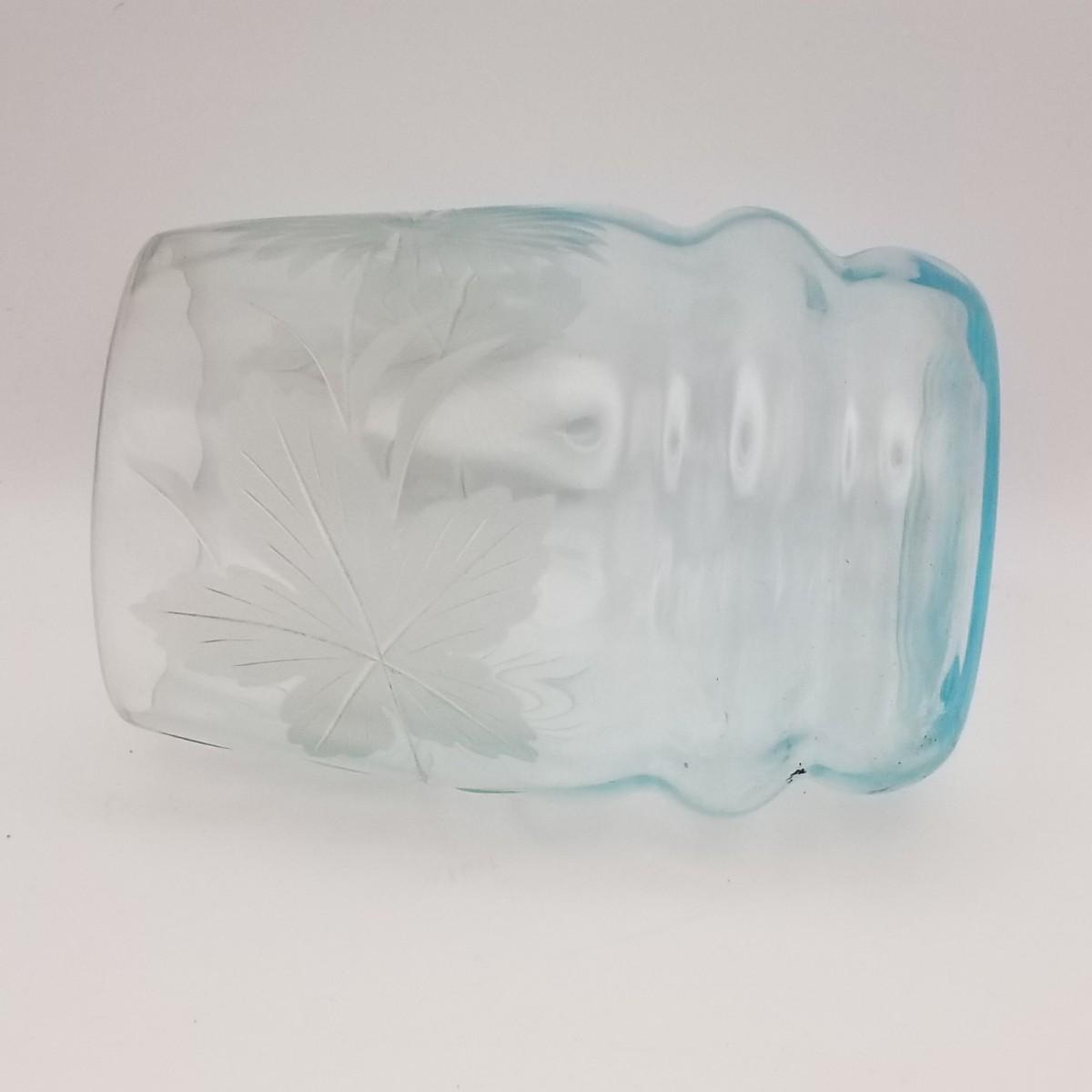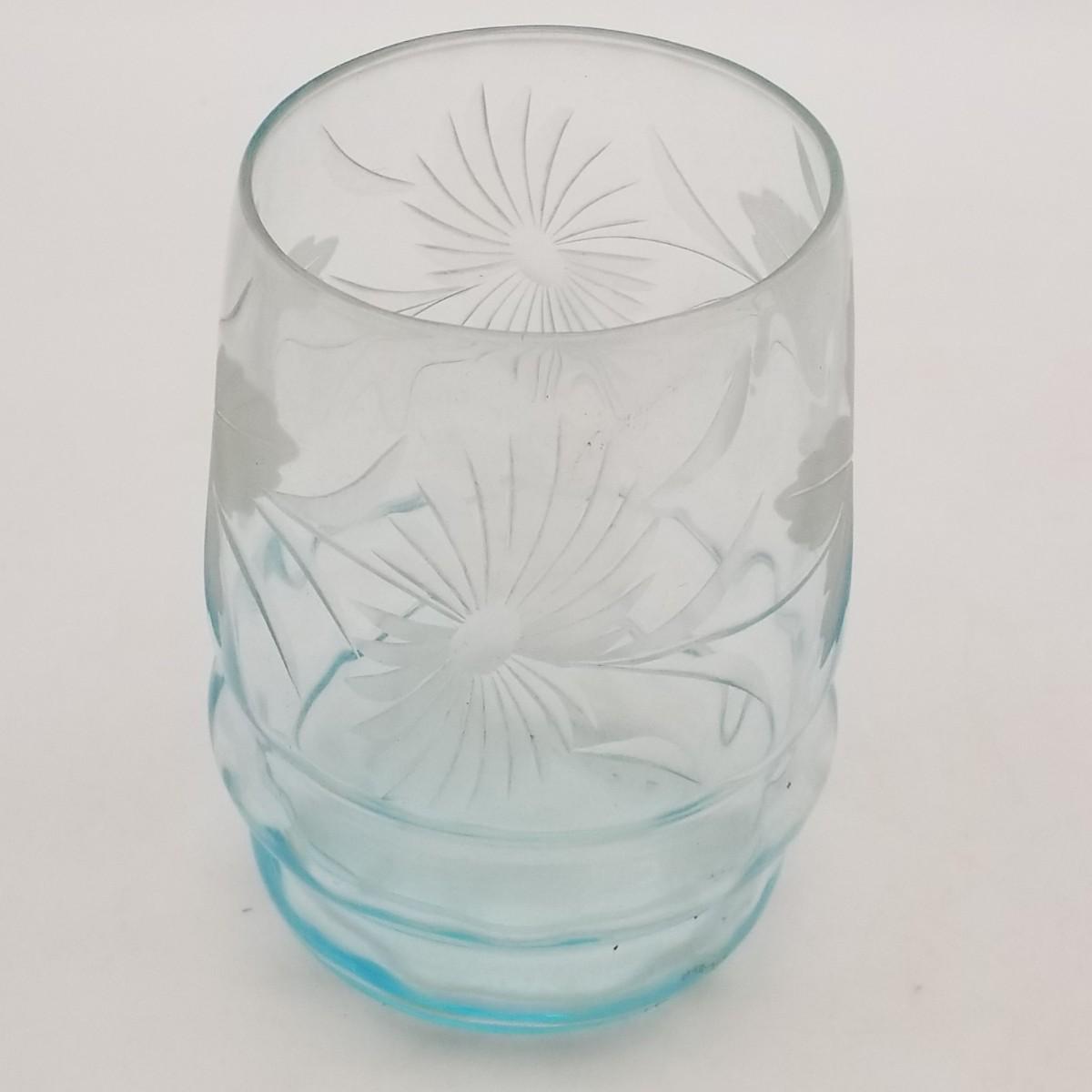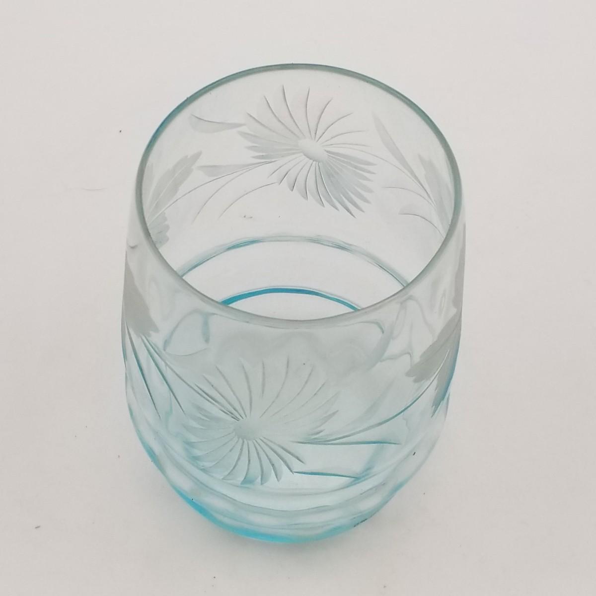 Set of 3 Translucent Blue Etched Cut Glass Tumblers Leaf Chrysanthemum Diamond Optic, measures approximately 2 1/2 wide at top rim x 4 inches tall.