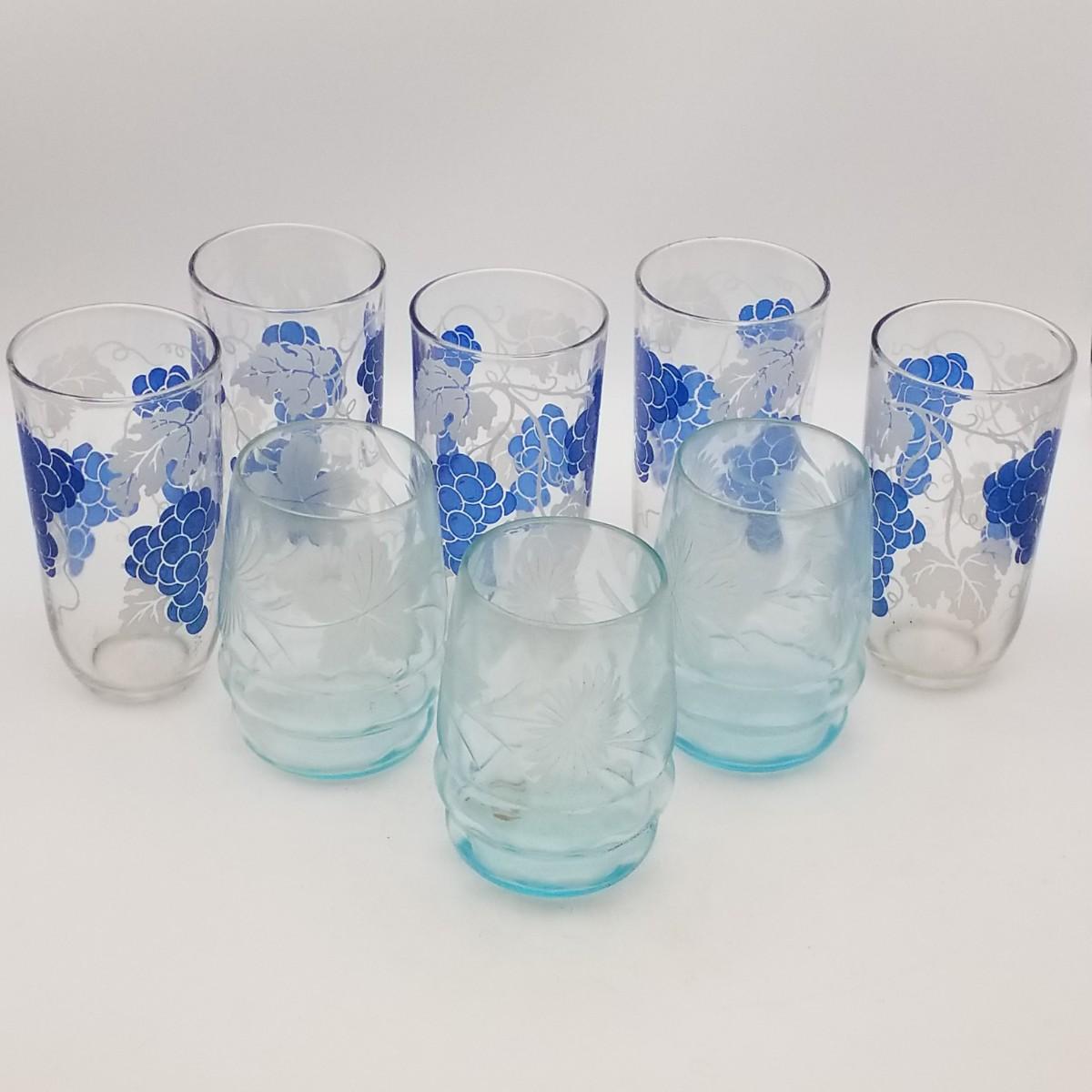 Title: Lot of 8 Vintage Glasses, No Cracks or Chips: Set of 3 Blue Etched Cut Glass Tumblers Leaf Chrysanthemum Diamond Optic, Set of 5 Roly Poly Tumbler Glasses mid-20th Century Grape Grapevine Grape Leaves