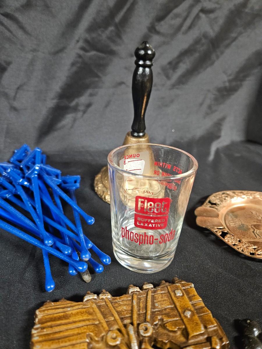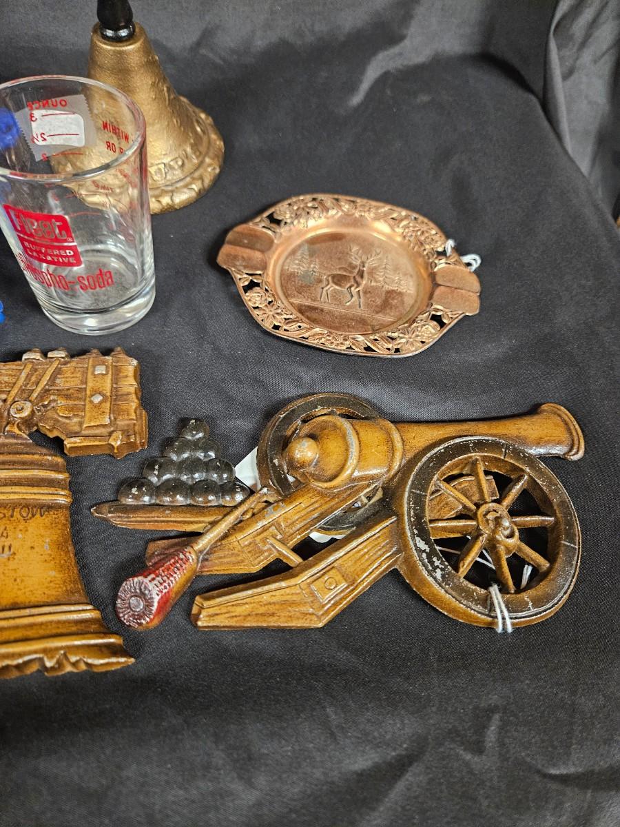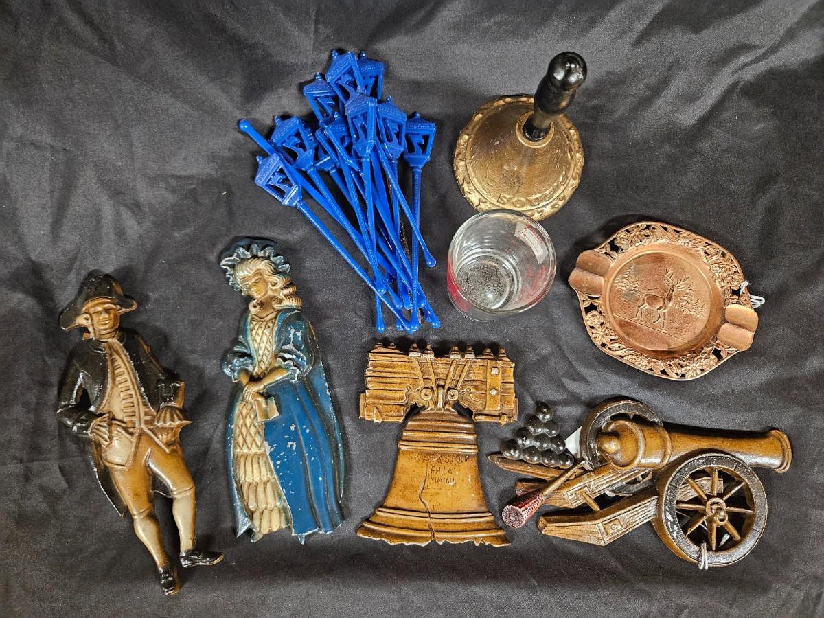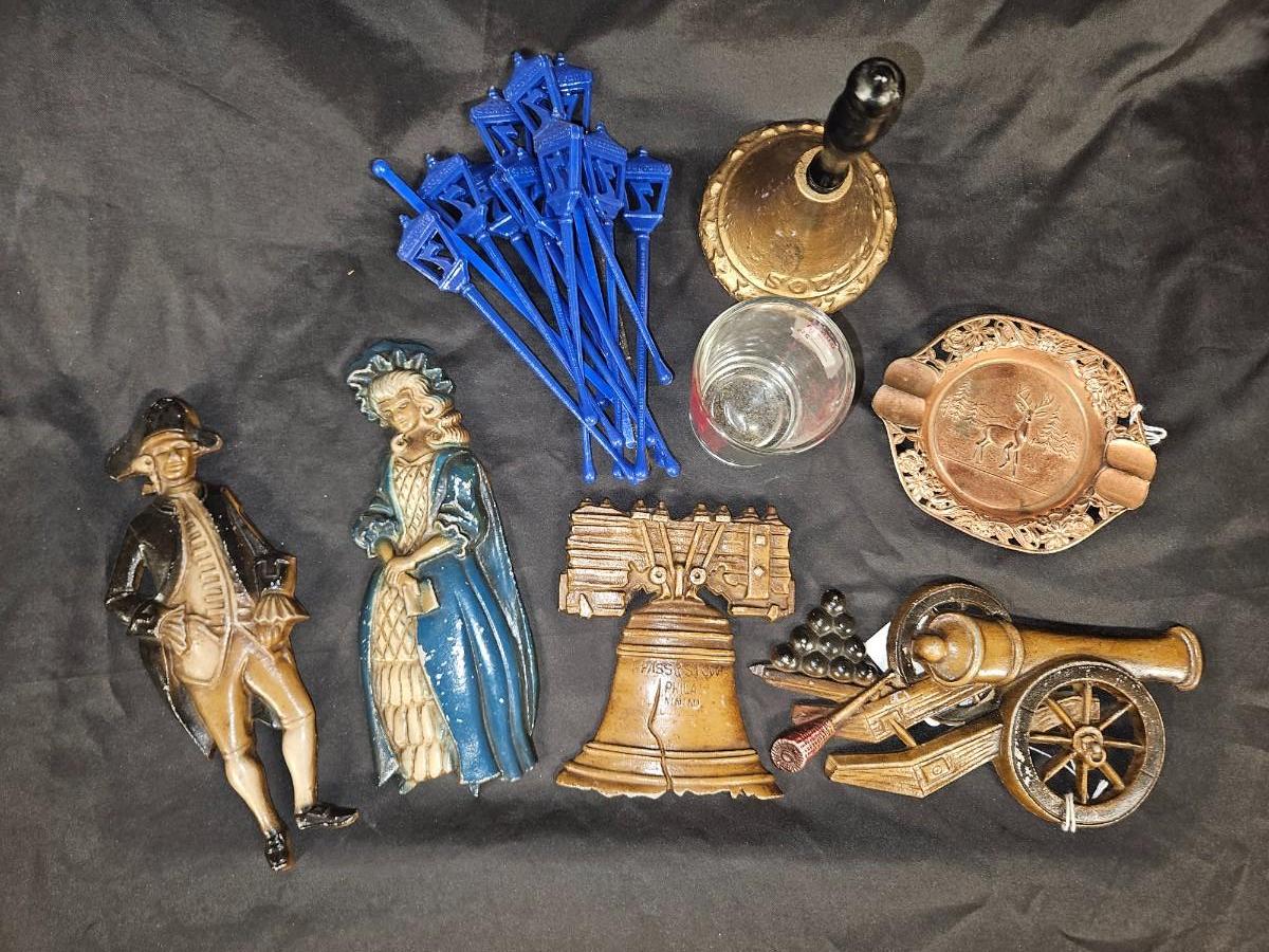 Lot of 8 Vintage Items Including Set of 4 Americana Metal Plaques, Bell, Ash Tray and MCM Drink Stirrers