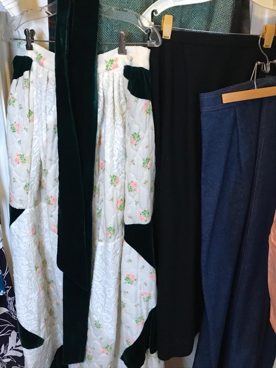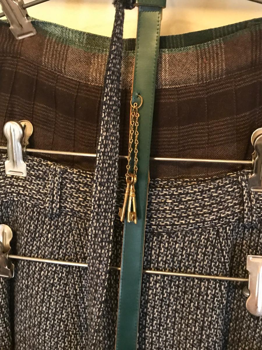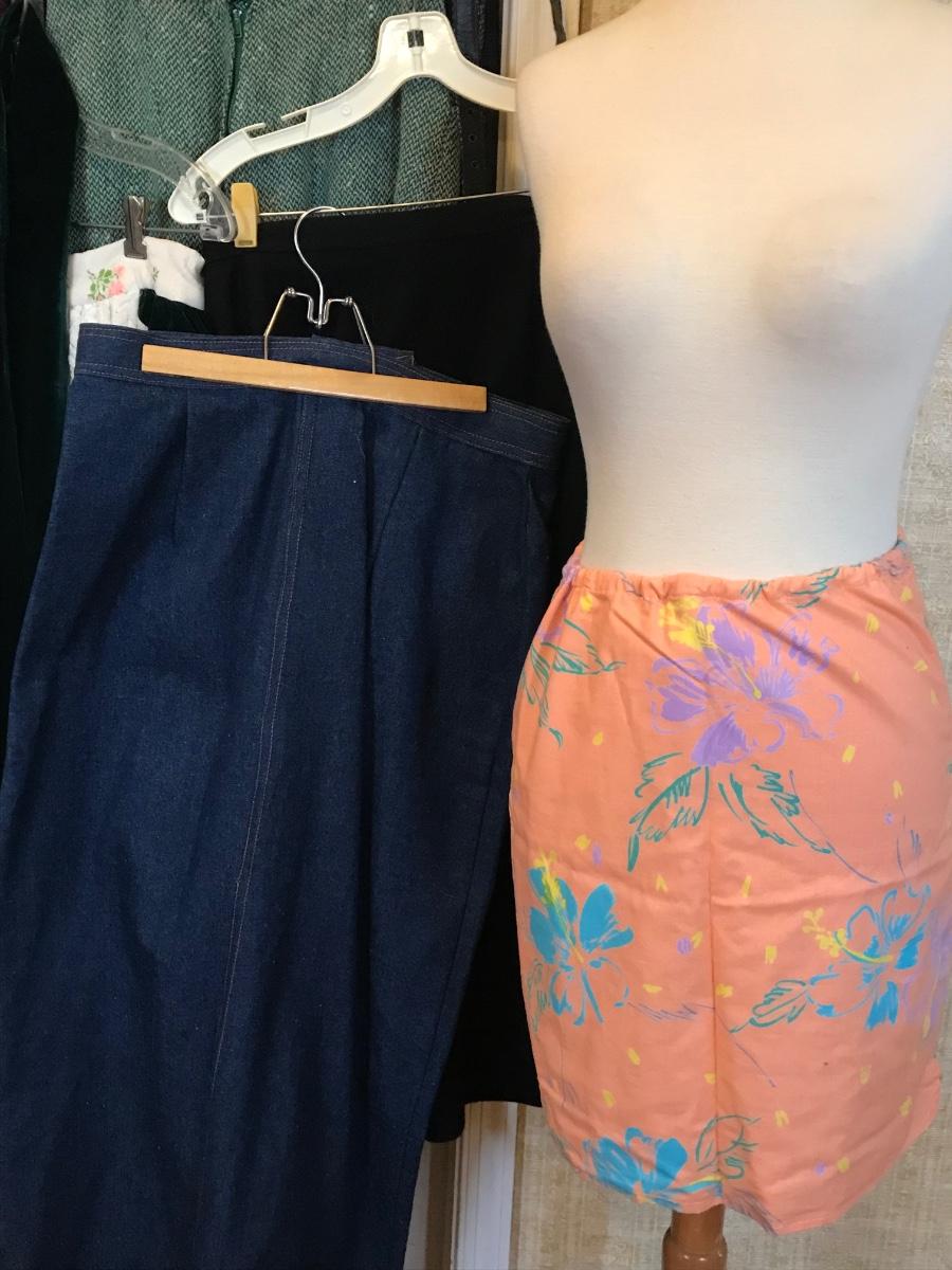 8 skirts 2 with belts and one maxi with matching green velvet sash. Denim maxi, wool A-line, cotton draw string. In good vintage condition
