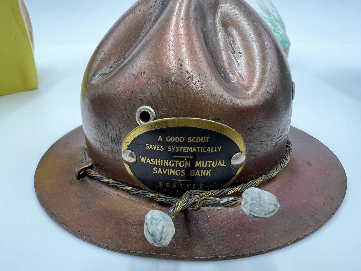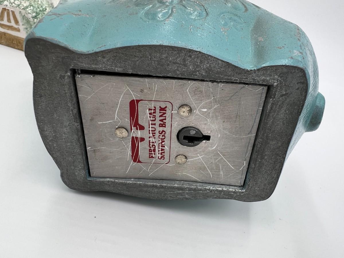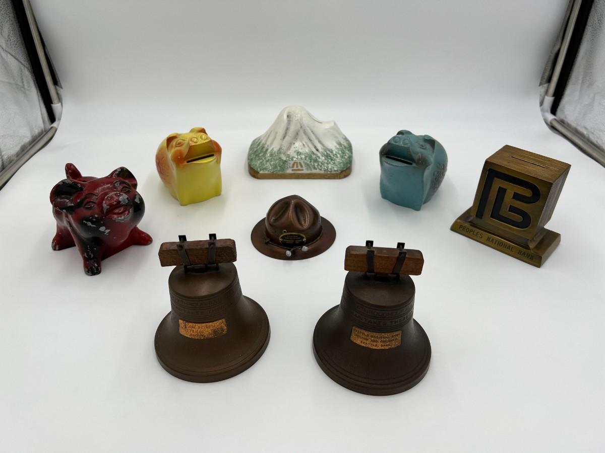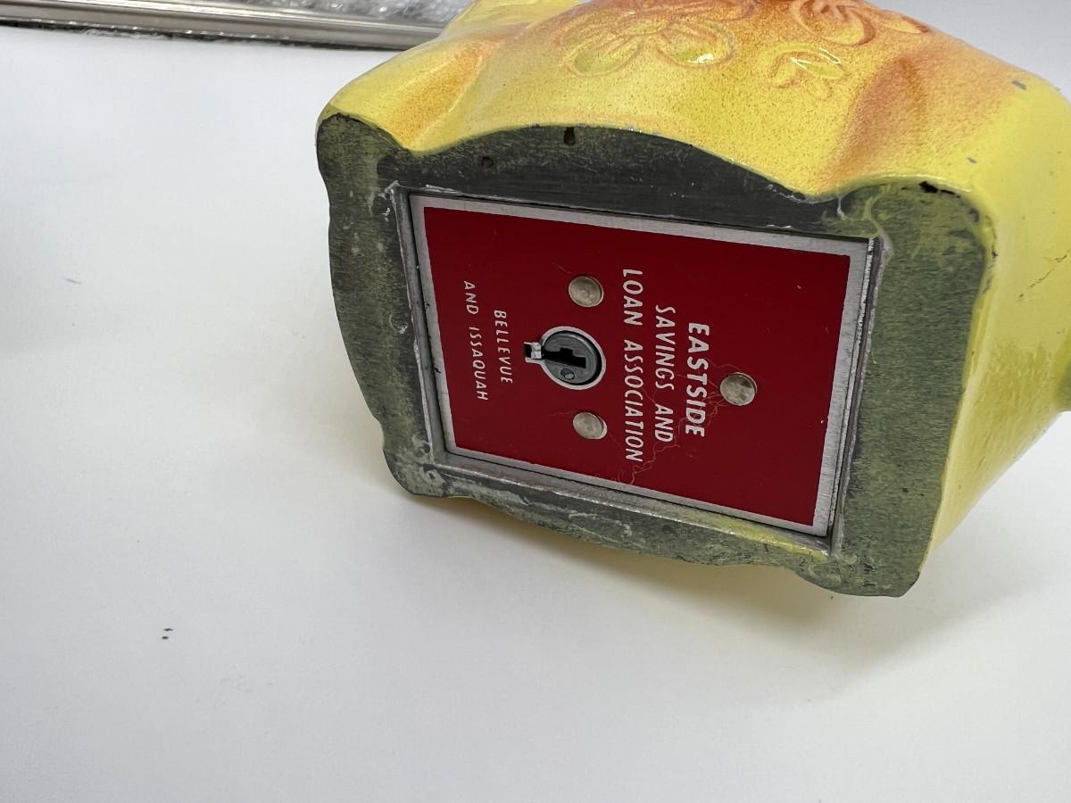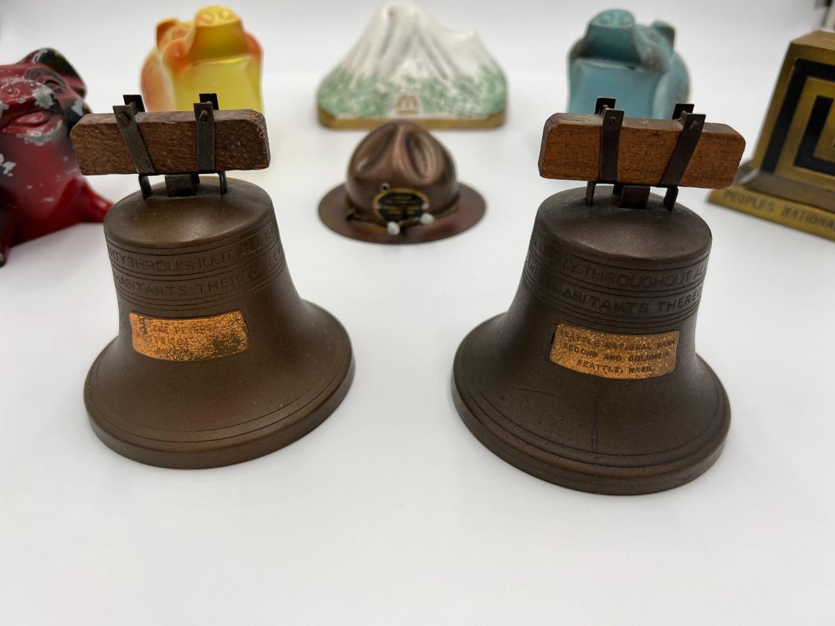Lot of Vintage Washington State Coin Banks. Conditions as shown. Coin Banks from Seattle National Bank of Seattle, Peoples National Bank, Washington Mutual Savings Bank, Baker Mutual Savings (Mt Baker Bank), Prudential Savings, First Mutual Savings, and Eastside Savings.