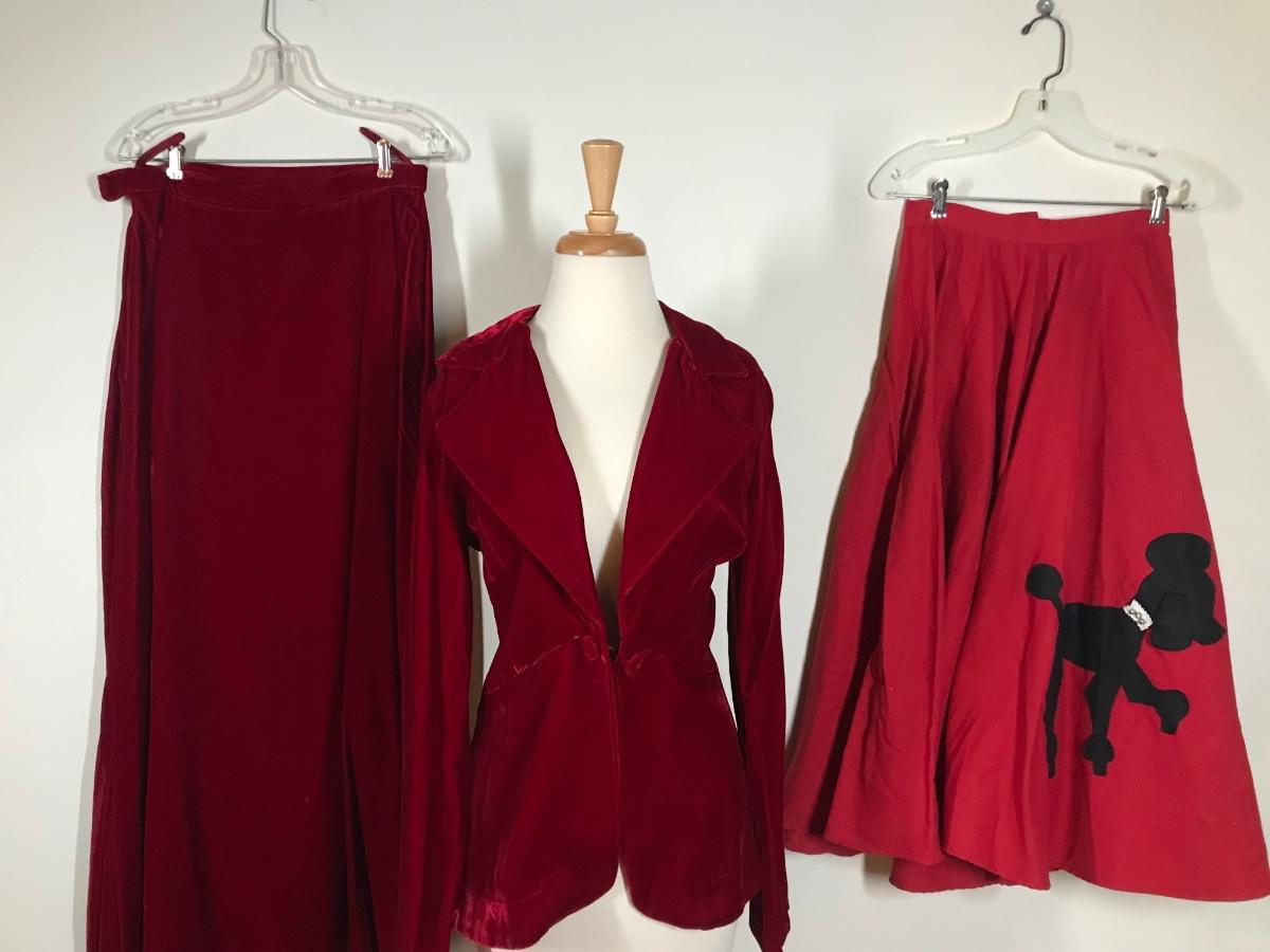 Fun lot of vintage clothes including a poodle skirt! Red velvet jacket with matching maxi skirt, shift with matching bolero, blue is a coat with matching midi swing skirt. I’m great vintage condition. Sizes small - large