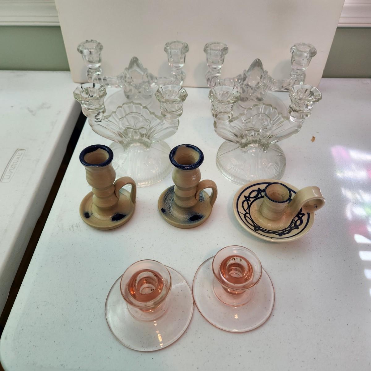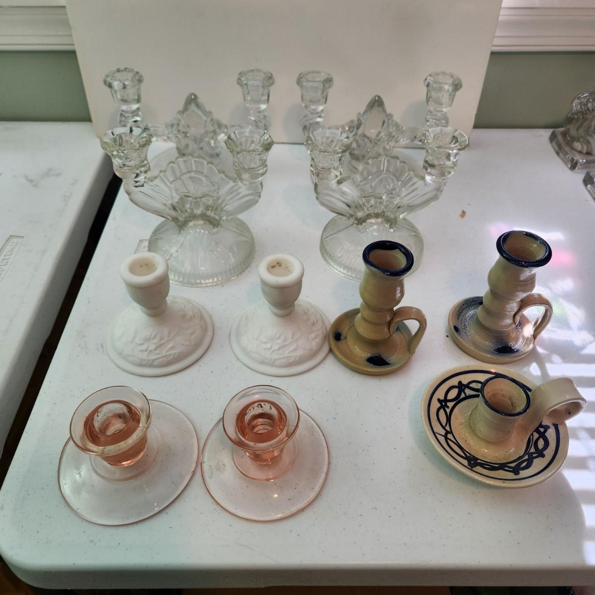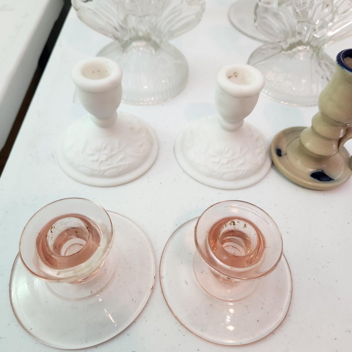Lot of 9 Candle Holders , Jamestown Pottery, Pink Glass, Milk Glass, 2 Sets of Clear Glass Double Candle holders, Etched Glass