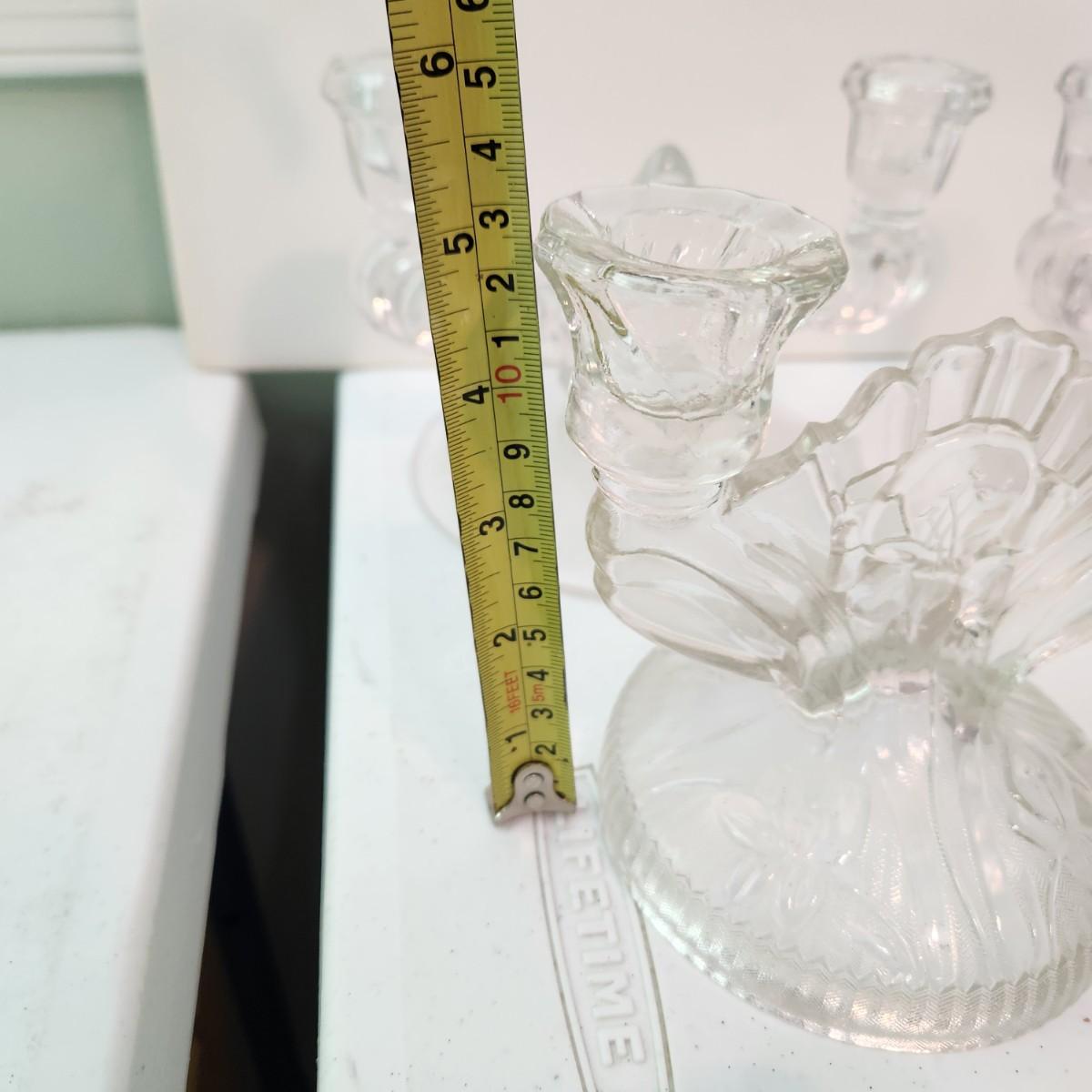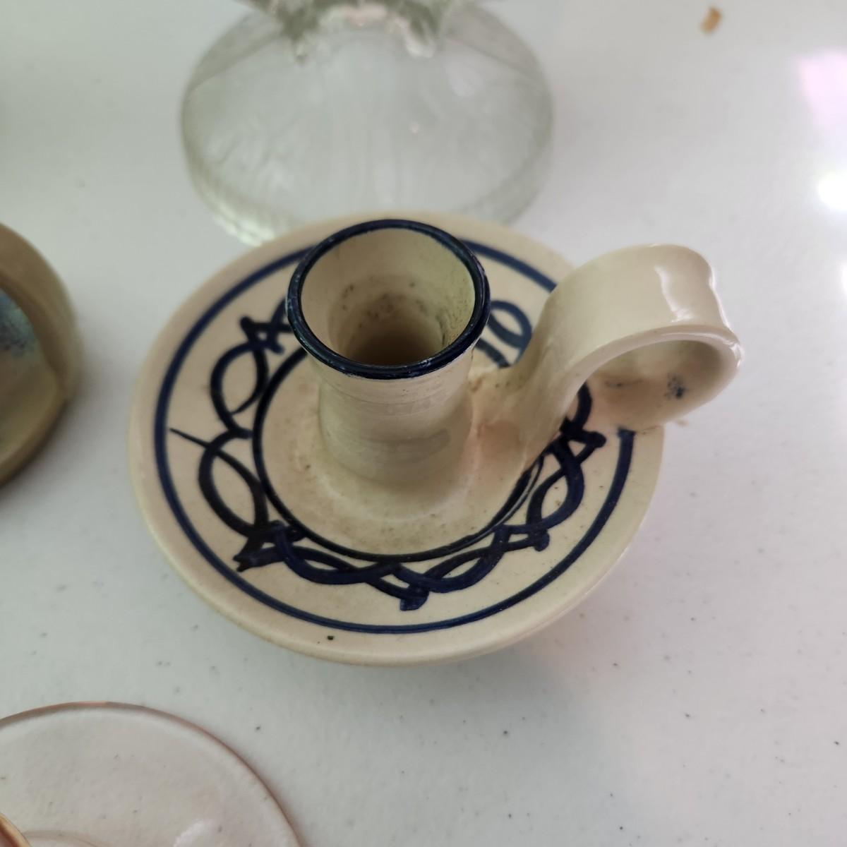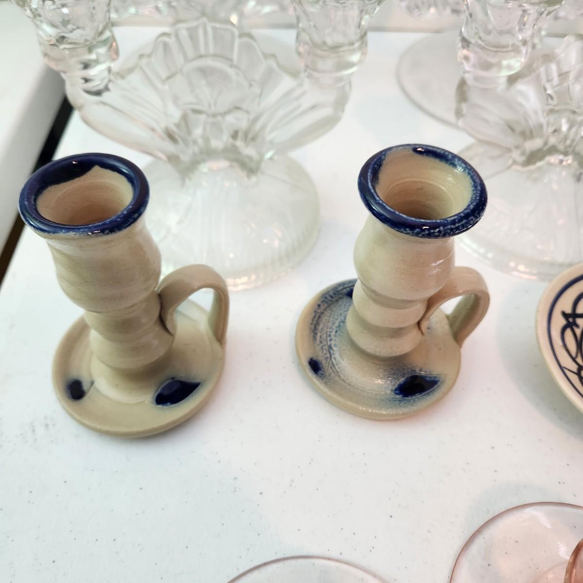 Lot of 9 Candle Holders , Jamestown Pottery, Pink Glass, Milk Glass, 2 Sets of Clear Glass Double Candle holders, Etched Glass