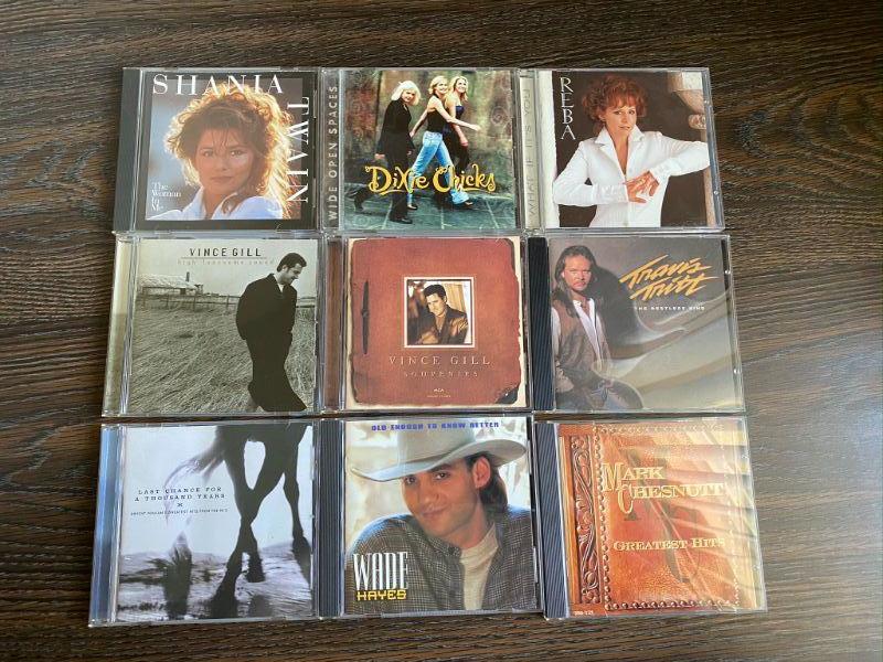 9 Country Music CDs. Great mix of artists. Included are Shania Twain, Dixie Chicks, Reba, Vince Gill (2), Travis Tritt, Dwight Yoakam, Wade Hayes, and Mark Chesnutt. All CDs are in great condition.