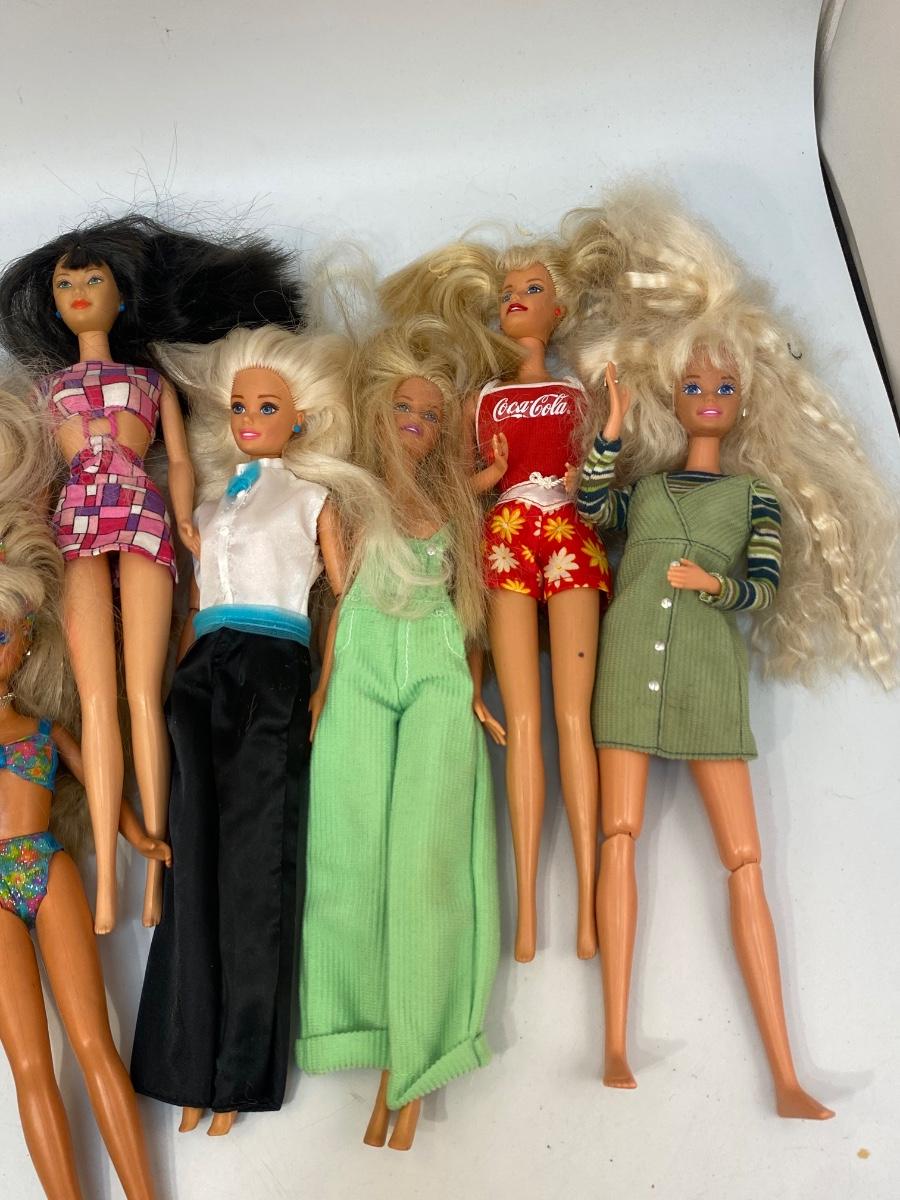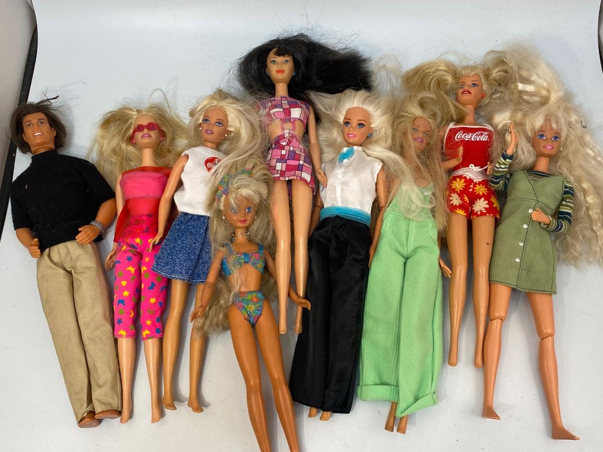 Lot of 9 Dressed Barbie Ken Skipper Fashion Dolls. Played with conditions.