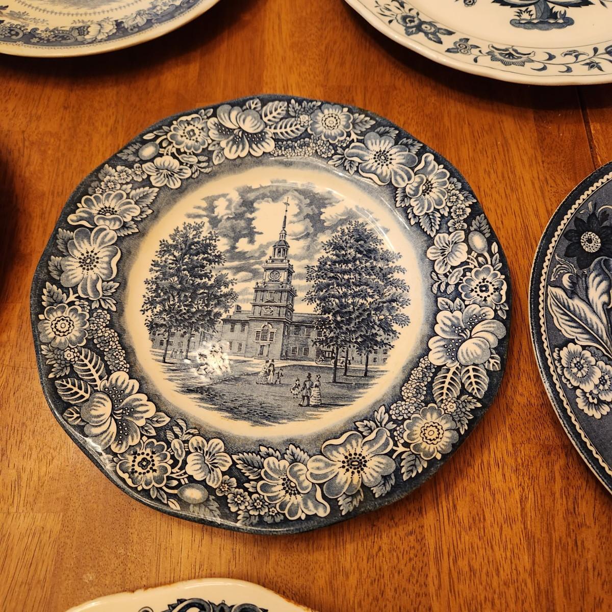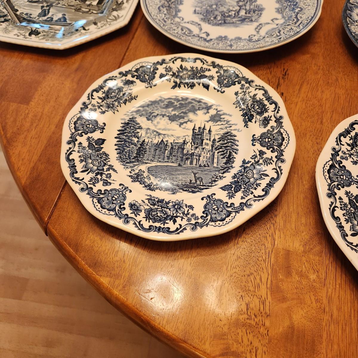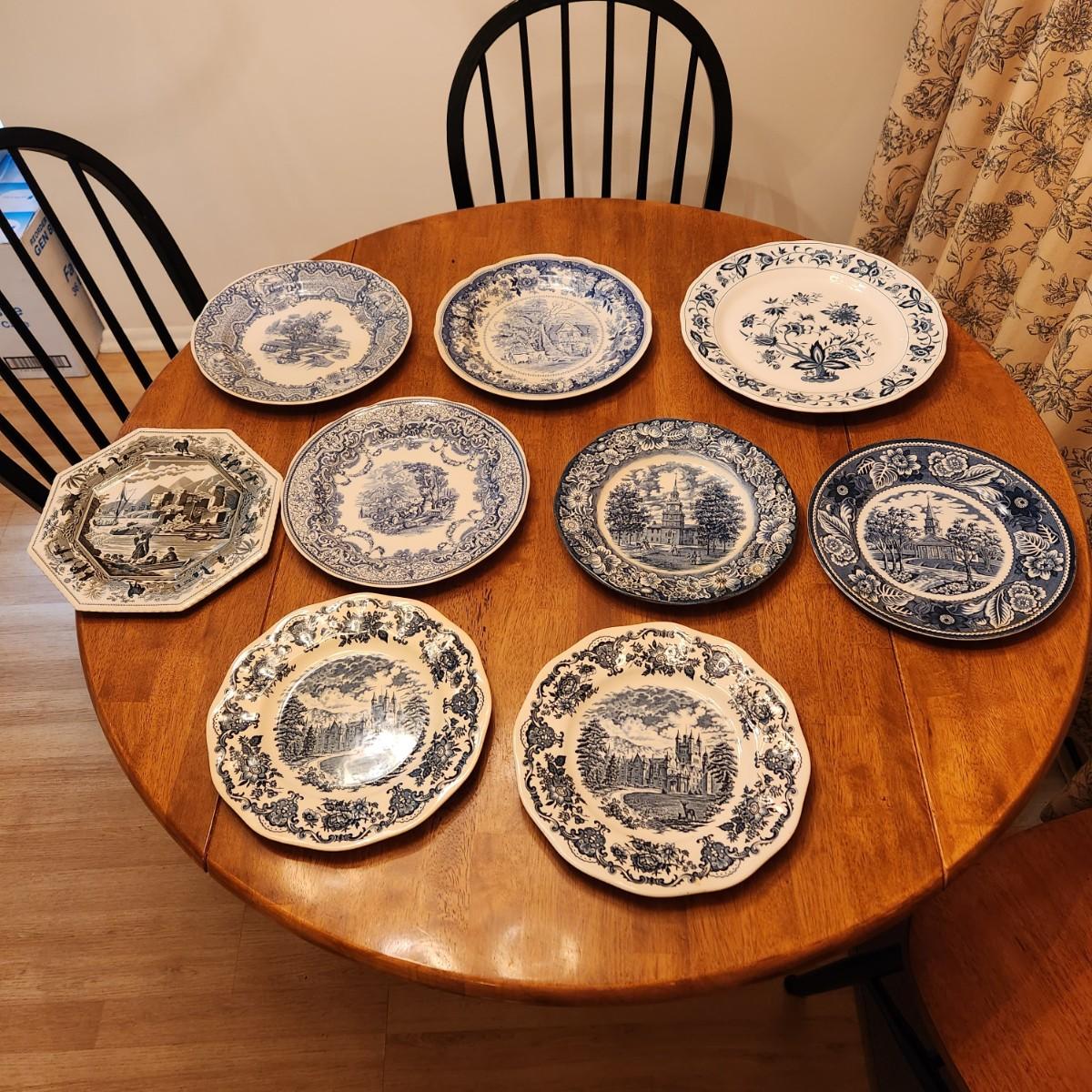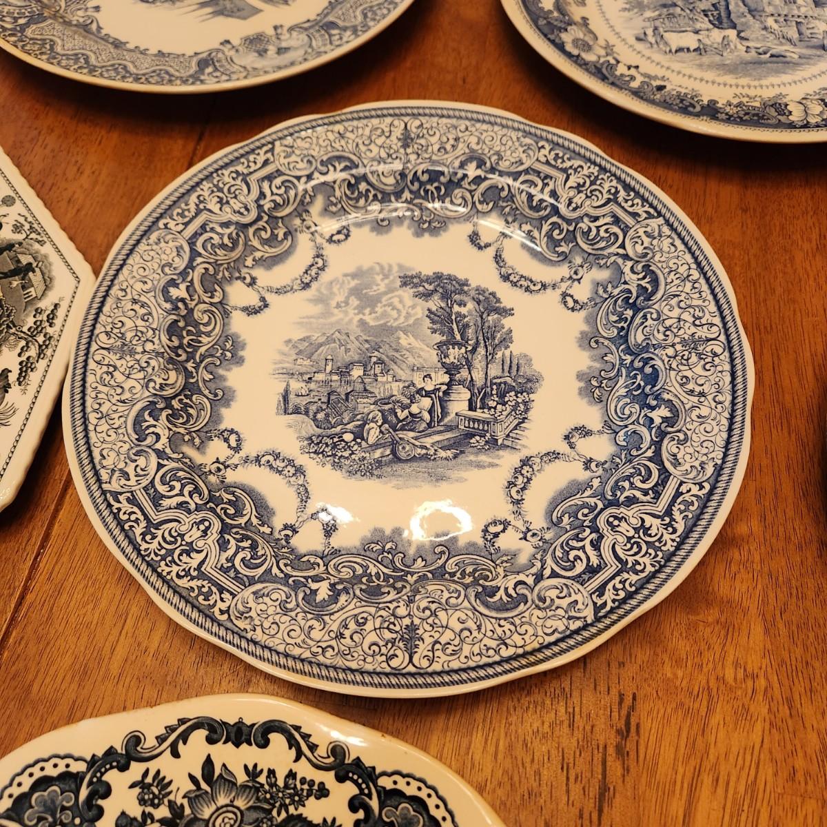 Lot of 9 Flow Blue Plates Spode, Blue Bonnet, Wedgwood, Liberty Blue