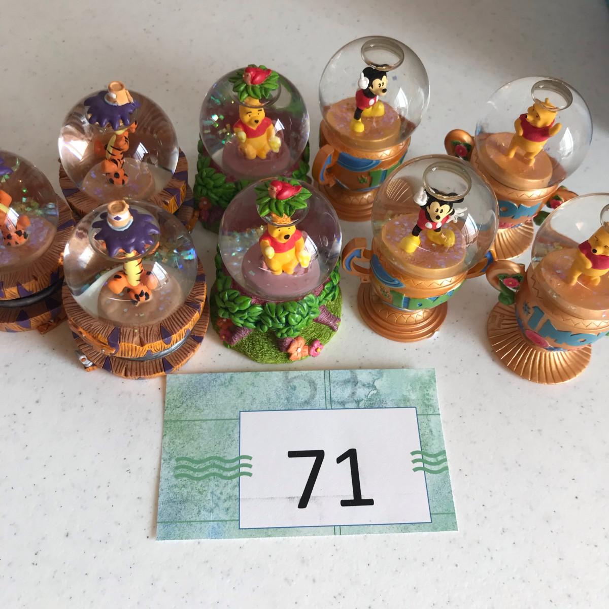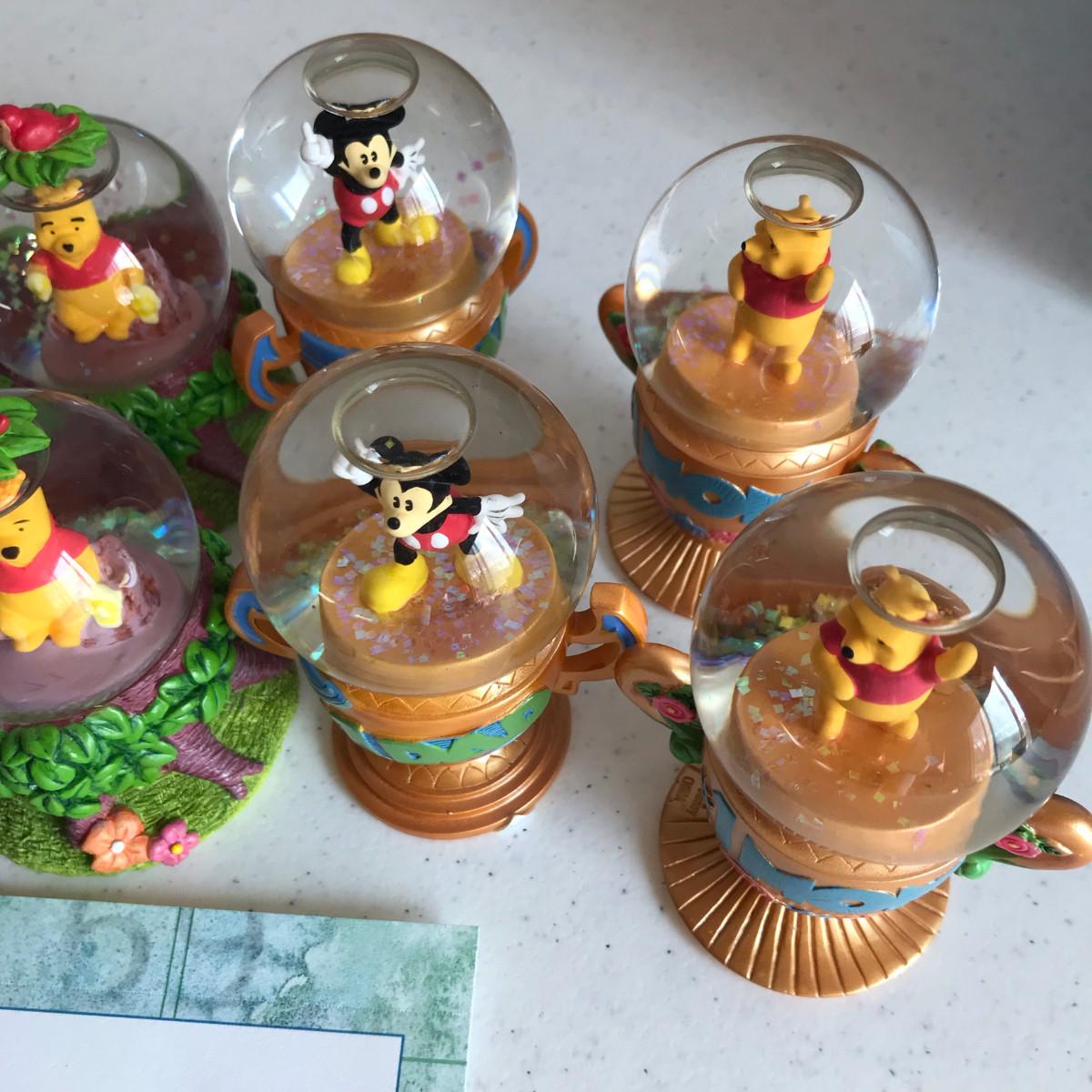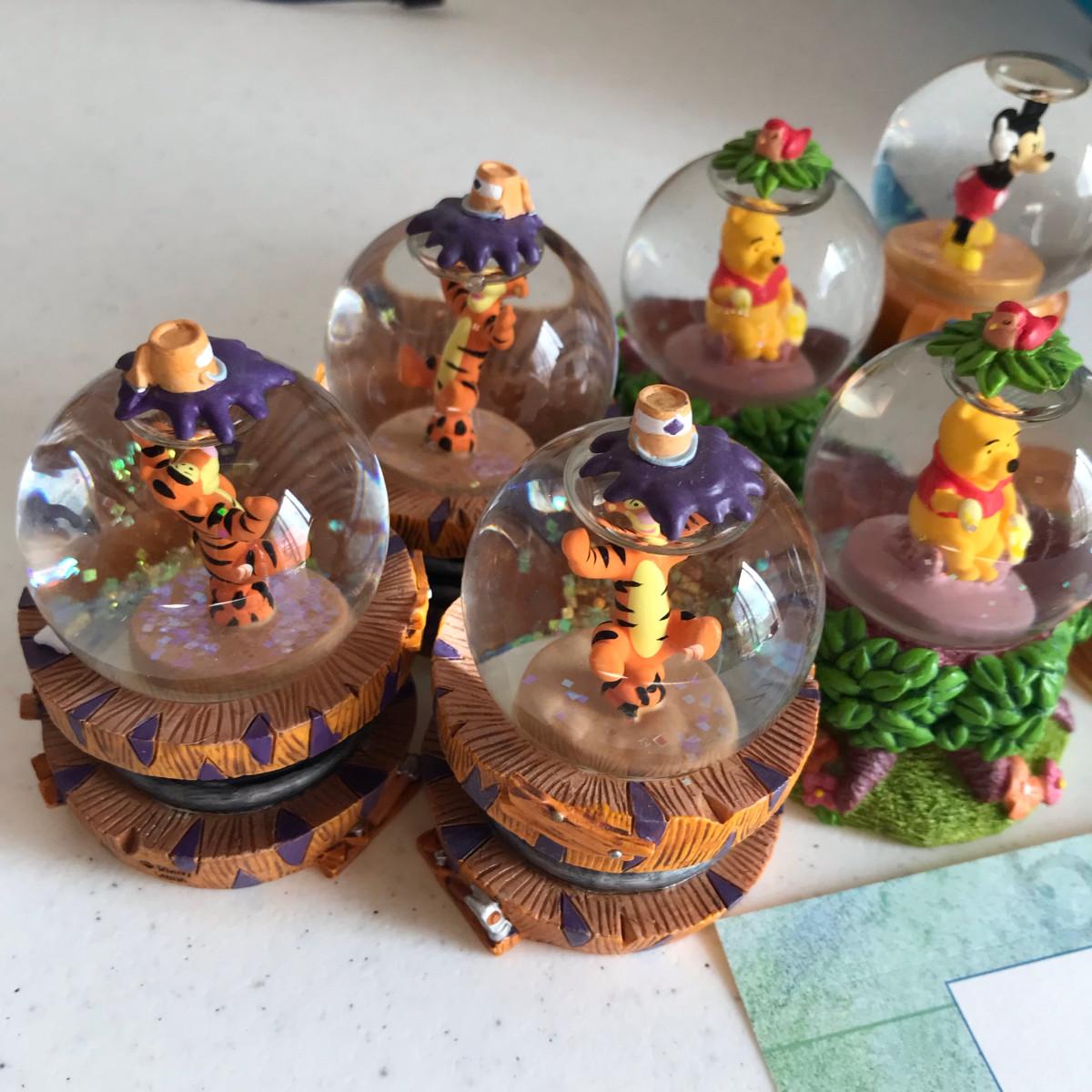 You are getting 9 mini snow globes that sold at the Disney Store. These are in new condition and came out of the shipping box. No boxes with them. They sold new for $10 each.