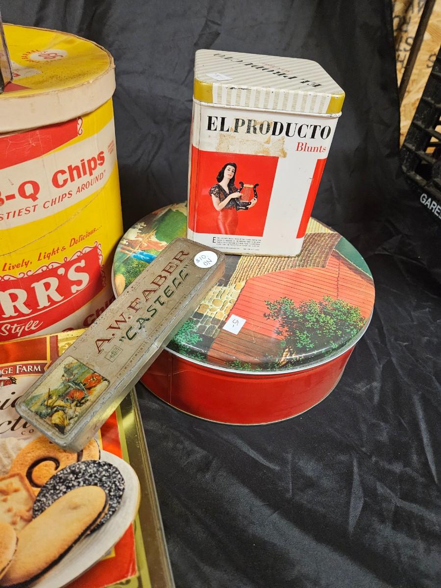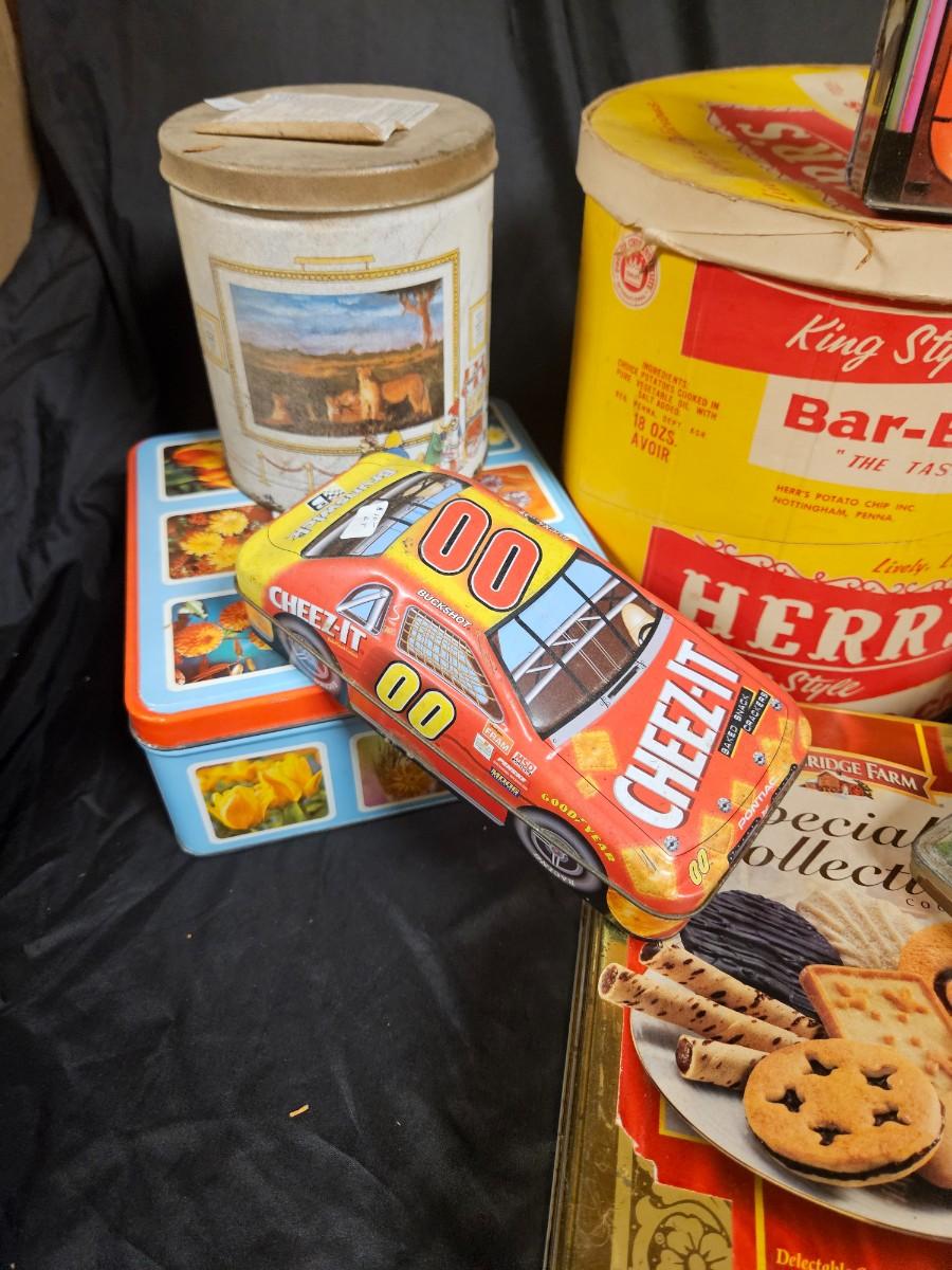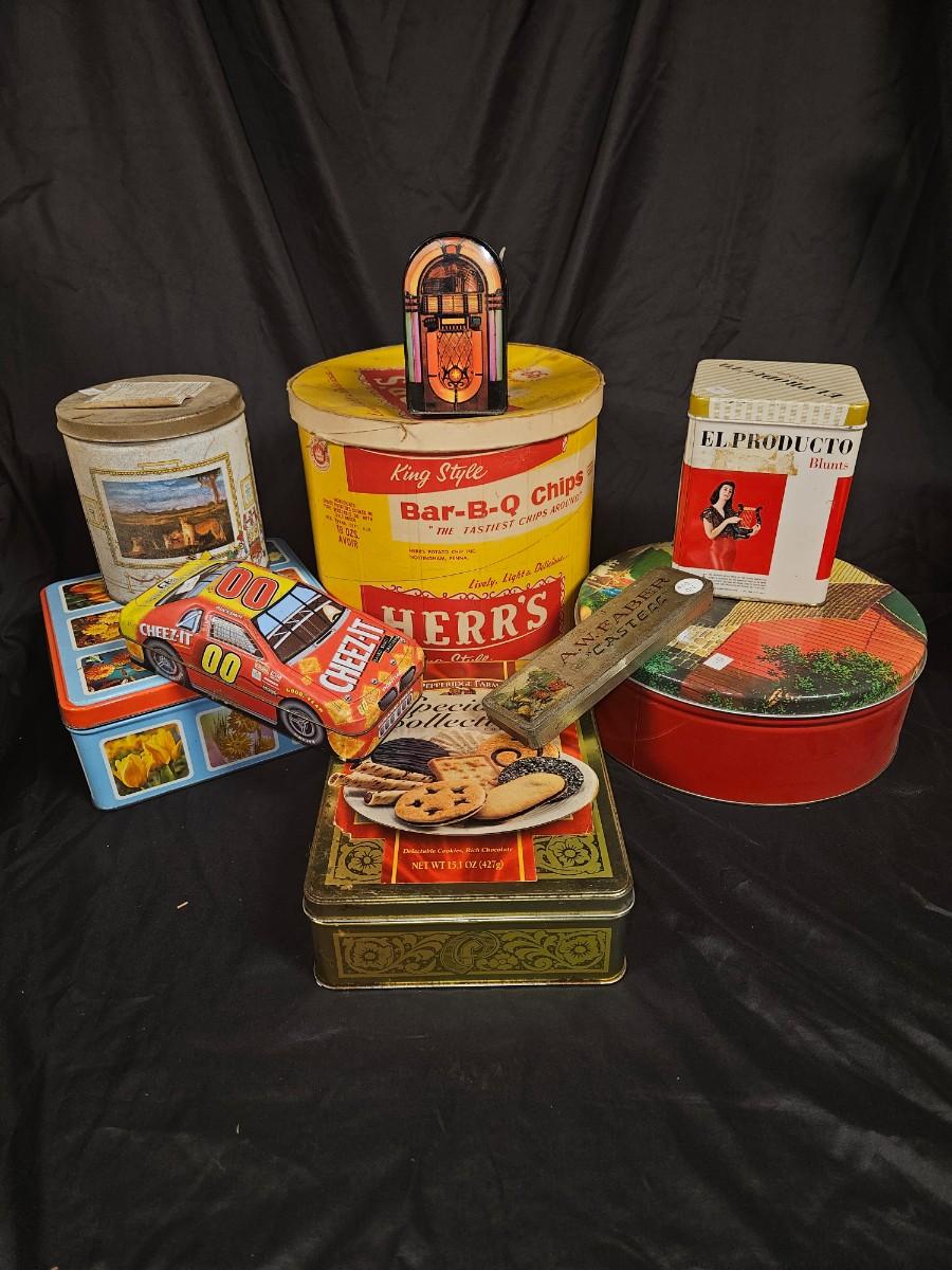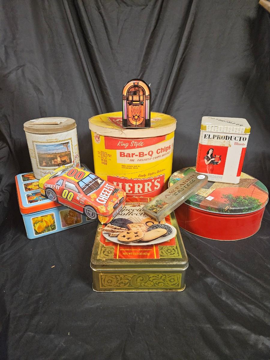 Vintage tins of different styles including cookies, cigars, Cheezit, a Juke Box bank and a Herrs Cardboard BBQ chip container.