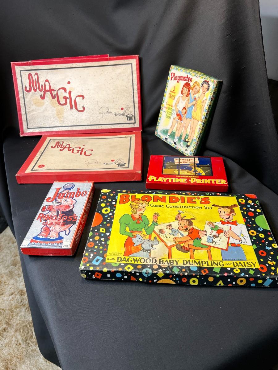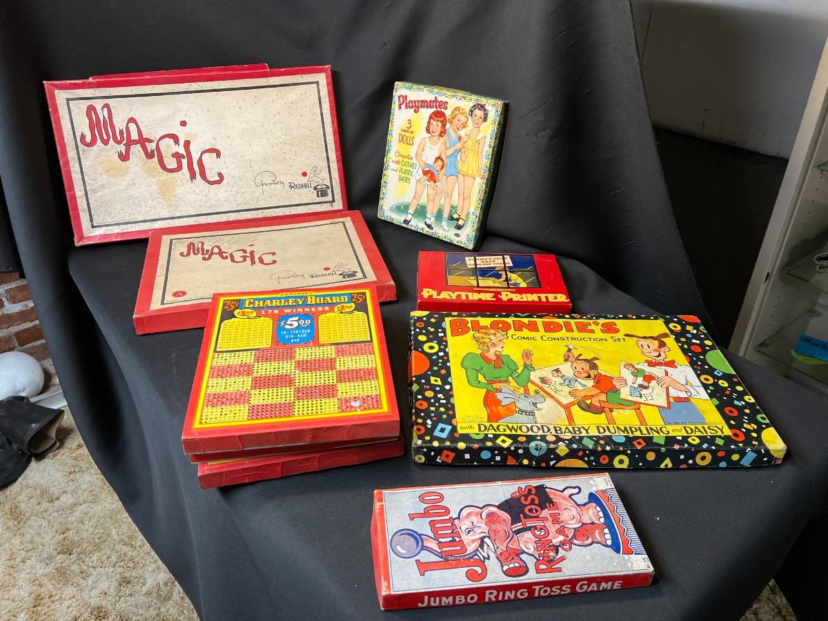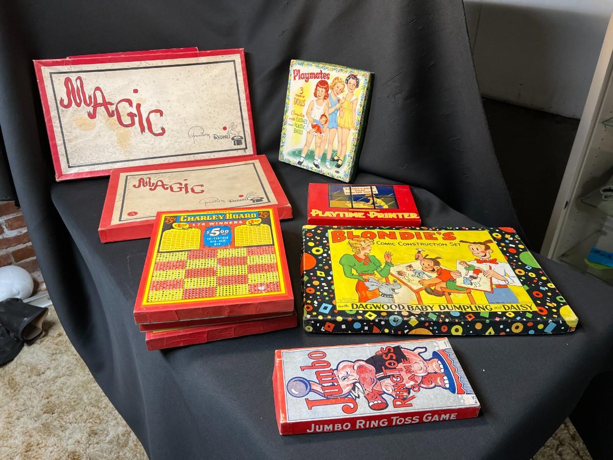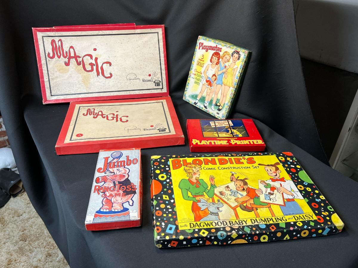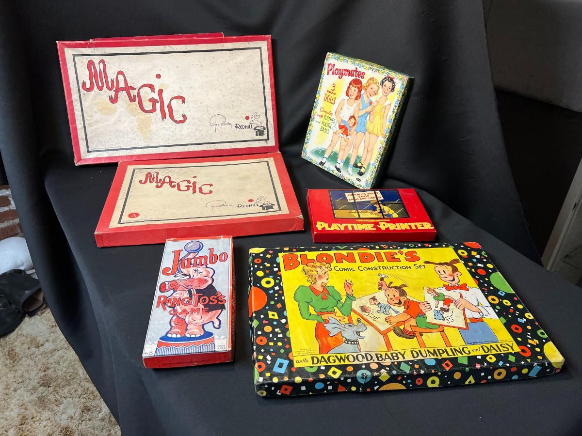Lot of 9 Vintage Boxed Toy Games. Includes rare antique Redhill Magicians Toy Set (2), Tommy's Playtime Printer, Charley Board (3), Jumbo Ringtoss, 1950s Whitman Playmates Paper Dolls, Blondie's Comic Construction Play Set. Condition as shown.