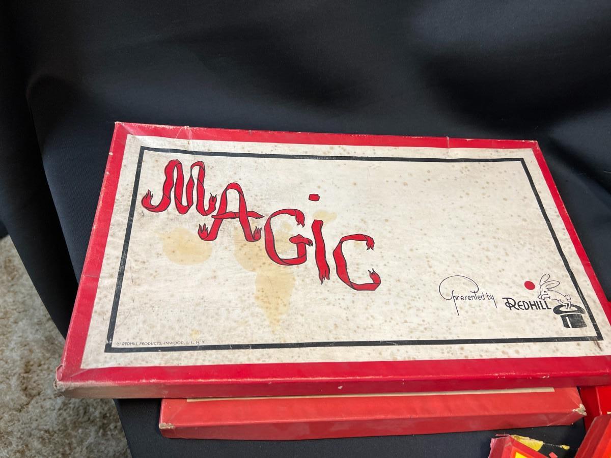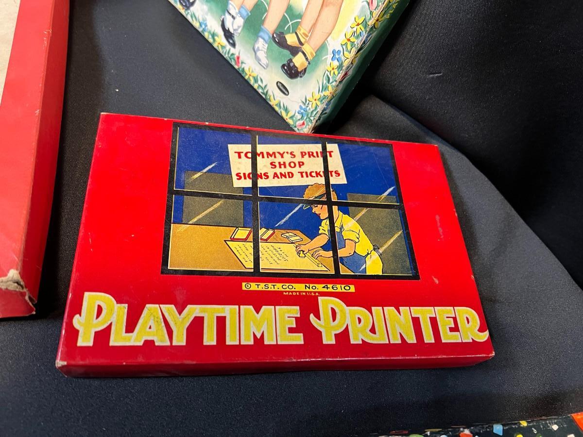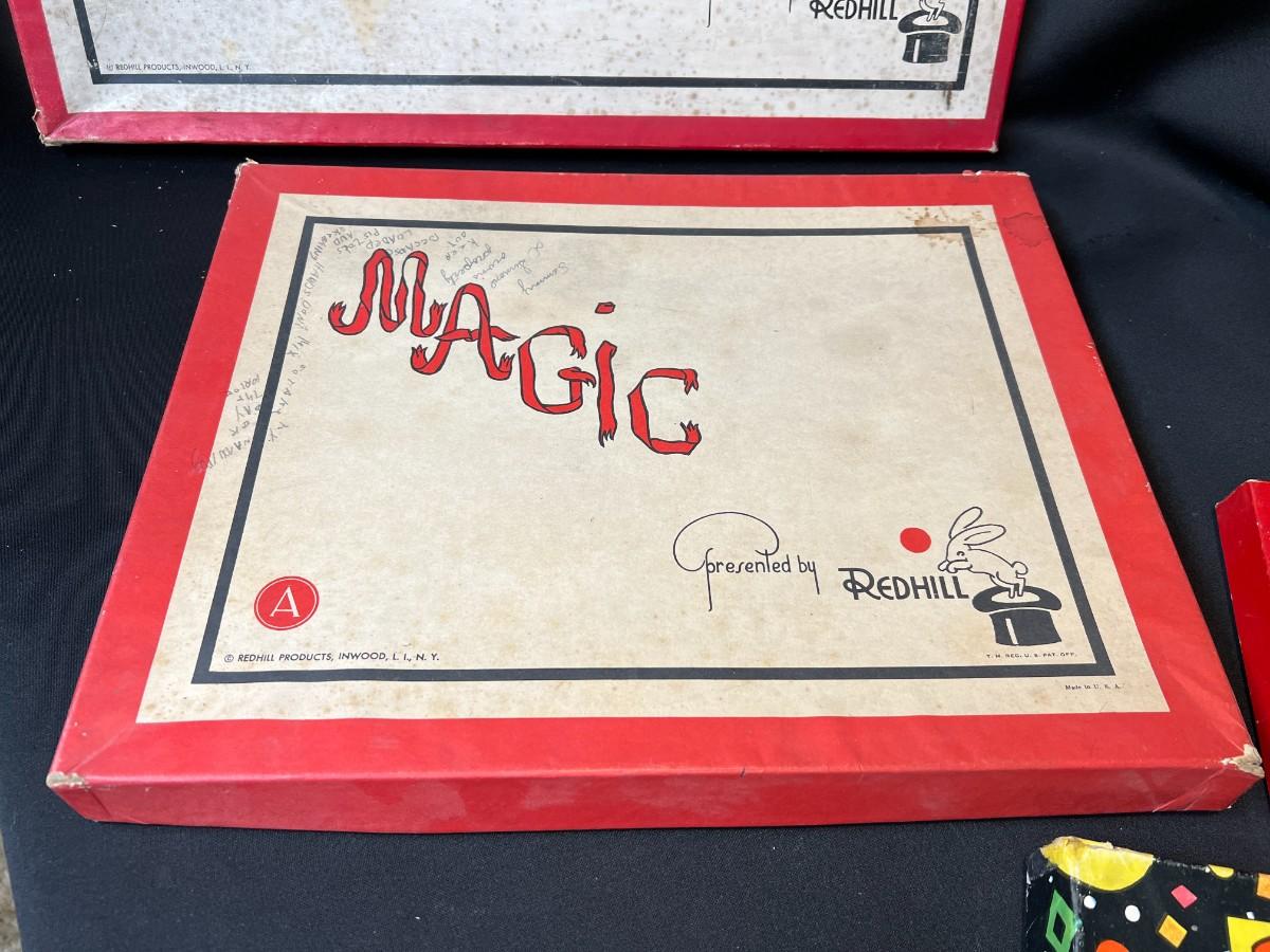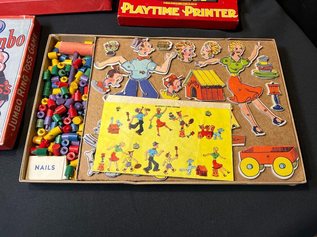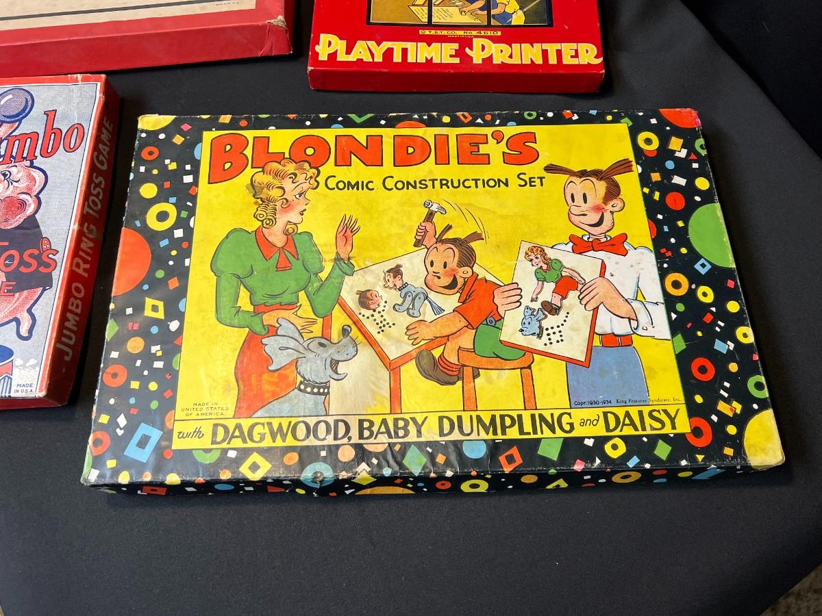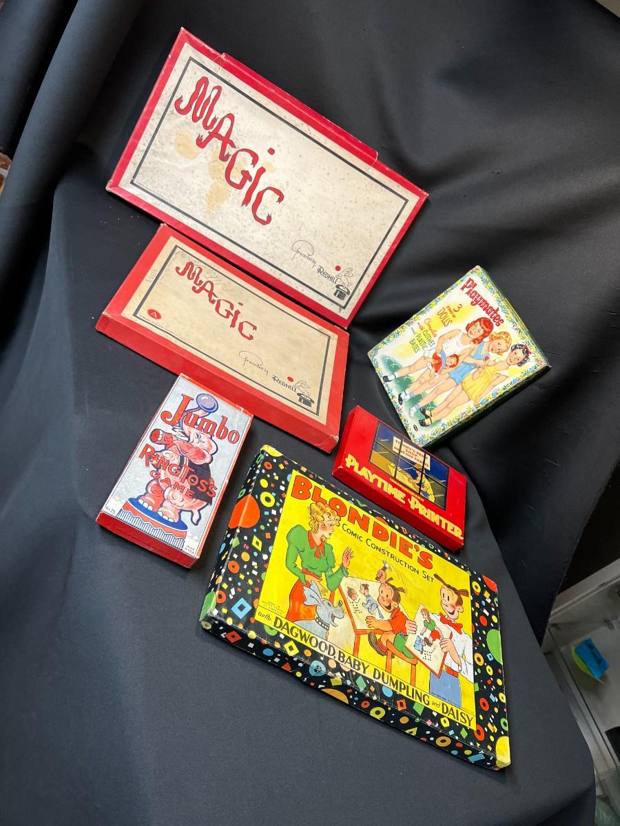 Lot of 9 Vintage Boxed Toy Games. Includes rare antique Redhill Magicians Toy Set (2), Tommy's Playtime Printer, Charley Board (3), Jumbo Ringtoss, 1950s Whitman Playmates Paper Dolls, Blondie's Comic Construction Play Set. Condition as shown.
