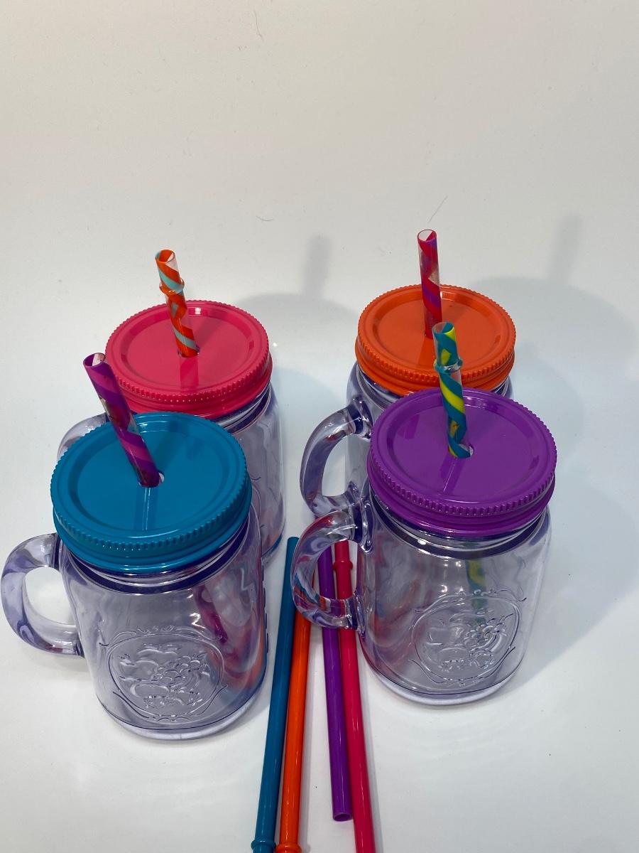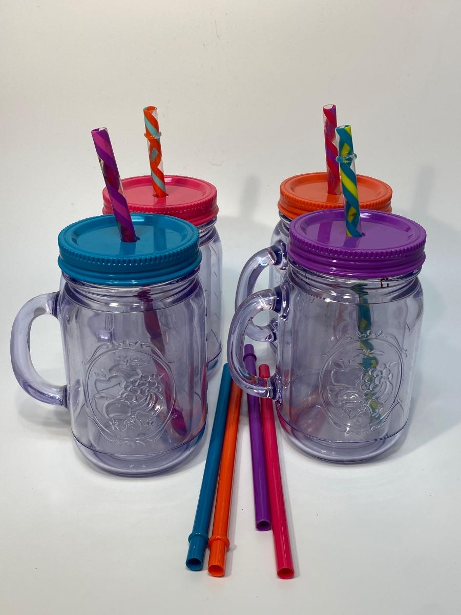 Lot of Aladdin Plastic Mason Jars with Multicolored Lids & Plastic Straws