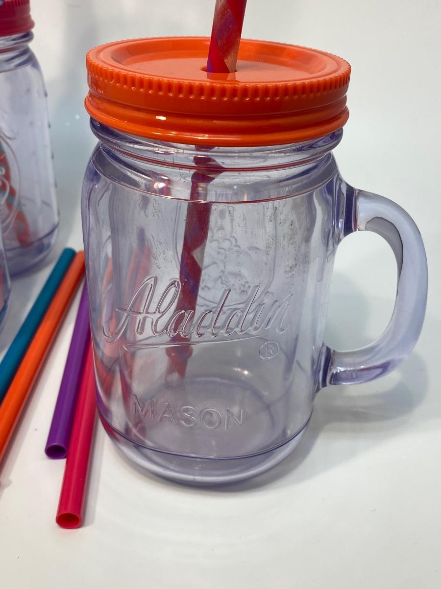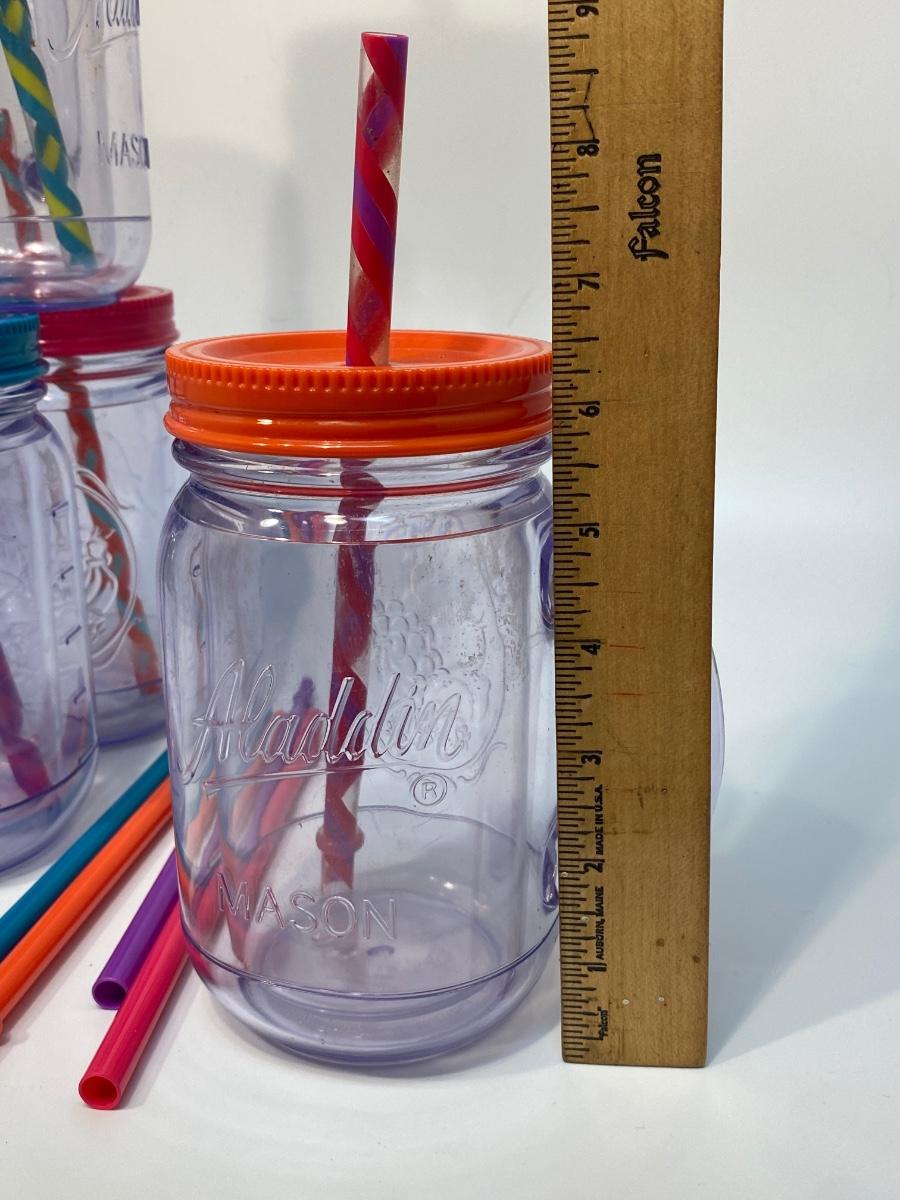 Lot of Aladdin Plastic Mason Jars with Multicolored Lids & Plastic Straws, there is no significant damage to the cups and is in good useable condition. Check pictures for more details and for sizing.