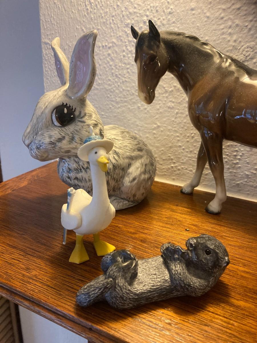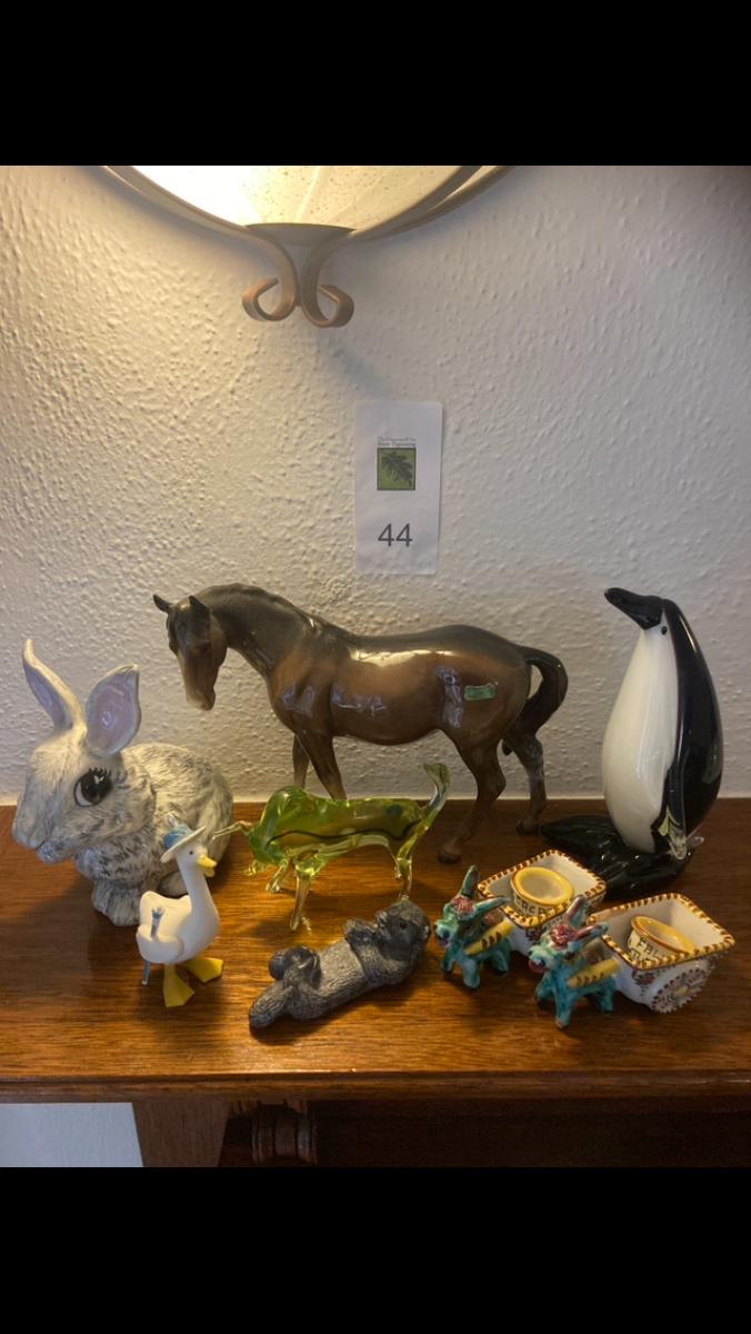 Beswick horse, bunny, glass penguin, glass bull (tail broken), duck, burros pulling carts (chipped), etc.