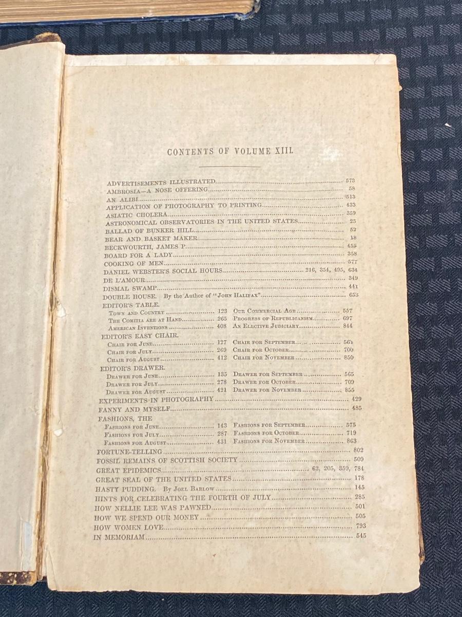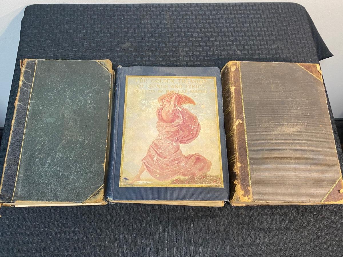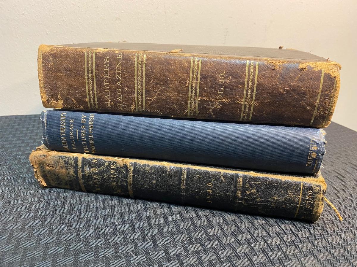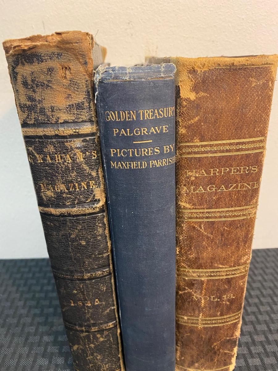Lot of Antique 19th & 20th Century Books Harper's New Monthly Magazine Volume XIII June to November, A Golden Treasury of Songs and Lyrics Francis Turner Palgrave, & Graham's Magazine, there is some wear to the covers and there is some ripping to a page in one of the books, but there is no significant damage to the pages and is in overall good condition for its age.