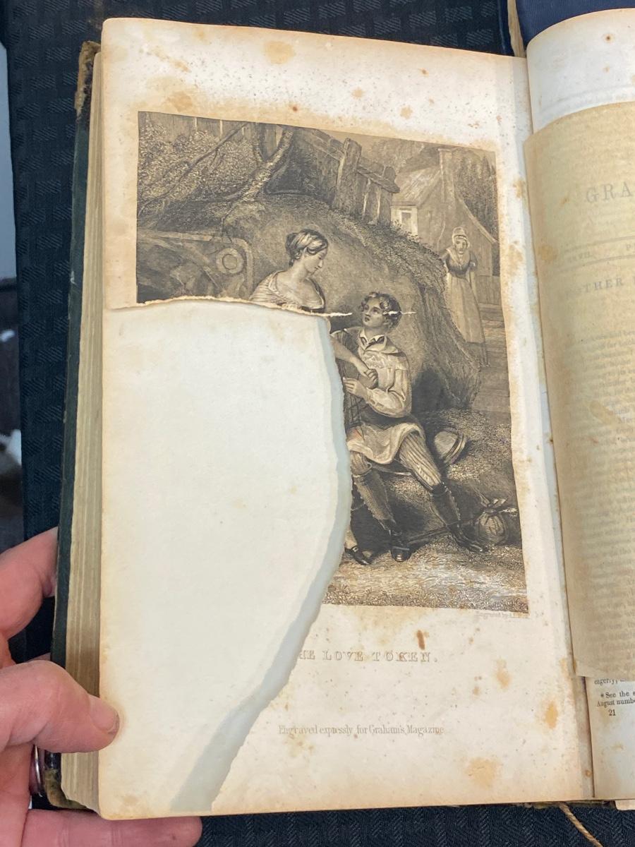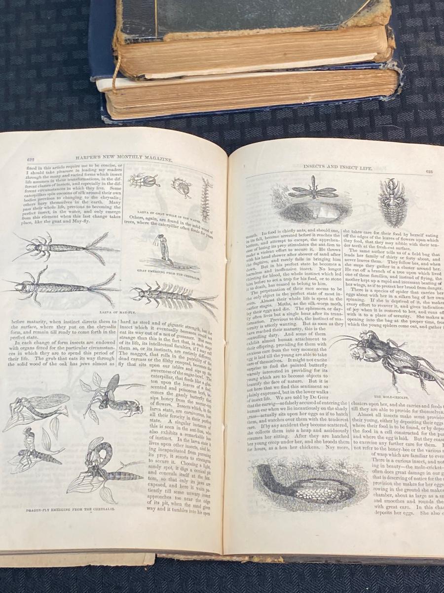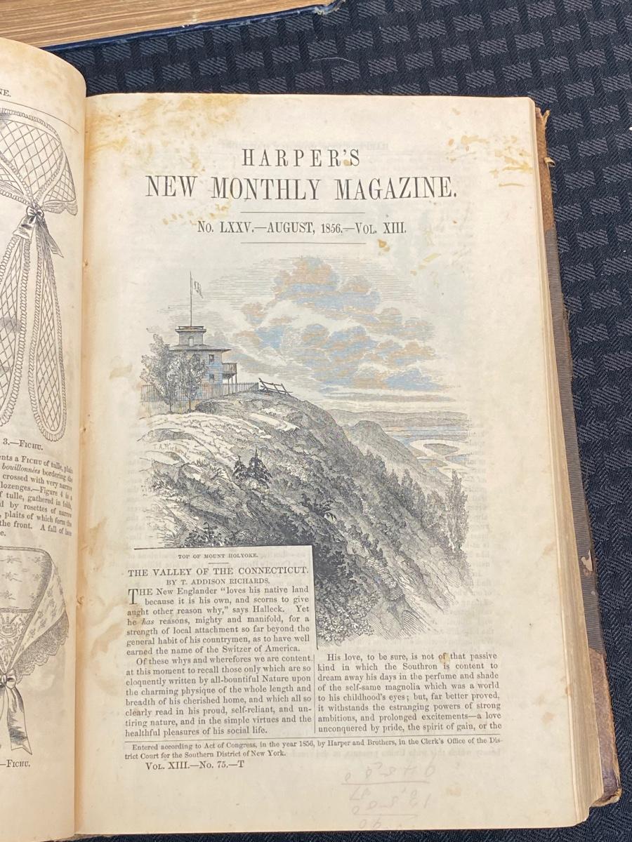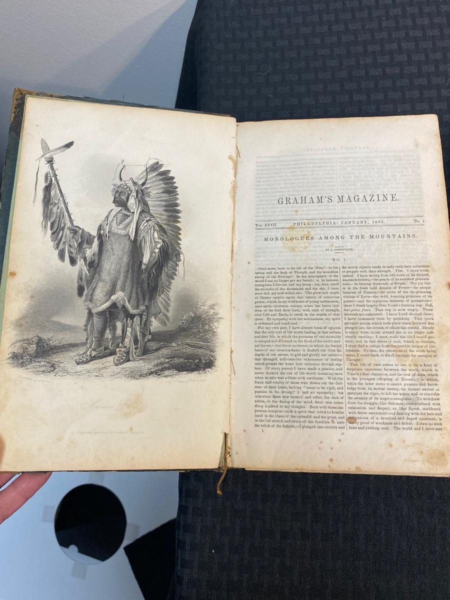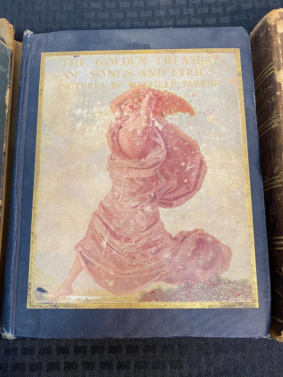 Lot of Antique 19th & 20th Century Books Harper's New Monthly Magazine Volume XIII June to November, A Golden Treasury of Songs and Lyrics Francis Turner Palgrave, & Graham's Magazine, there is some wear to the covers and there is some ripping to a page in one of the books, but there is no significant damage to the pages and is in overall good condition for its age.
