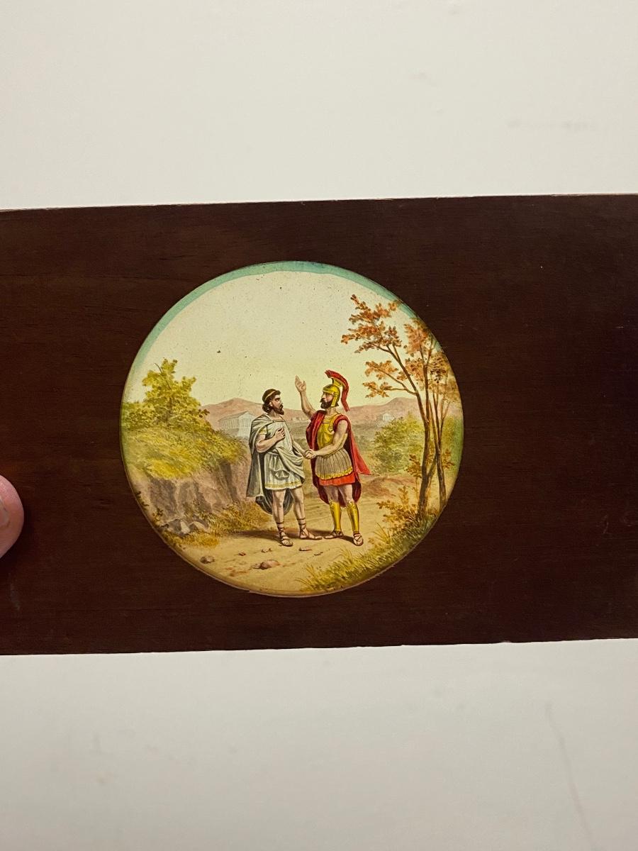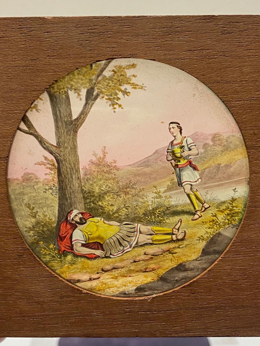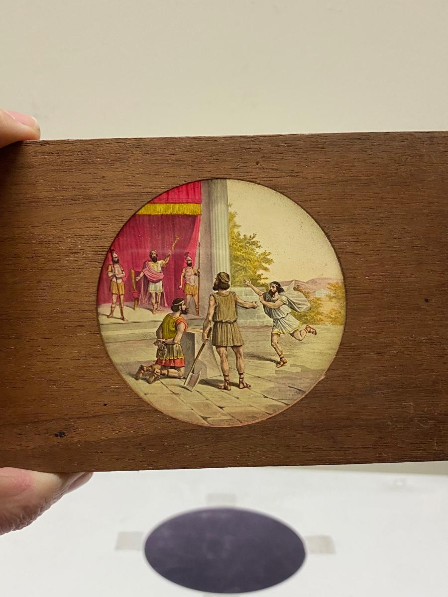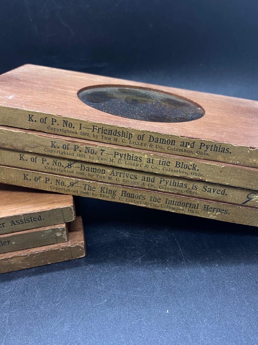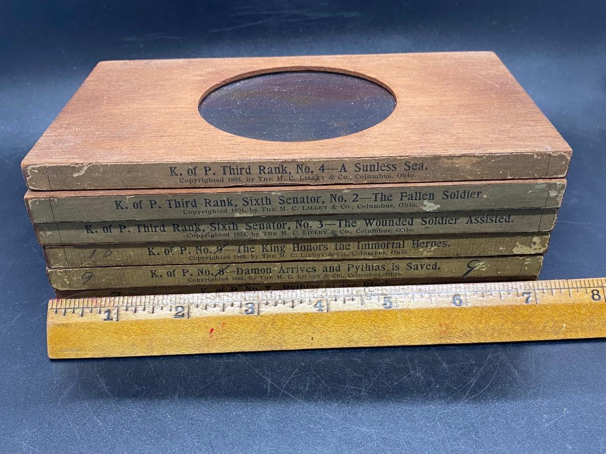 Lot of Antique 19th Century M.C. Lilley Magic Lantern Projector Color Glass Slides , there is no significant damage to any of the glass or wood and is in good collectible condition for its age. Check pictures for more details and for sizing.
