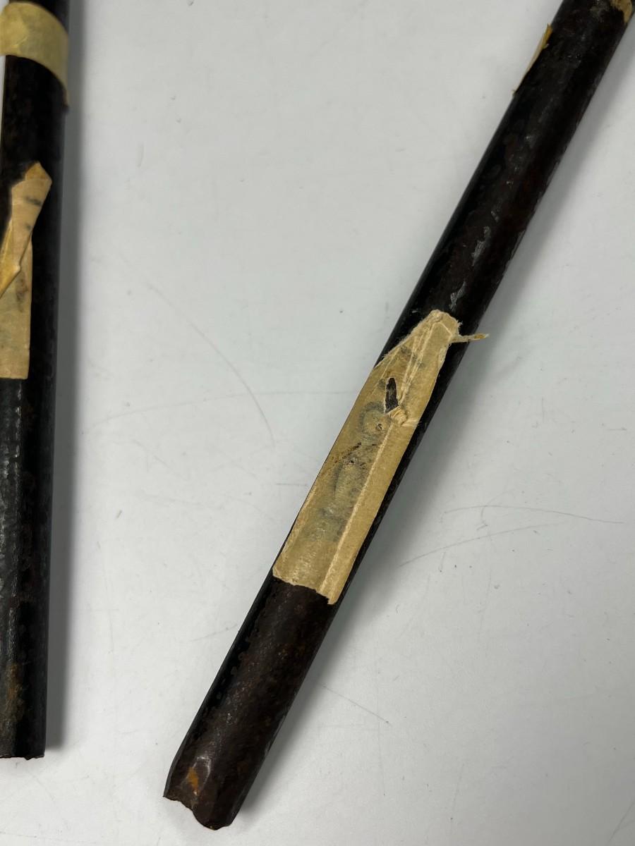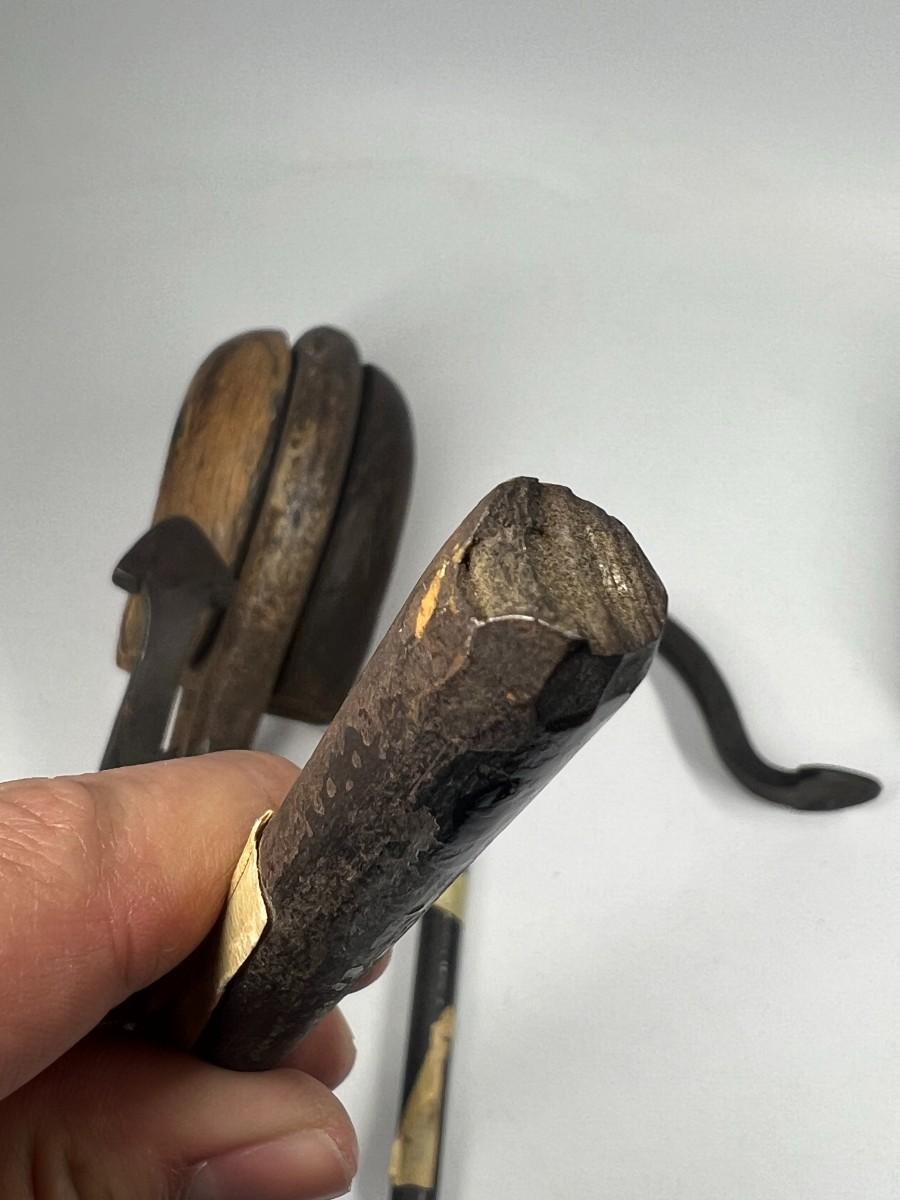 The two hooks have been broken off of something and has a rough edge on the end of both. There is some antique wear to the pieces, but there is no significant damage and is in overall good collectible or displayable condition. Check pictures for more details.