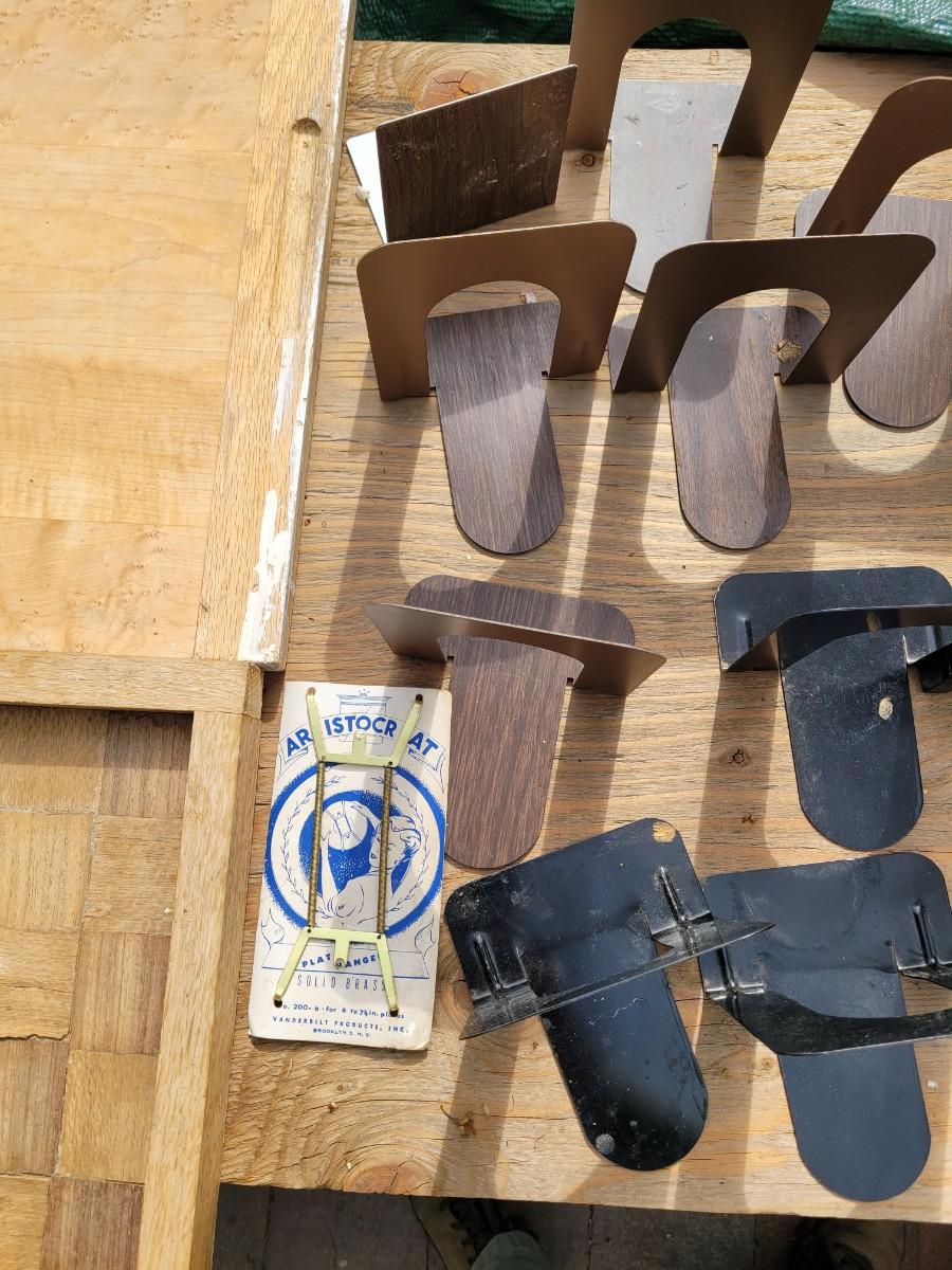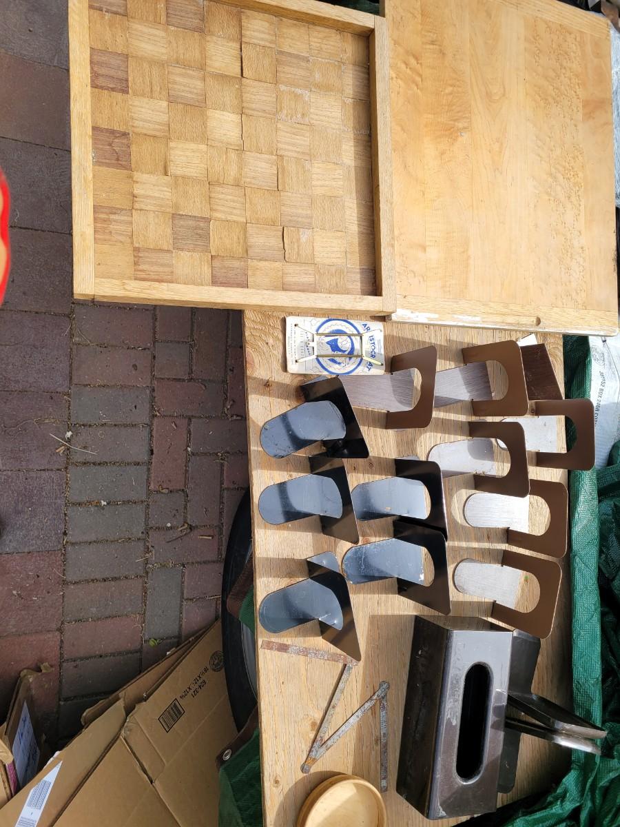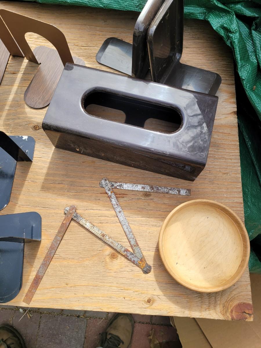Here we have a large cutting board looks like Maple and Oak, a large serving tray or checkerboard, a bunch of bookends, a brass wall mounted plate holder, vintage Kleenex box wall holder and a wooden bowl. Also a pretty neat foldable 2 ft tape measure