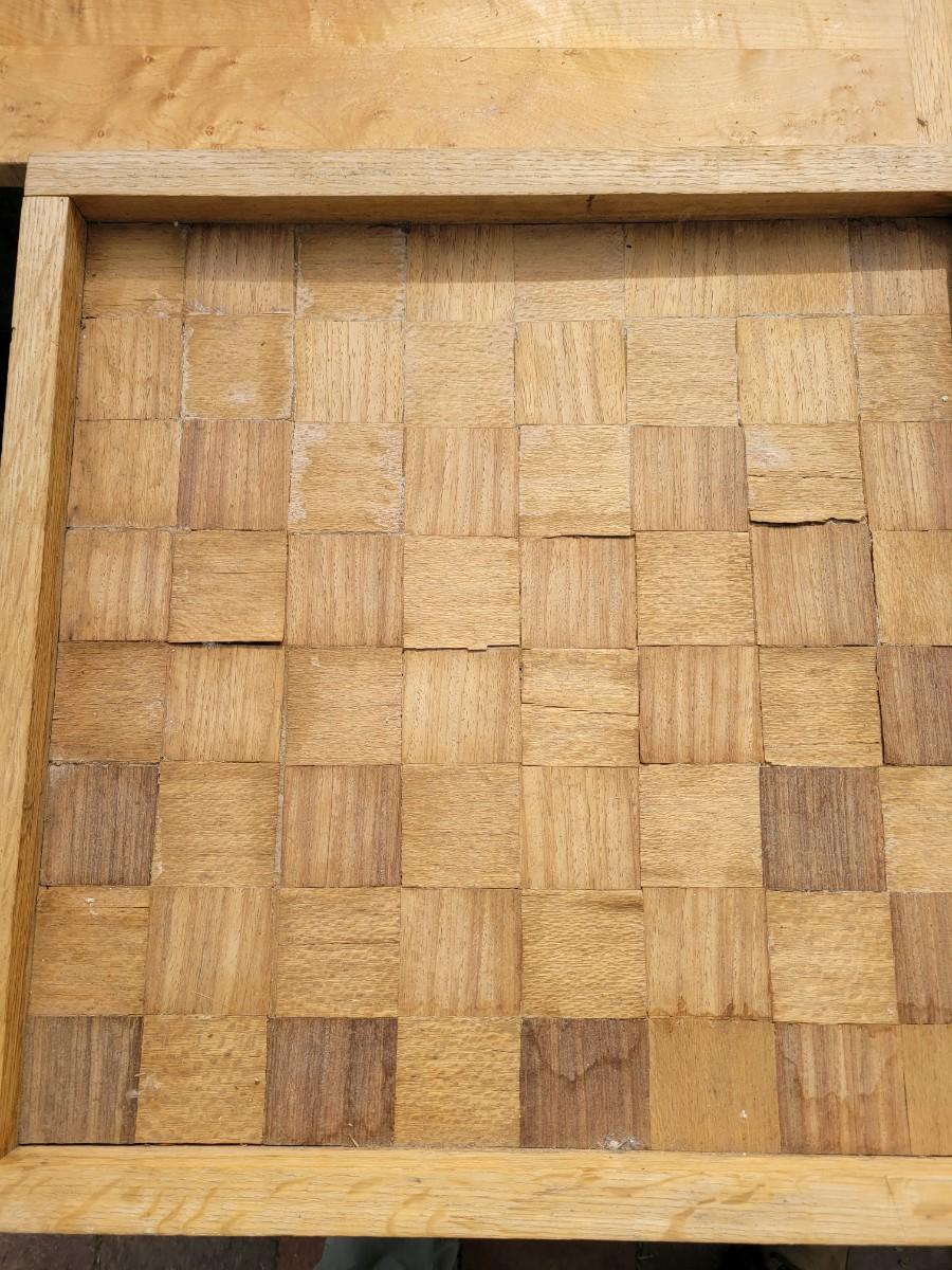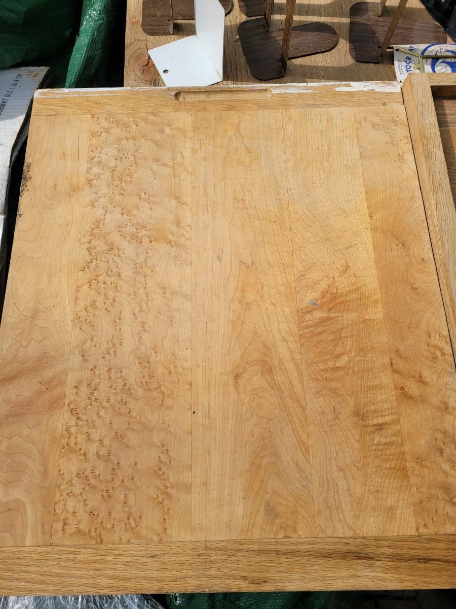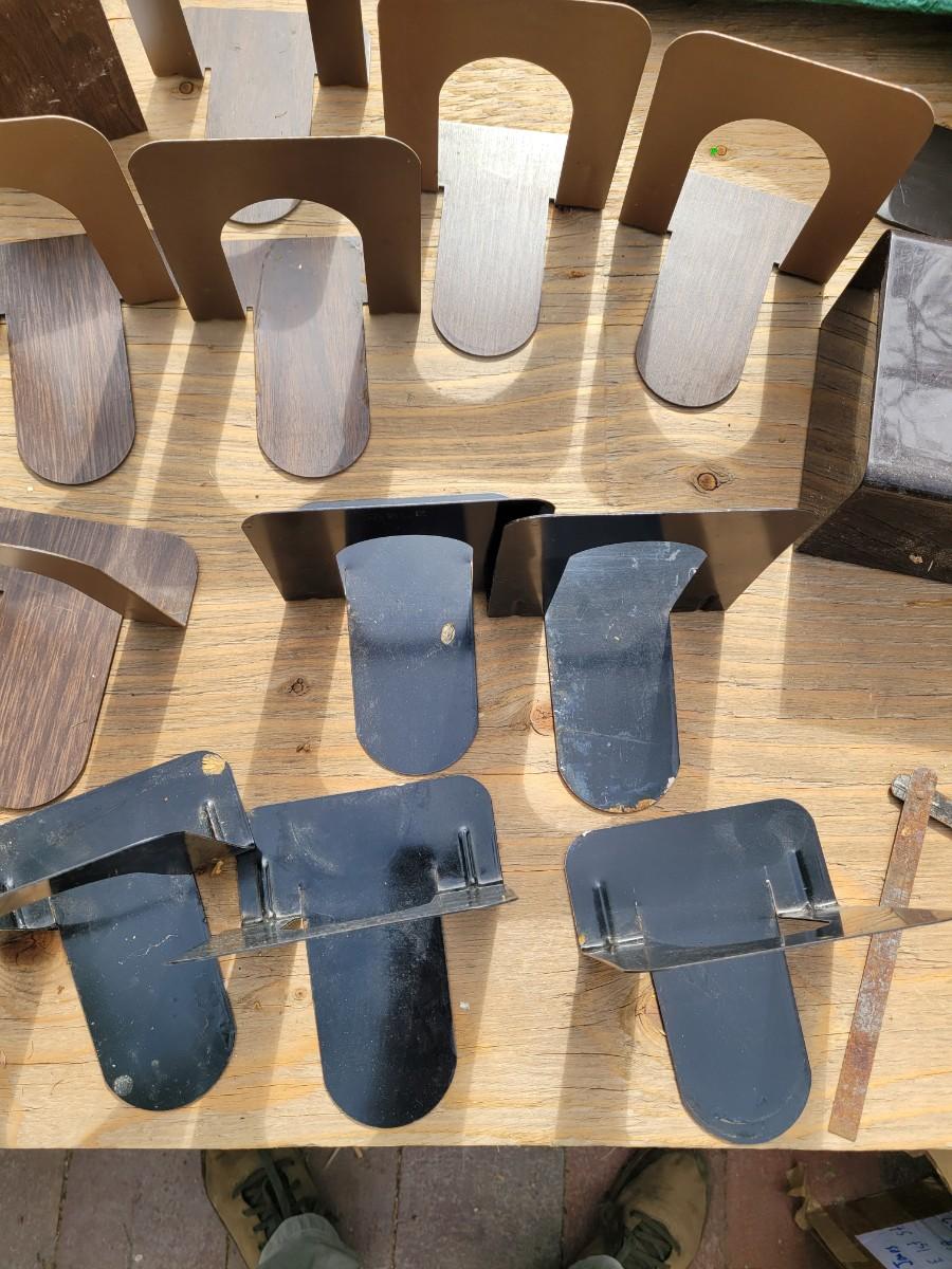 Here we have a large cutting board looks like Maple and Oak, a large serving tray or checkerboard, a bunch of bookends, a brass wall mounted plate holder, vintage Kleenex box wall holder and a wooden bowl. Also a pretty neat foldable 2 ft tape measure