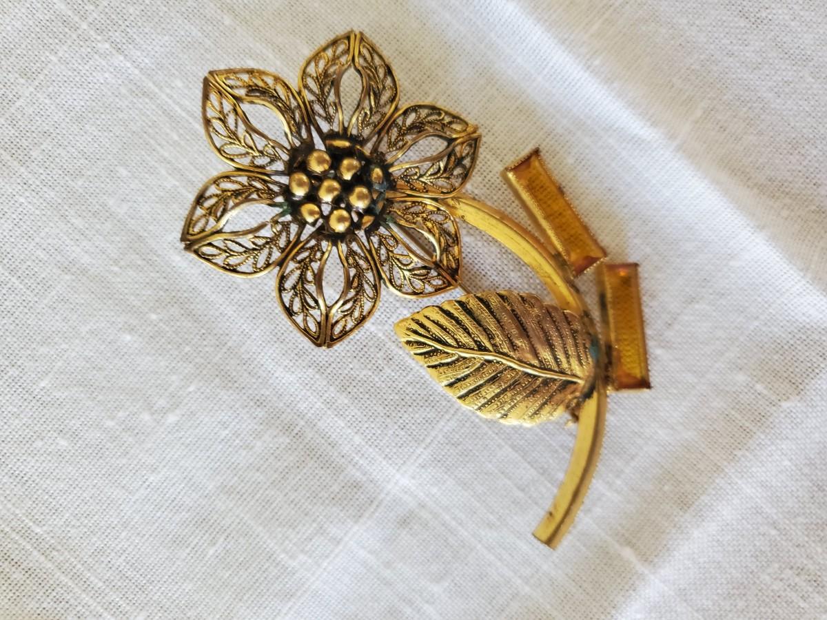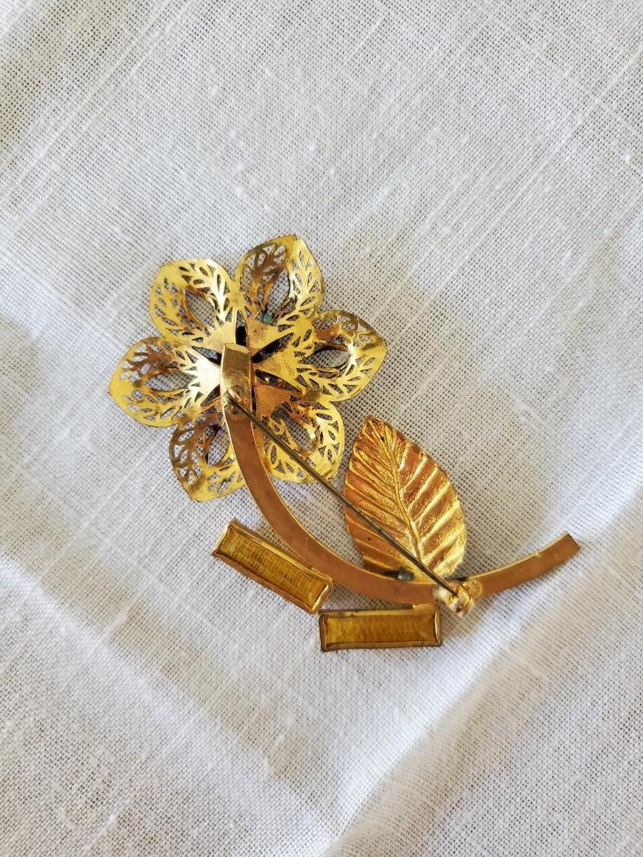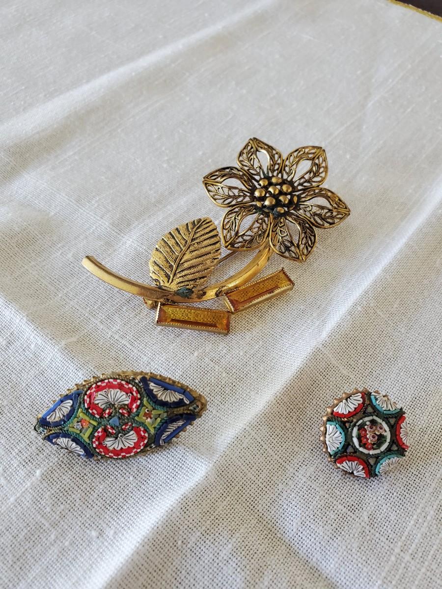 Two very old mosaic pins and one gold-tone flower pin set with rhinestones.