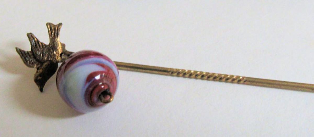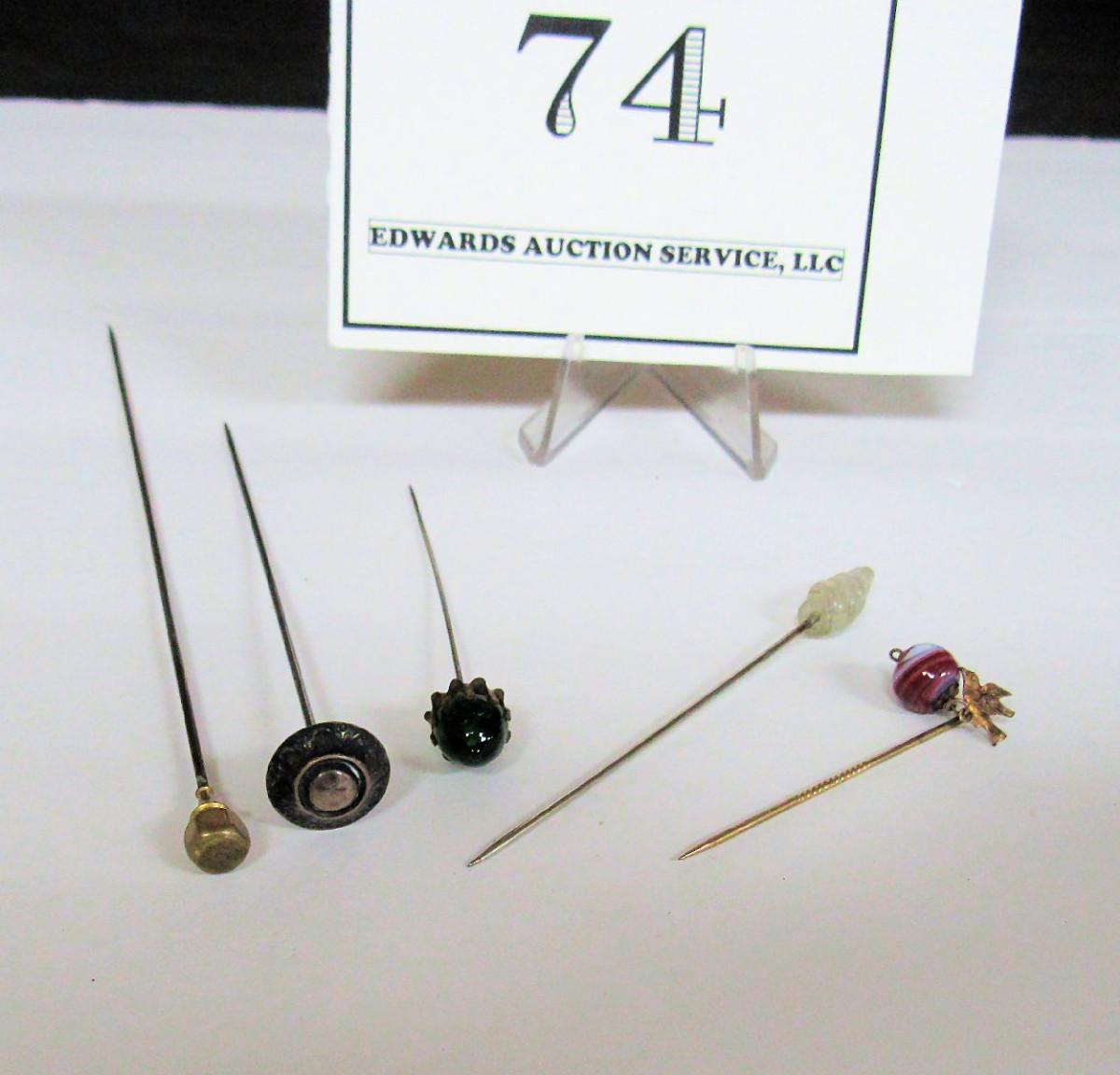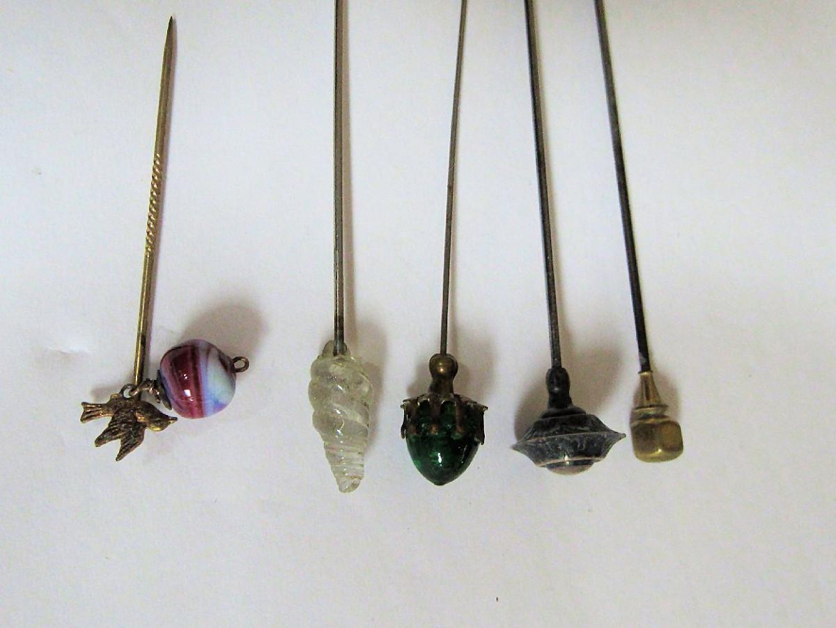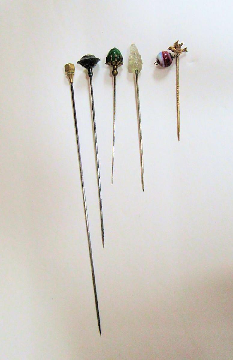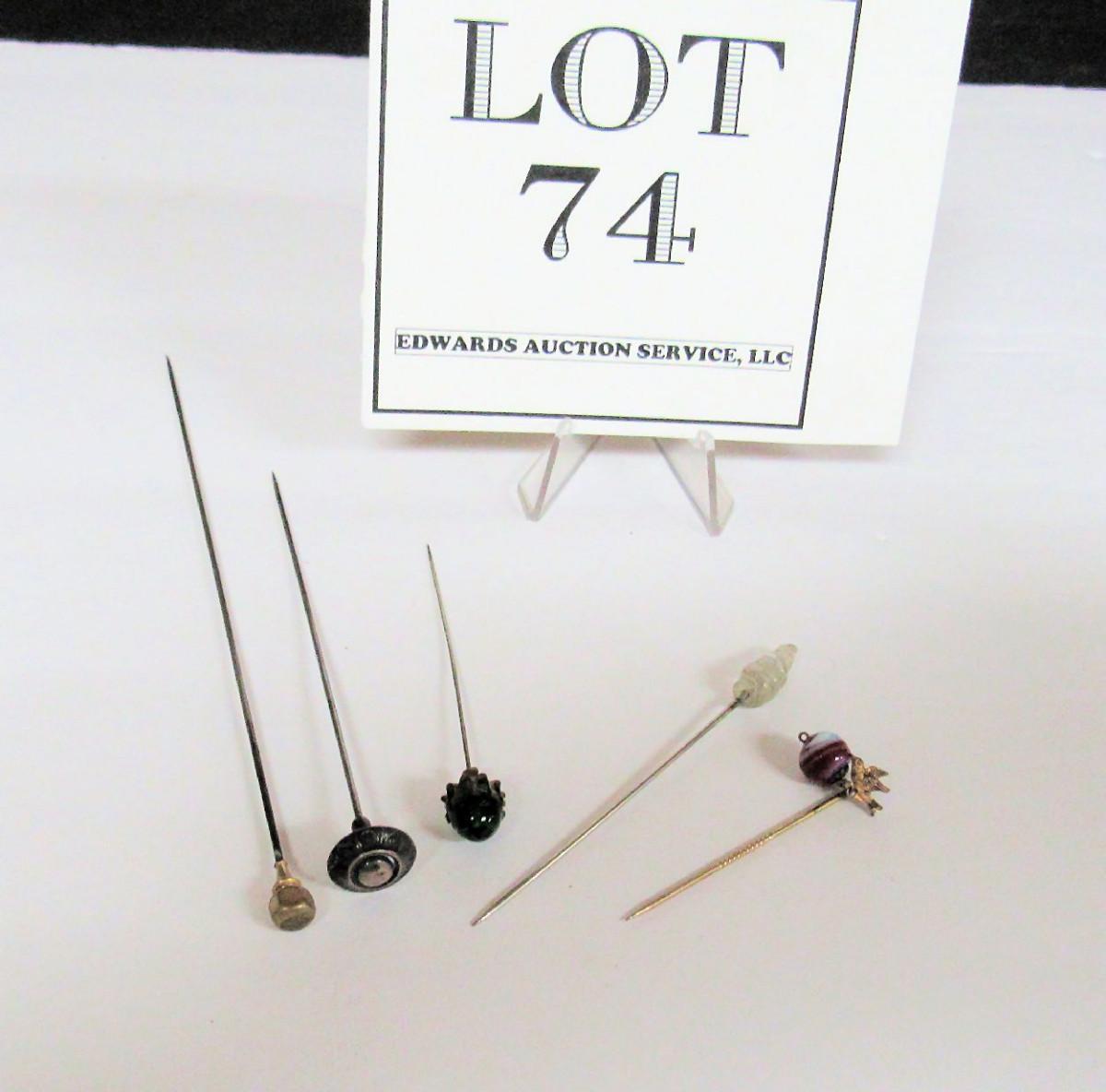 Lot of Antique Short Hat Pins and One Lapel Pin, Sterling, Brass, Glass, Plastic