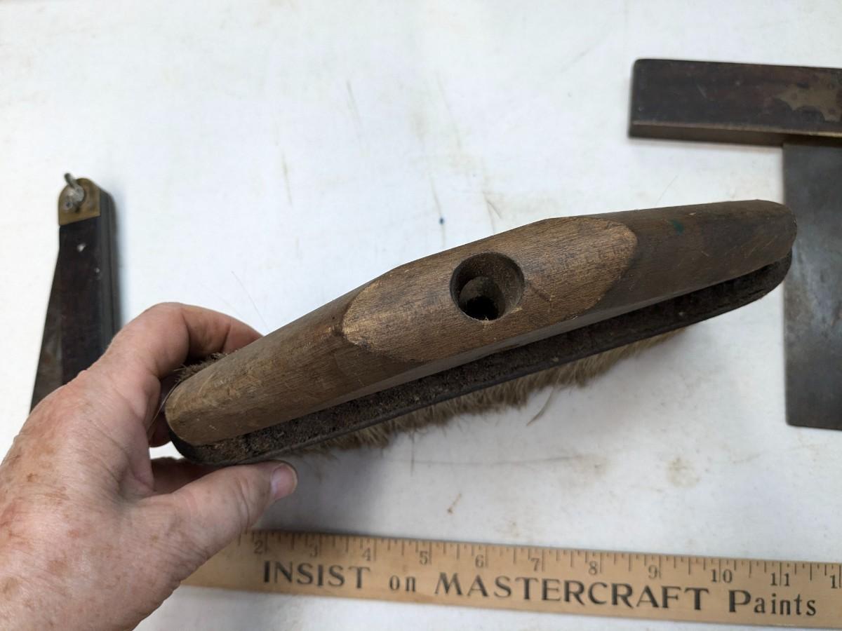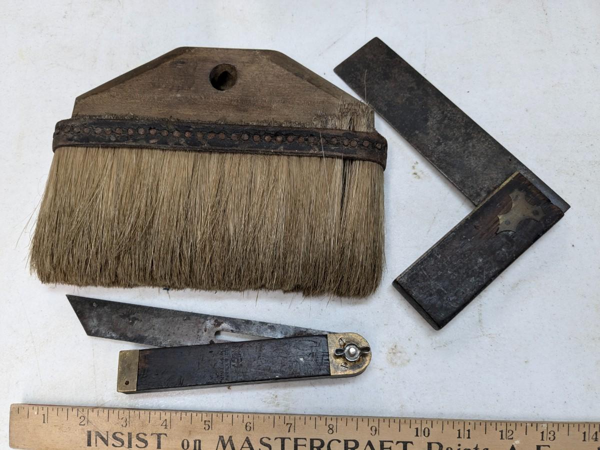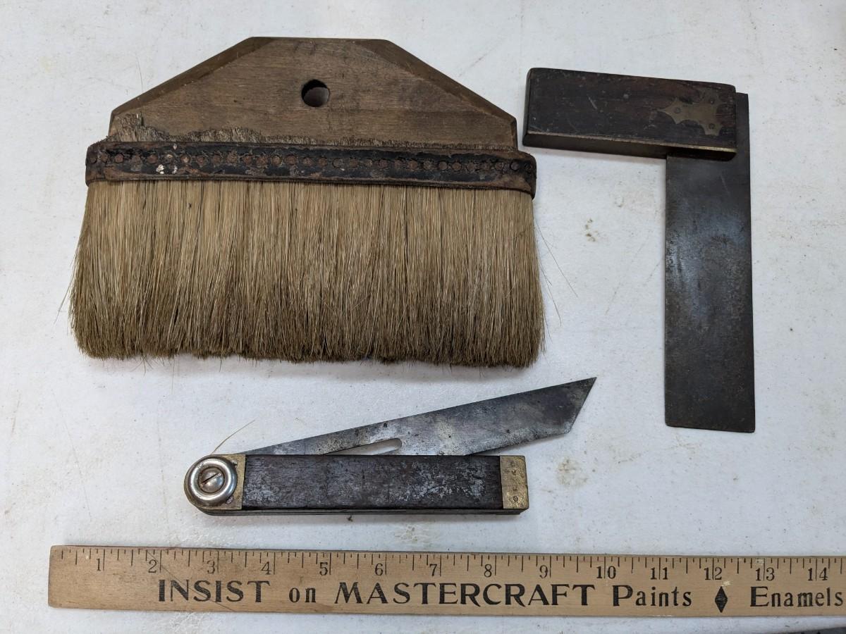 very cool wall paper brush, wood and brass square, wood and brass angle finder