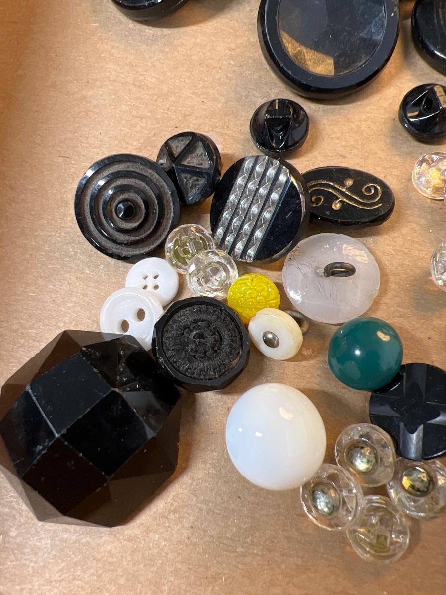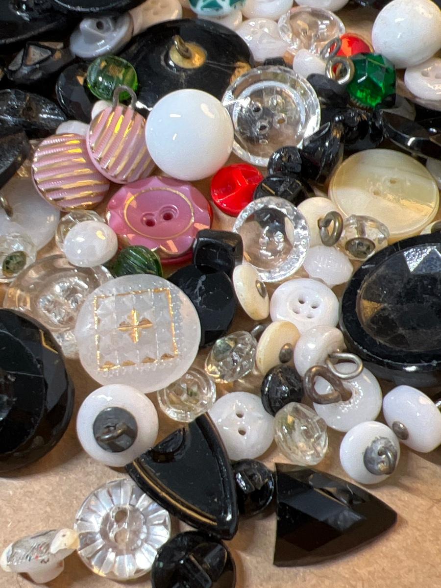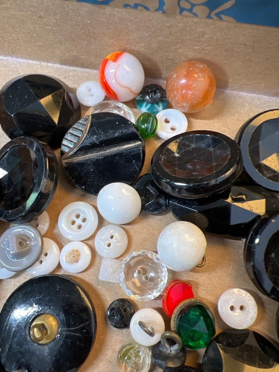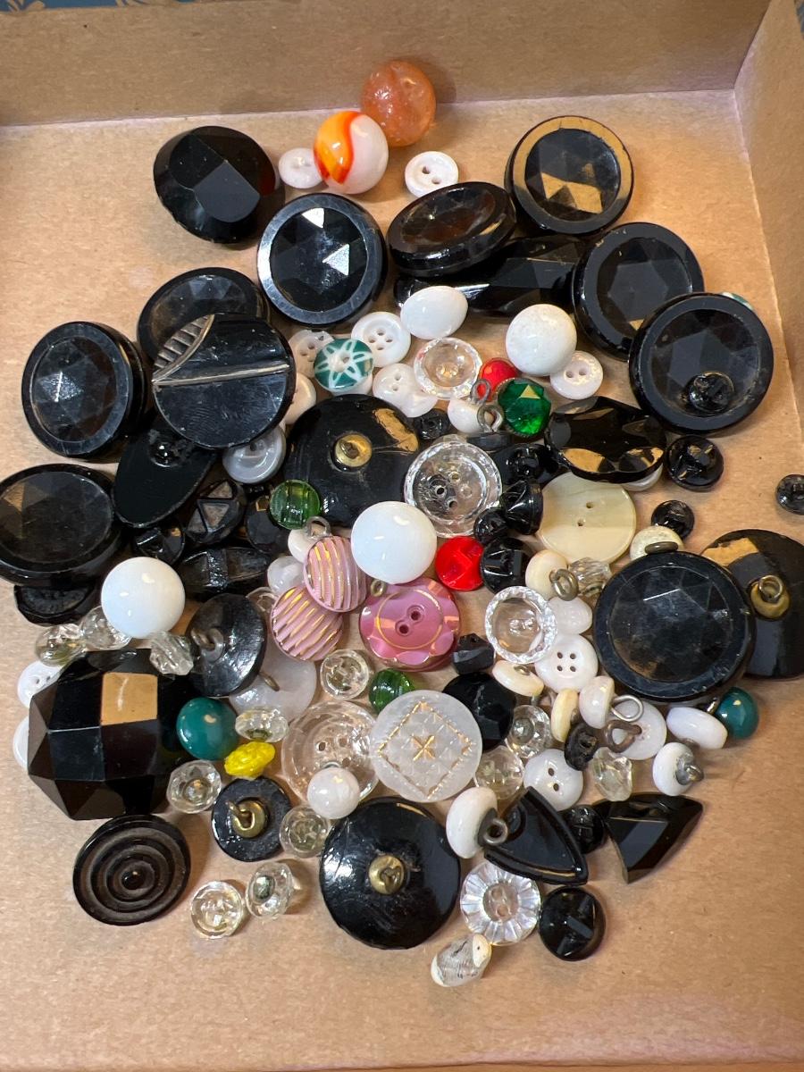 Amazing lot of antique vintage glass buttons. Various colors, shapes, detailing shank types and sizes. Plus 2 glass marbles. Victorian, Edwardian, 1800's 1900's