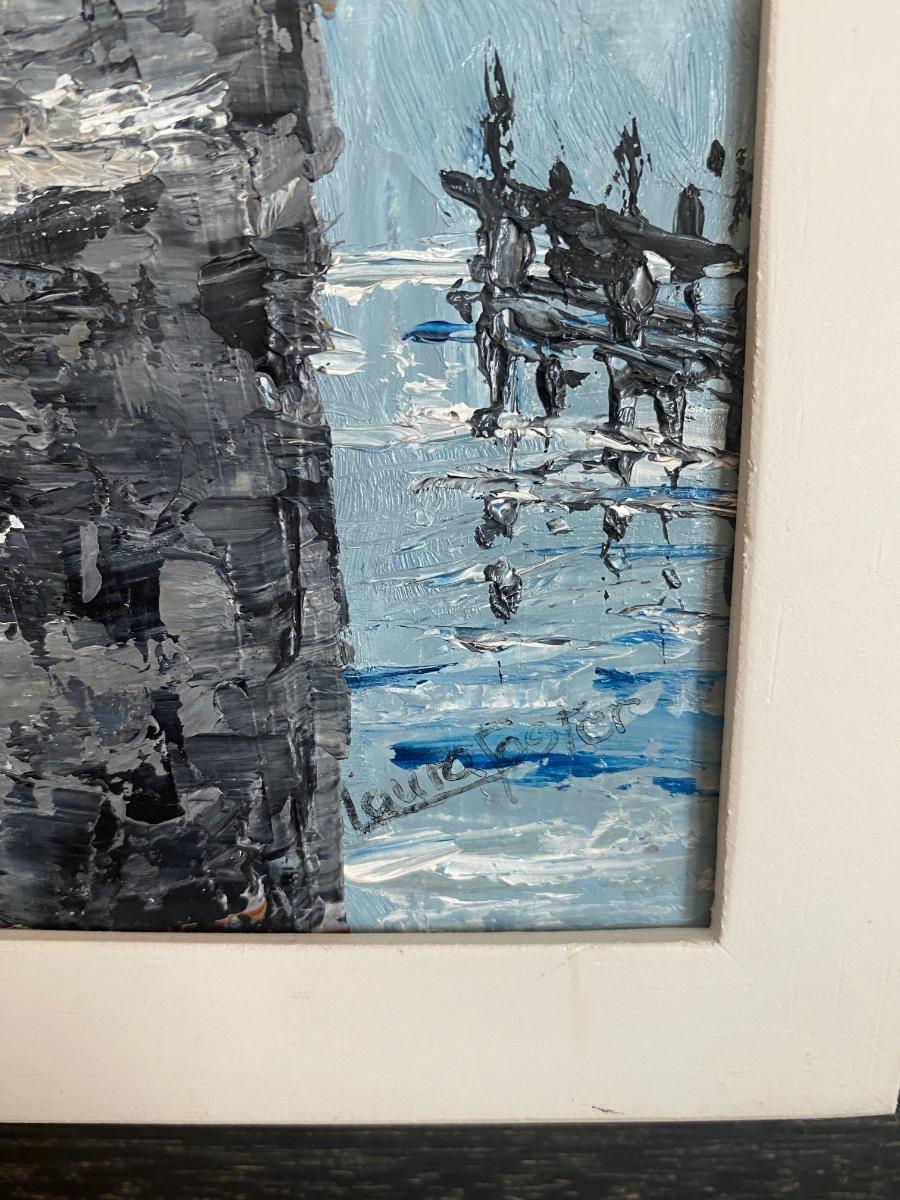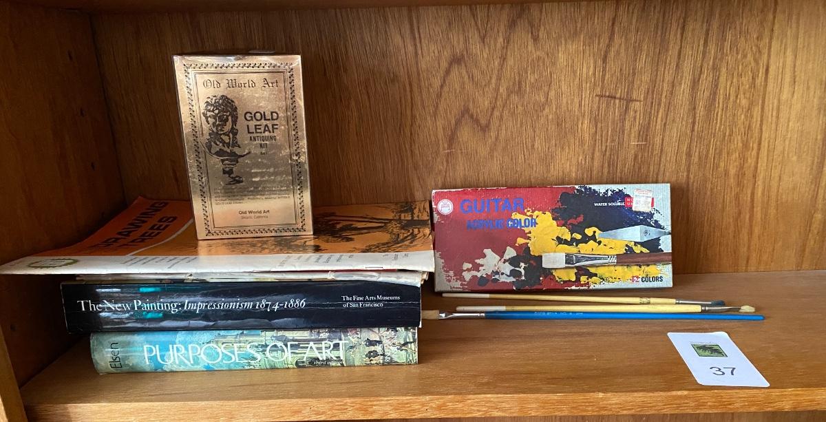 Set of two oil on canvas paintings signed by artist, water color signed by artist, collection of art books, gold leafing kit and a box of paints