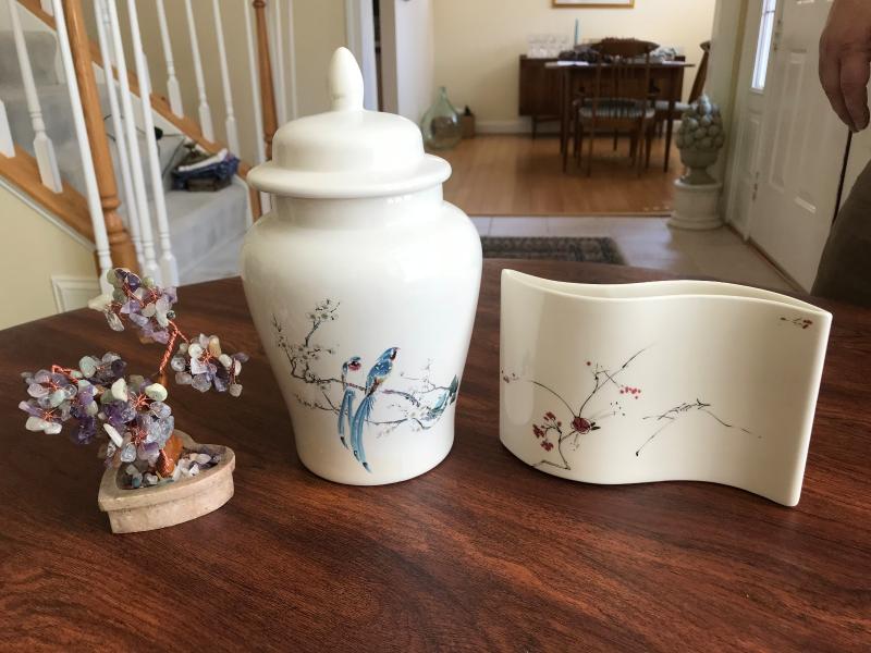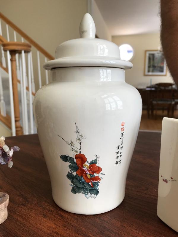 -Ceramic ginger jar with lid. Decorated with camellias, birds, cherry branches, and calligraphy 9 1/2" H.