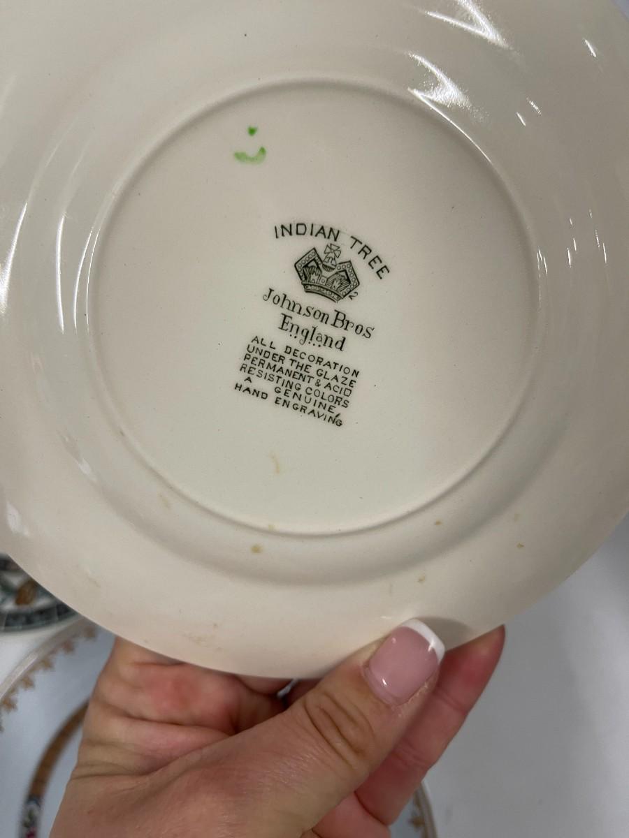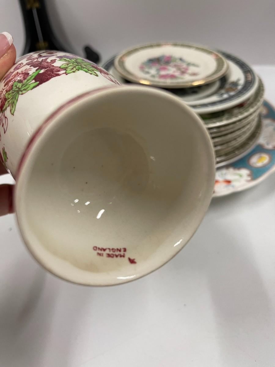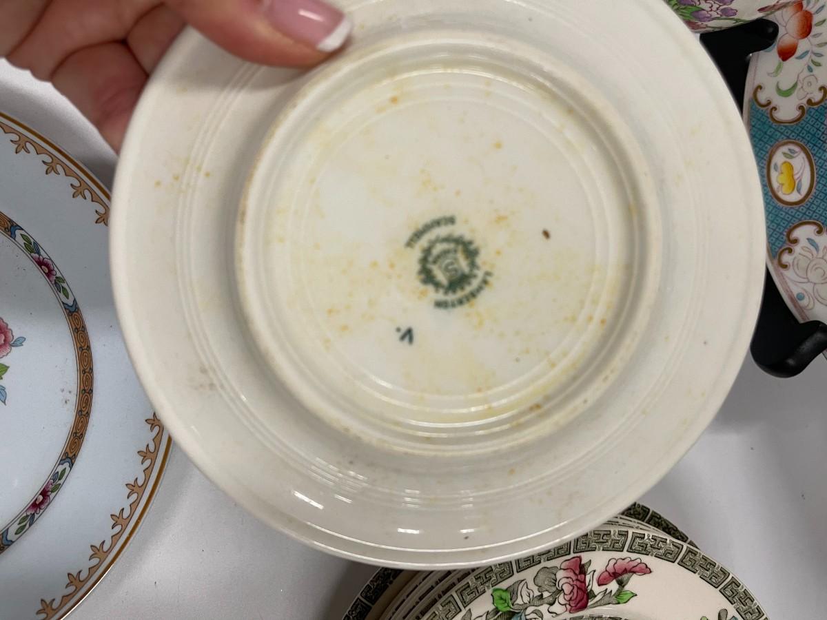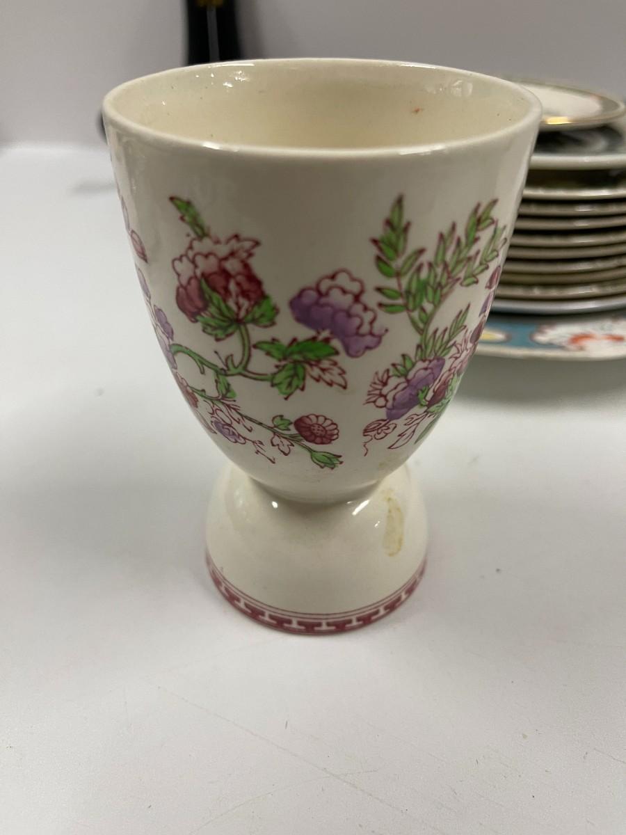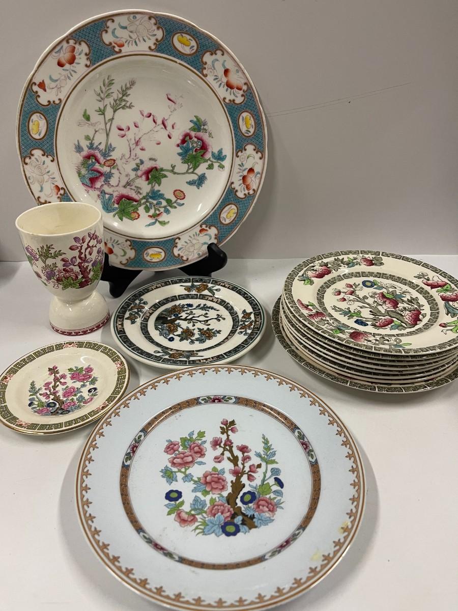 Lot of vintage Asian style porcelain dishes. Includes Johnson Brothers Indian Tree plates (7 plates, 6 1/2")1 Portland Lotus plate, Egg cup and some misc porcelain plates.