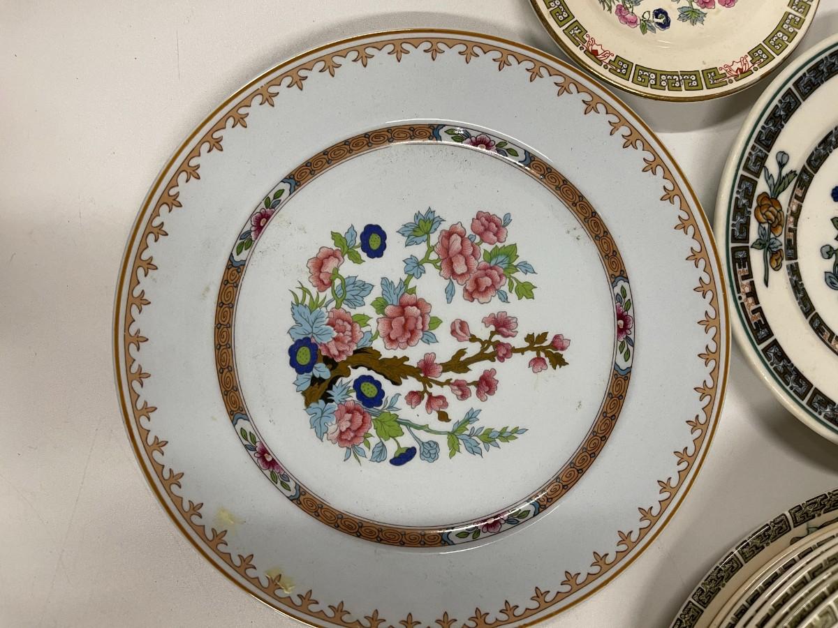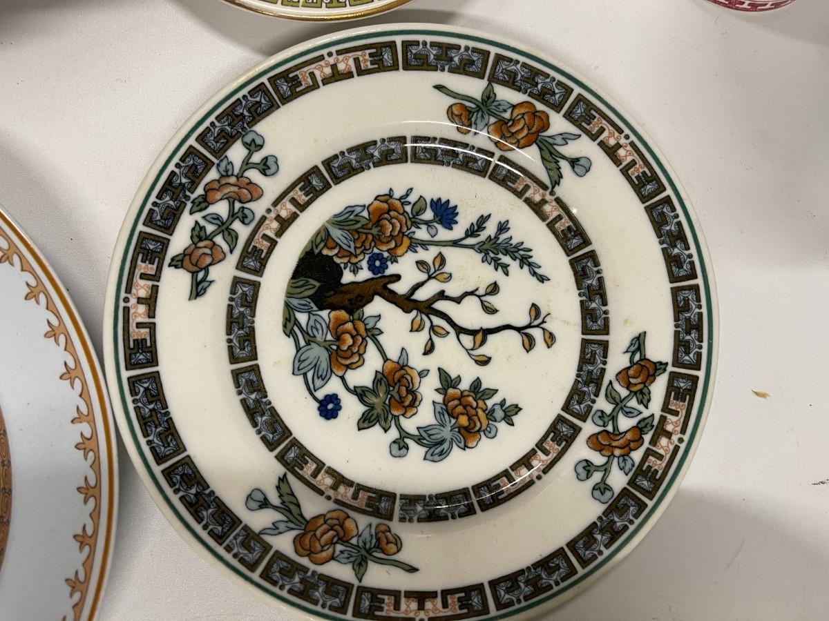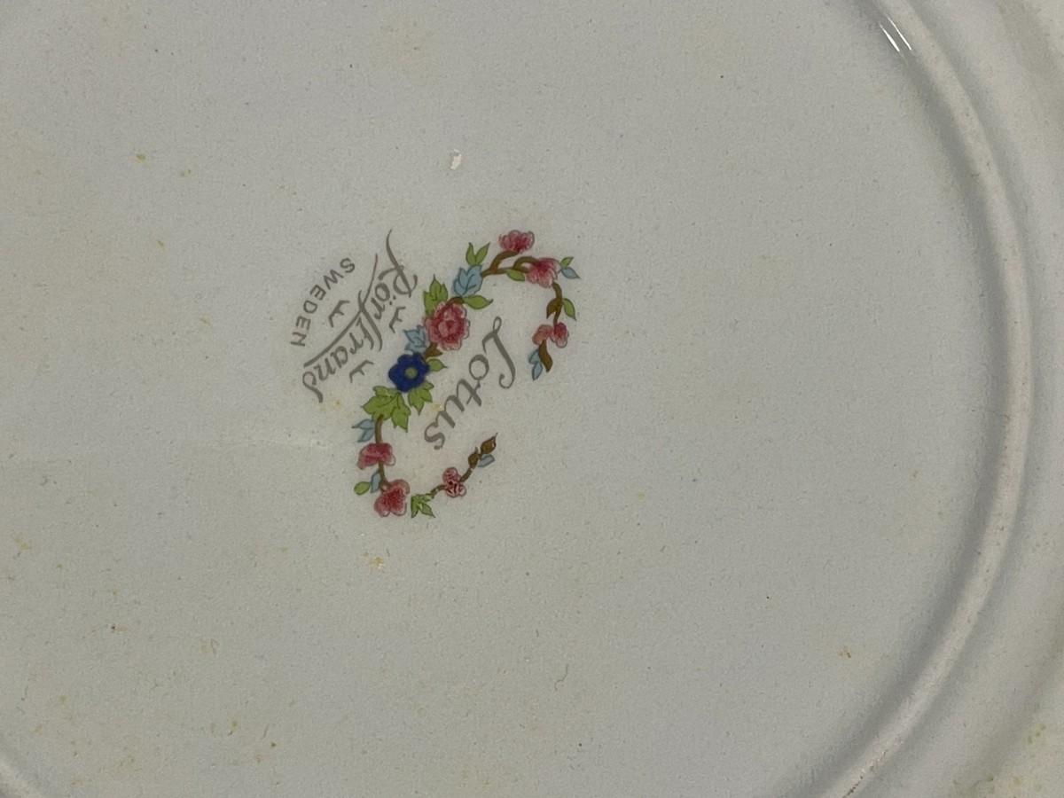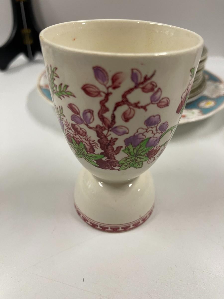 Lot of vintage Asian style porcelain dishes. Includes Johnson Brothers Indian Tree plates (7 plates, 6 1/2")1 Portland Lotus plate, Egg cup and some misc porcelain plates.