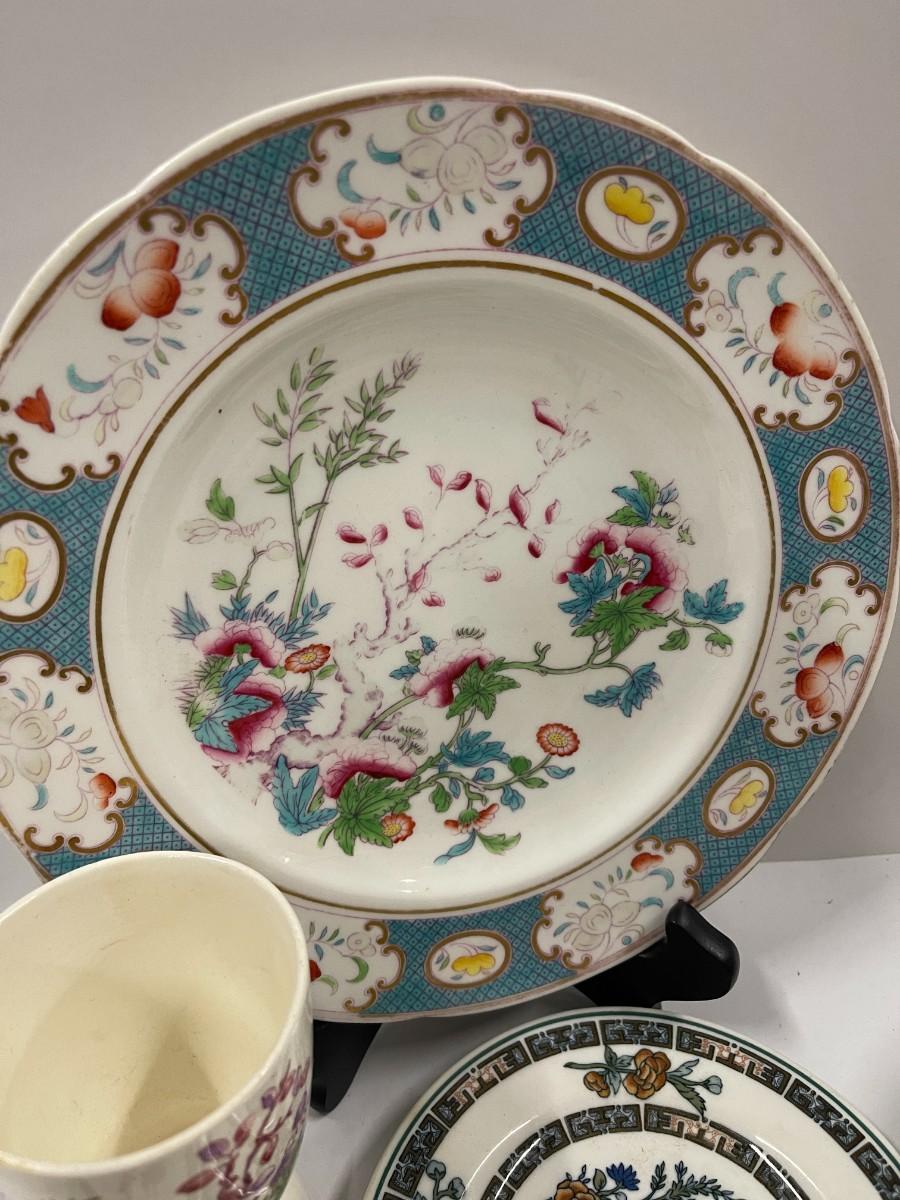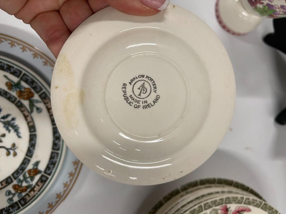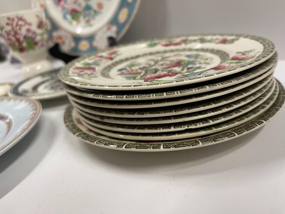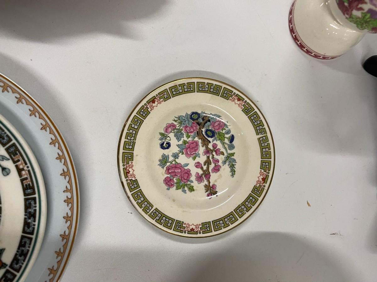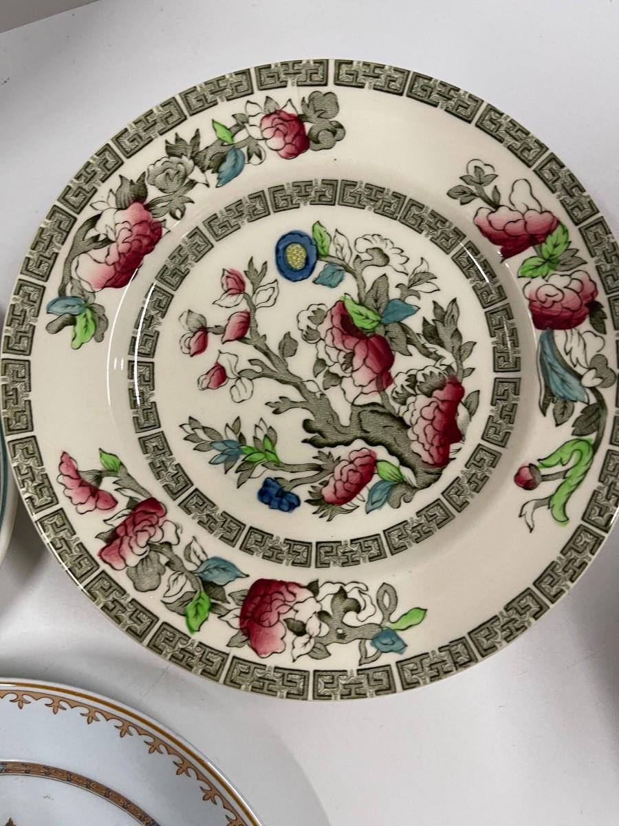 Lot of vintage Asian style porcelain dishes. Includes Johnson Brothers Indian Tree plates (7 plates, 6 1/2")1 Portland Lotus plate, Egg cup and some misc porcelain plates.