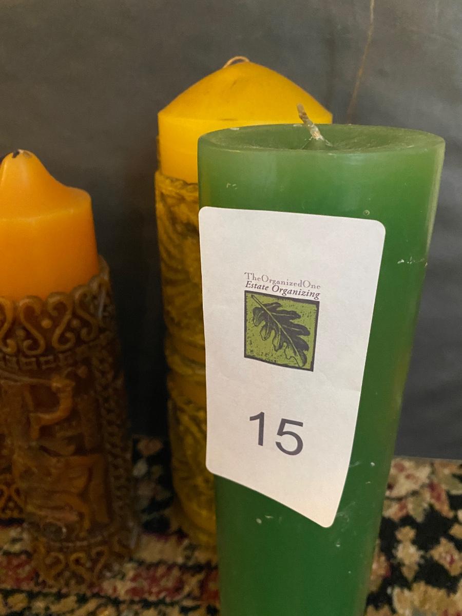 Lot contains a variety of different sizes and types of candles and a pair of candlesticks.
