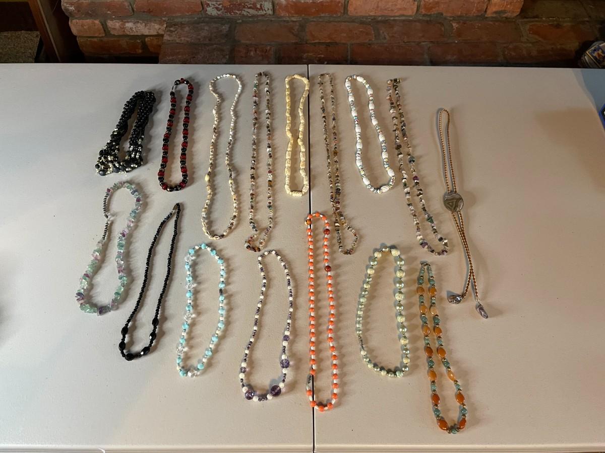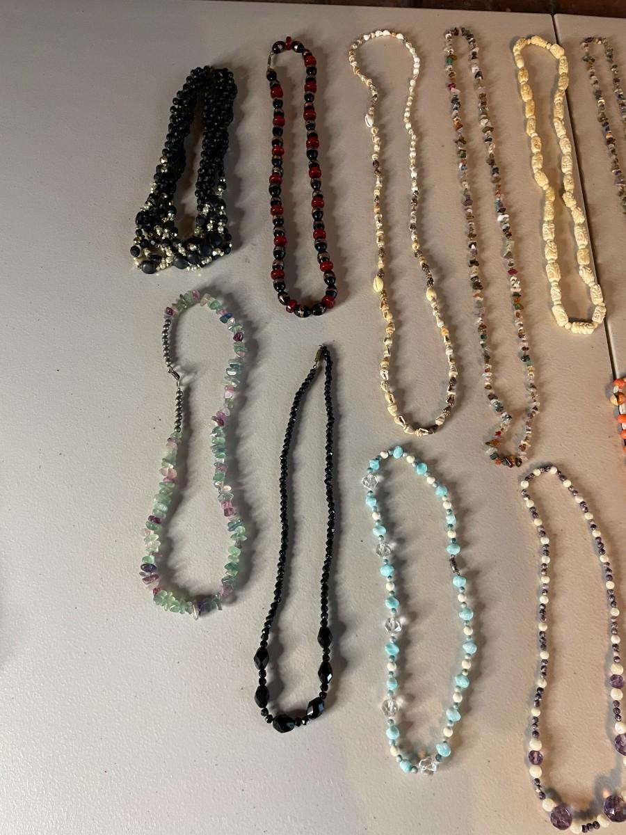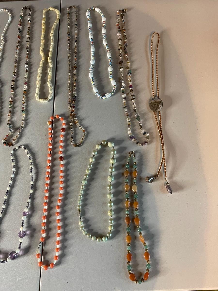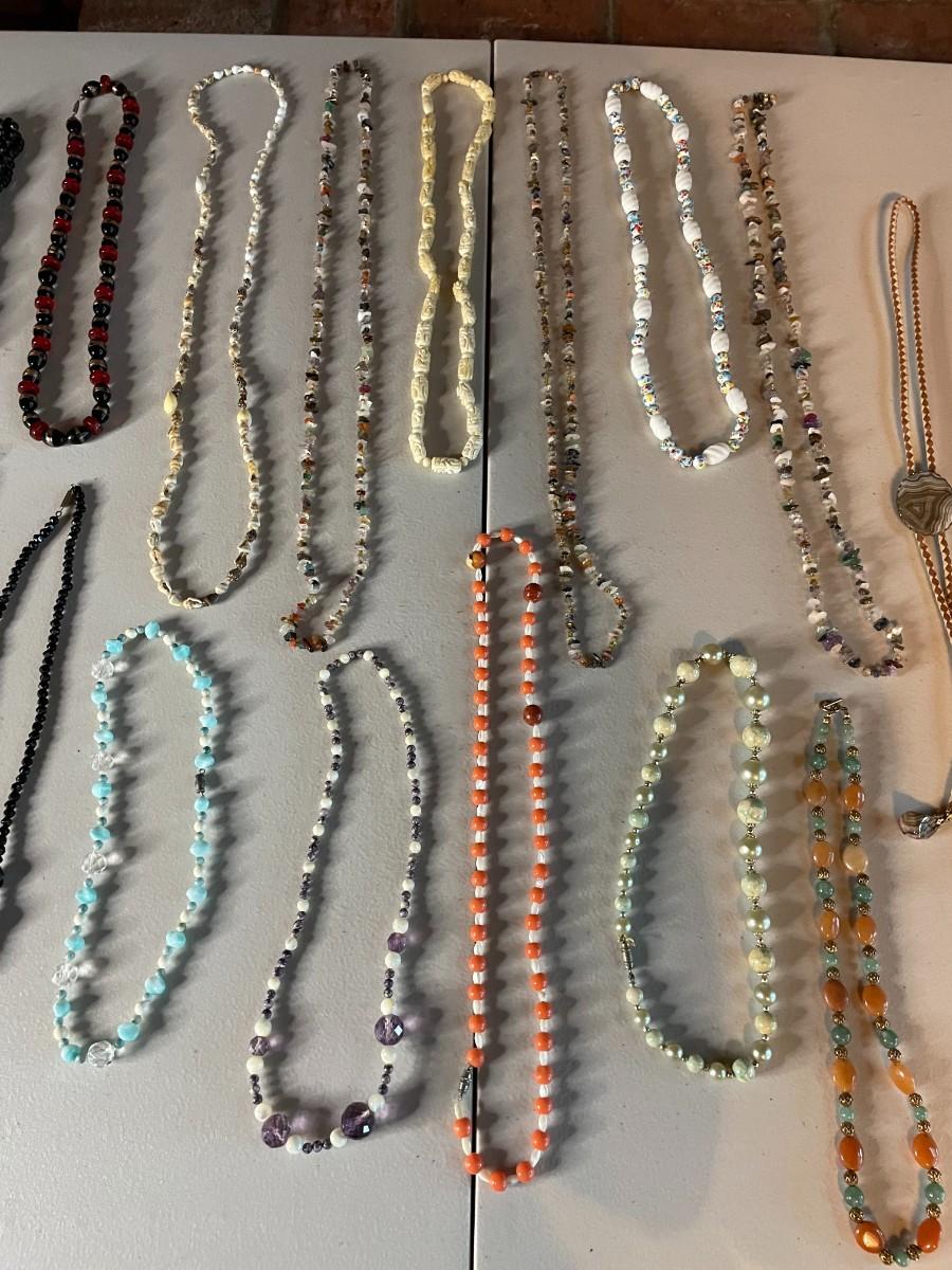 Lot of assorted beaded necklaces in array of colors.