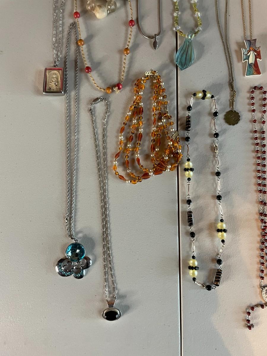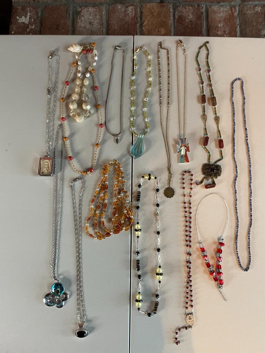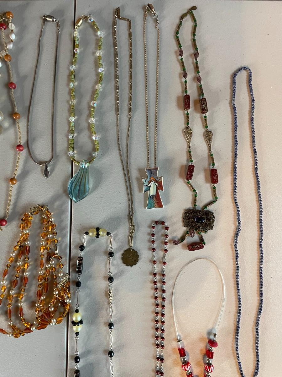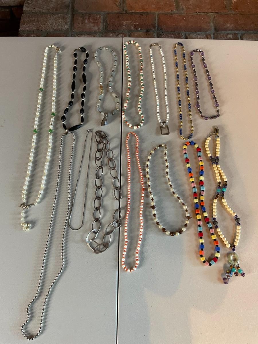 Lot of assorted beaded, Silver chain necklaces in array of colors.