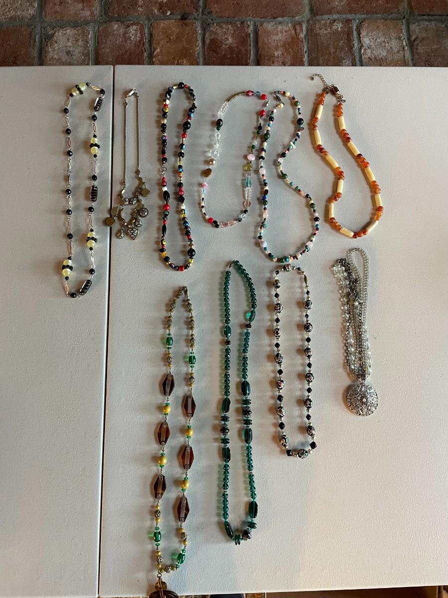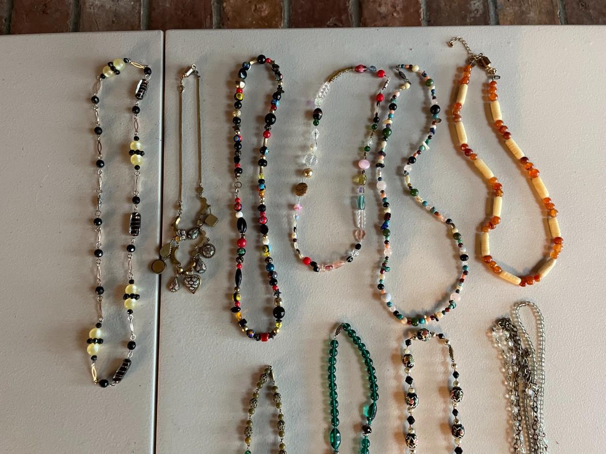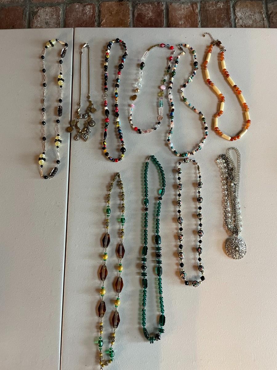 Lot of assorted beaded necklaces in array of colors.