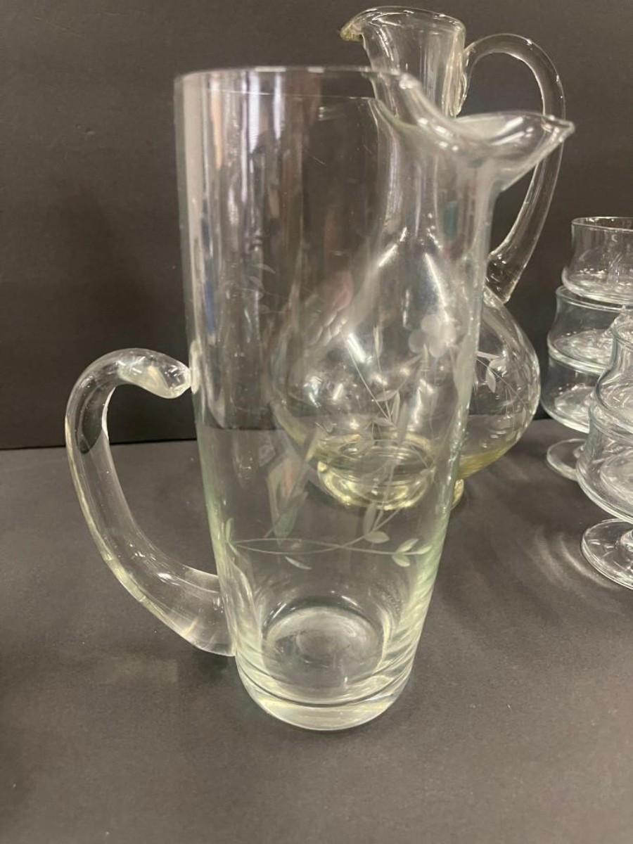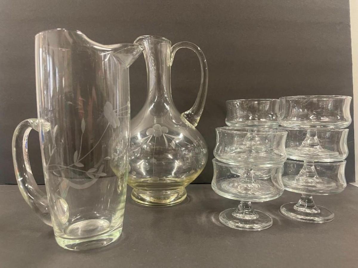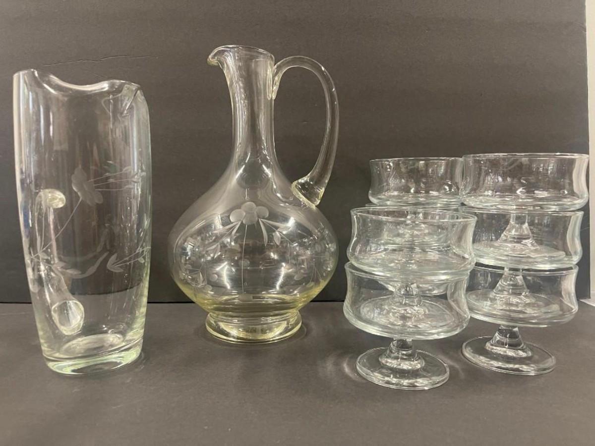 Lot of assorted glass. Includes 8 footed dessert cups, etched glass decanter and pitcher Condition: Used