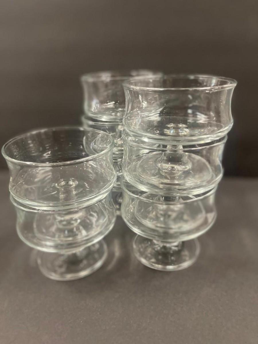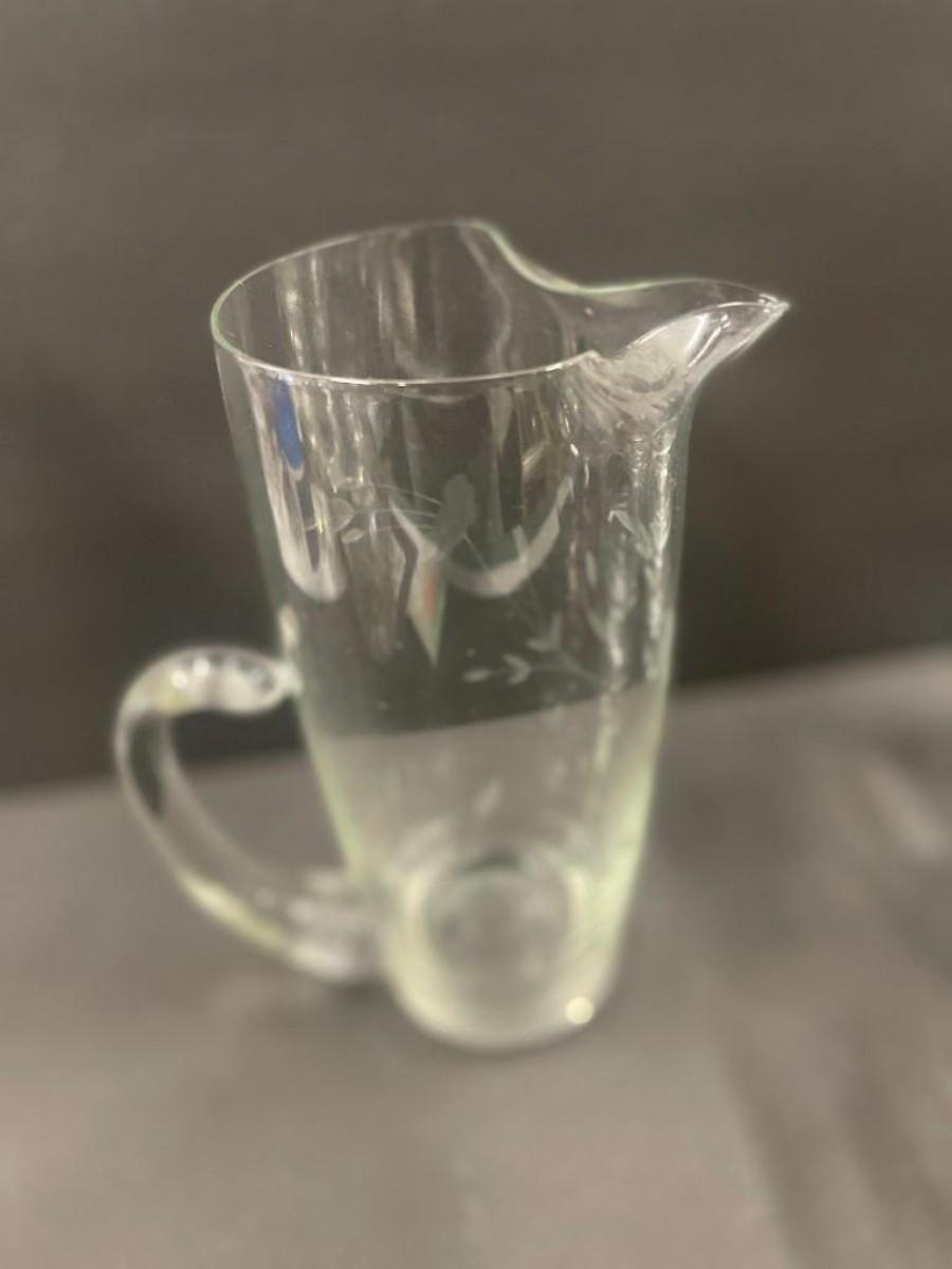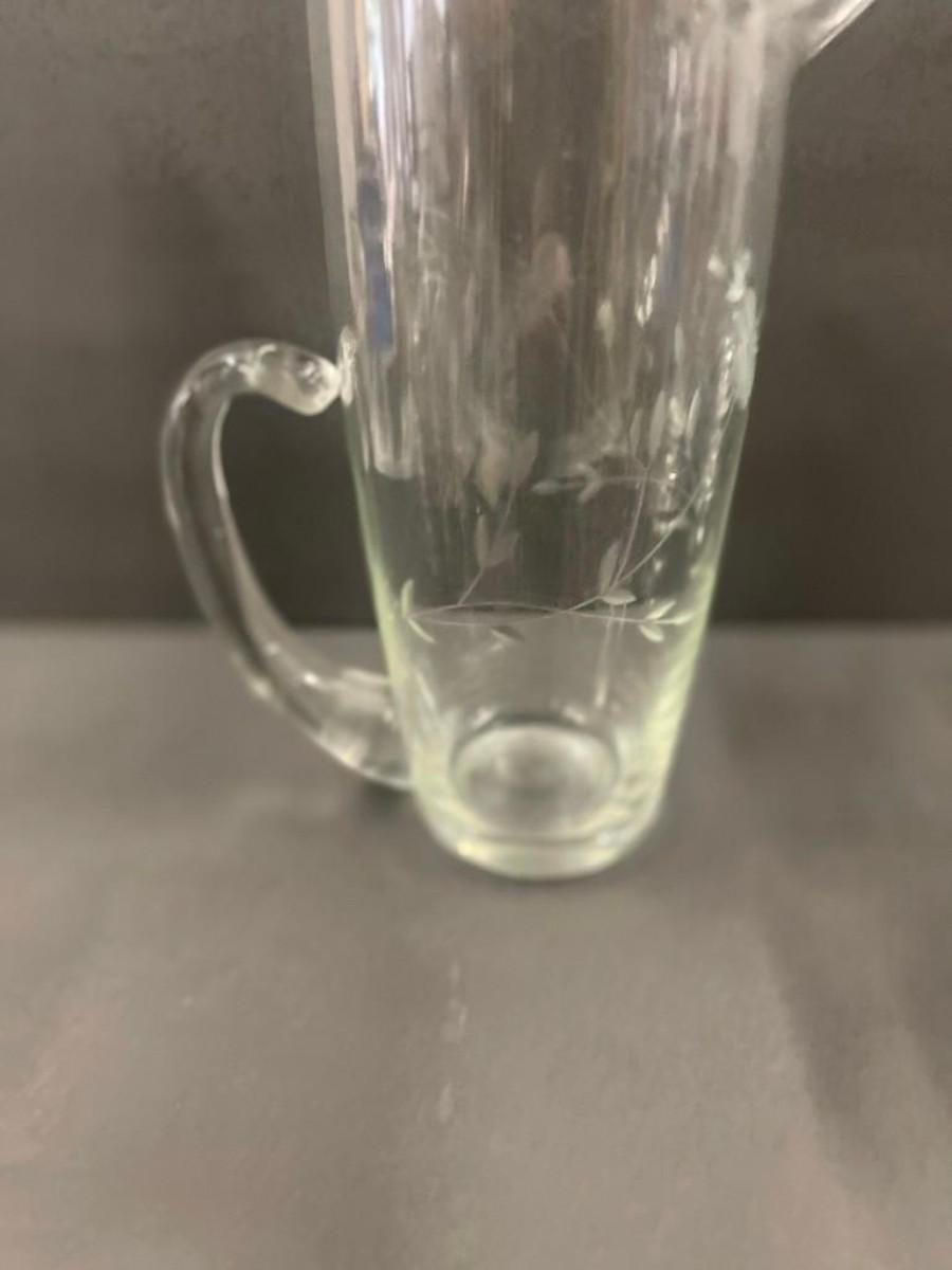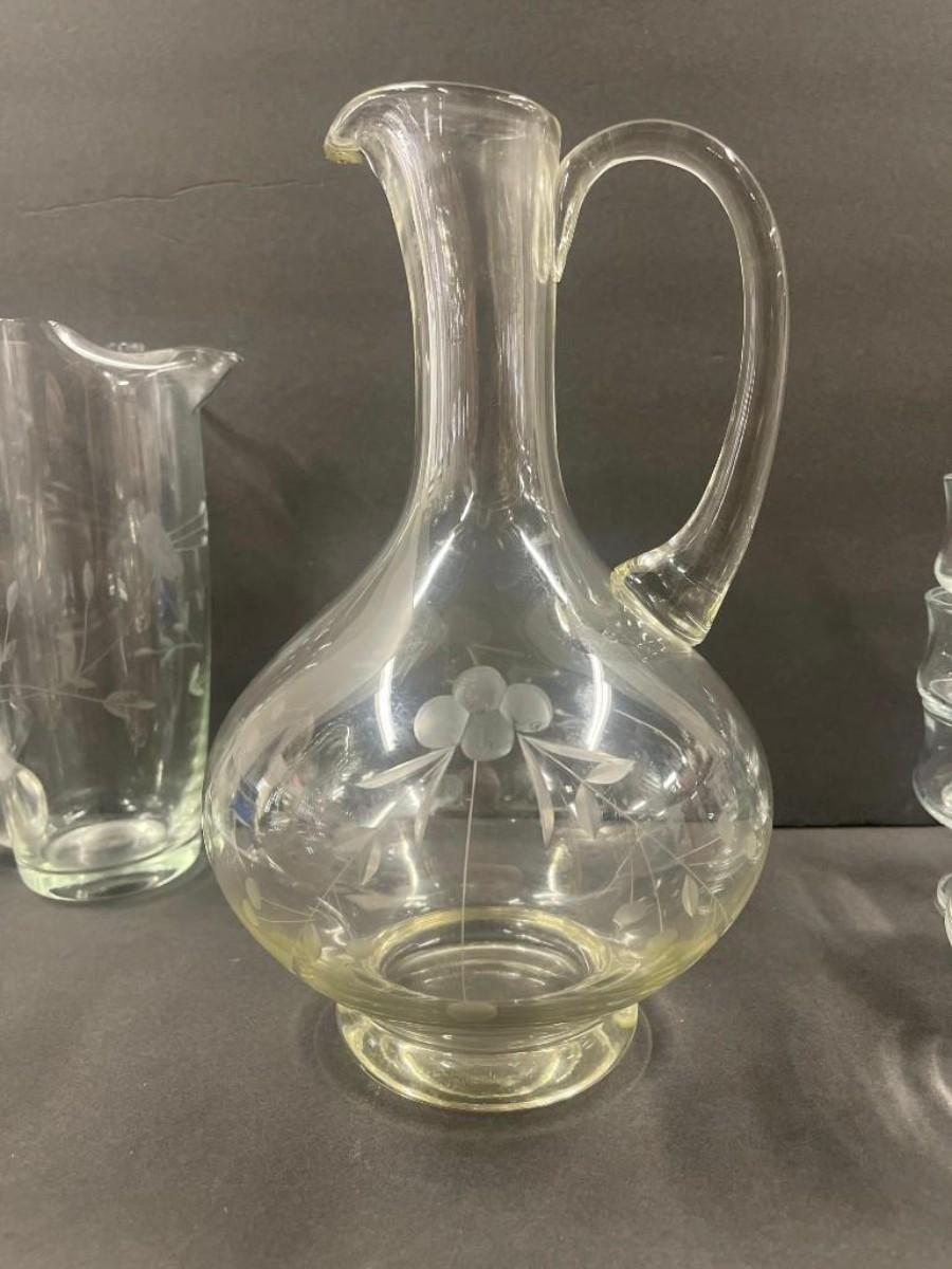 Lot of assorted glass. Includes 8 footed dessert cups, etched glass decanter and pitcher Condition: Used