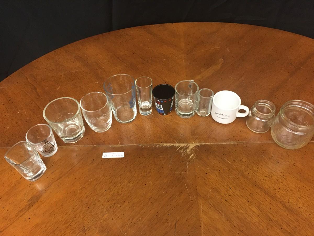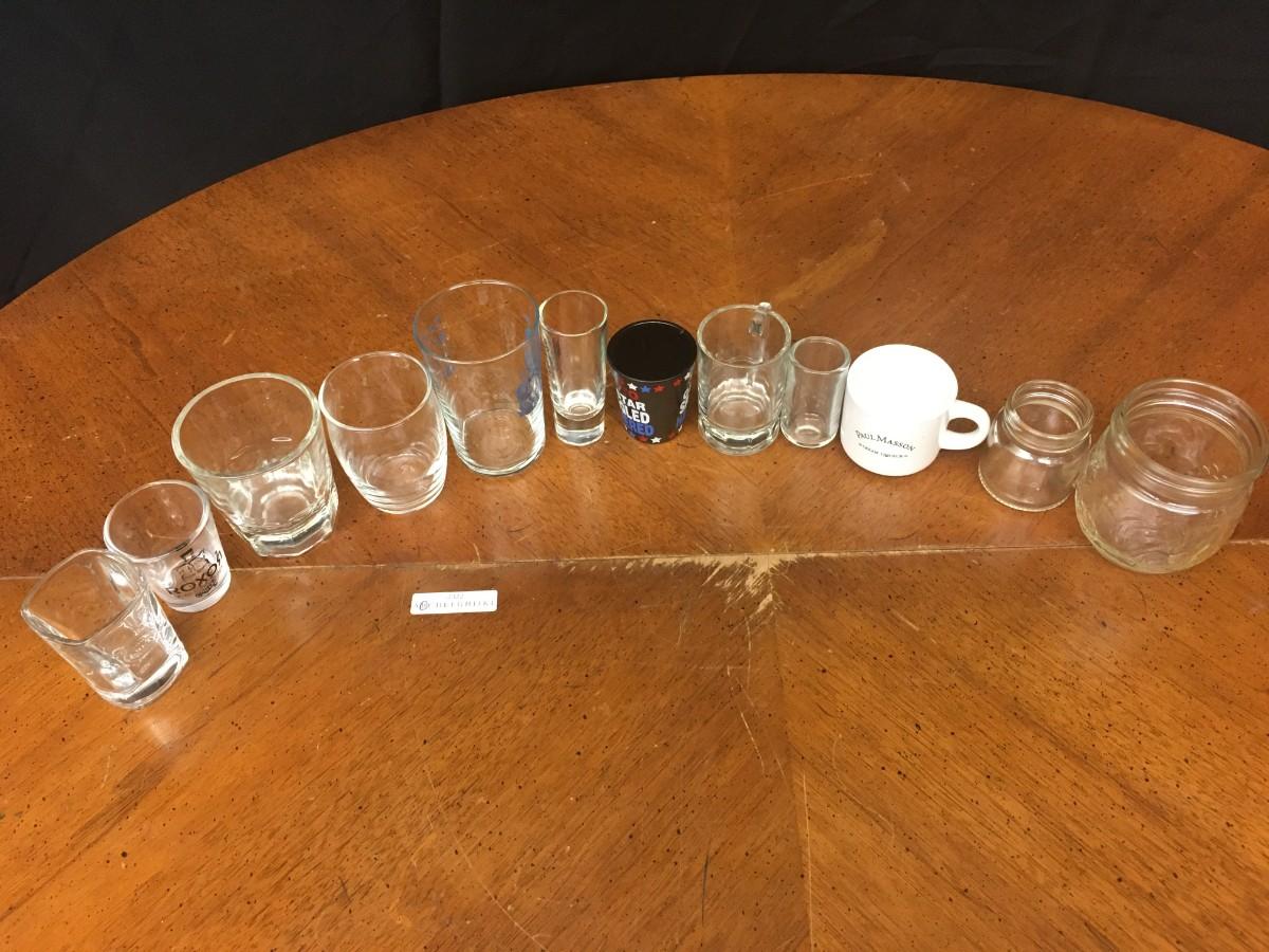 glassware: lot of assorted glasses, shot glasses, rocks glasses, ;