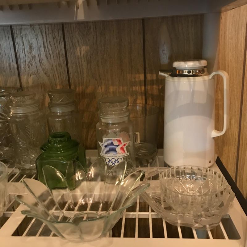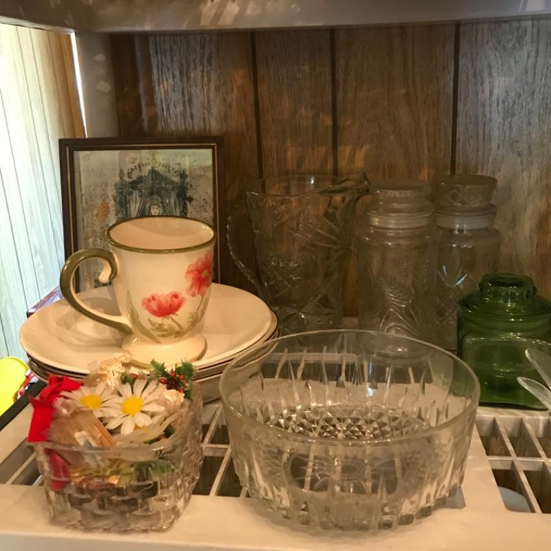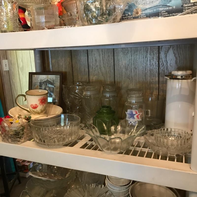 One shelf full of assorted glassware, and home decor items; see pictures. Shelves not included.