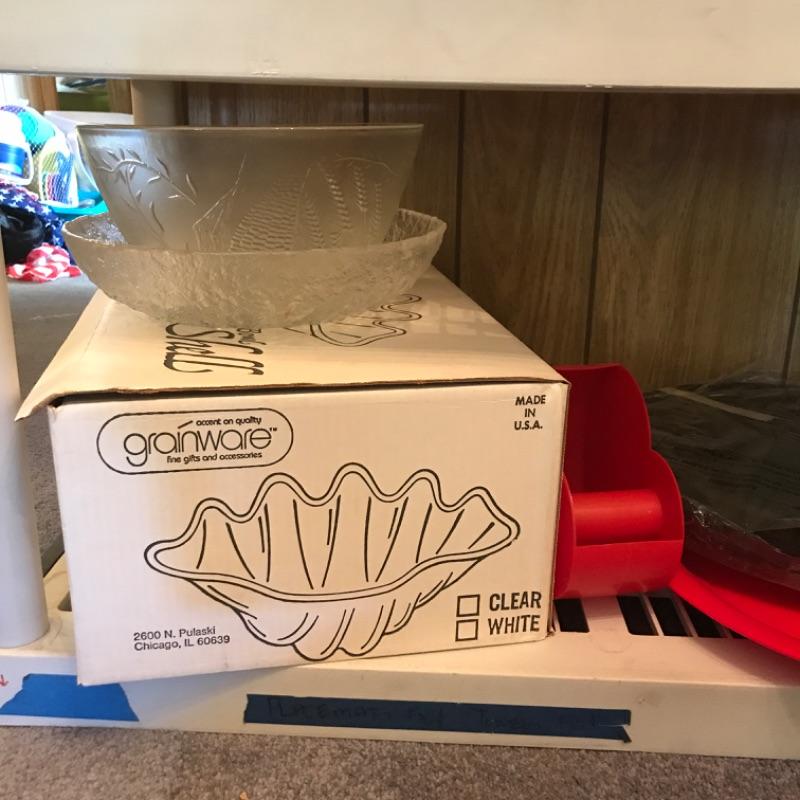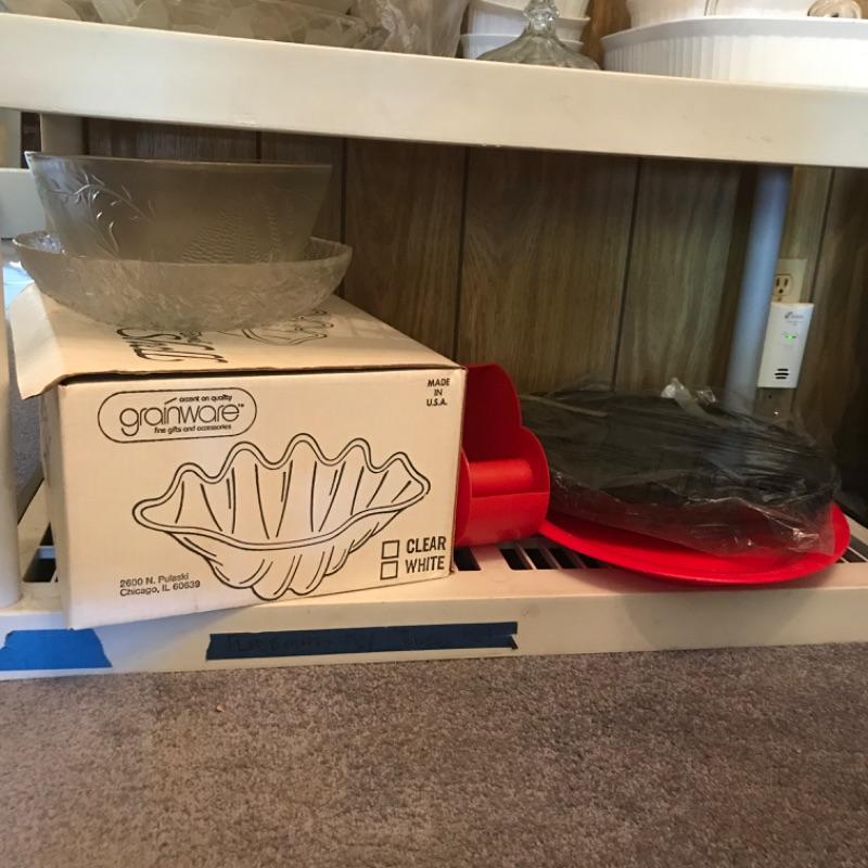 One shelf full of assorted glassware, and home decor items; see pictures. Shelves not included.