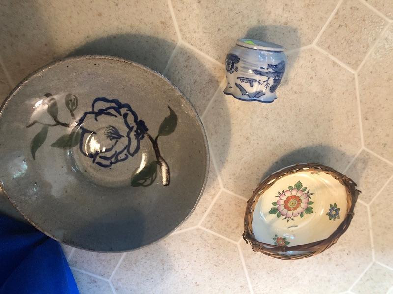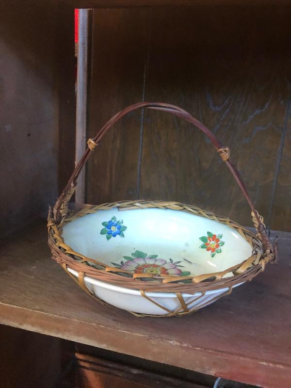 pottery decorative plate, china flowered bowl with rattan handle and oriental vase.