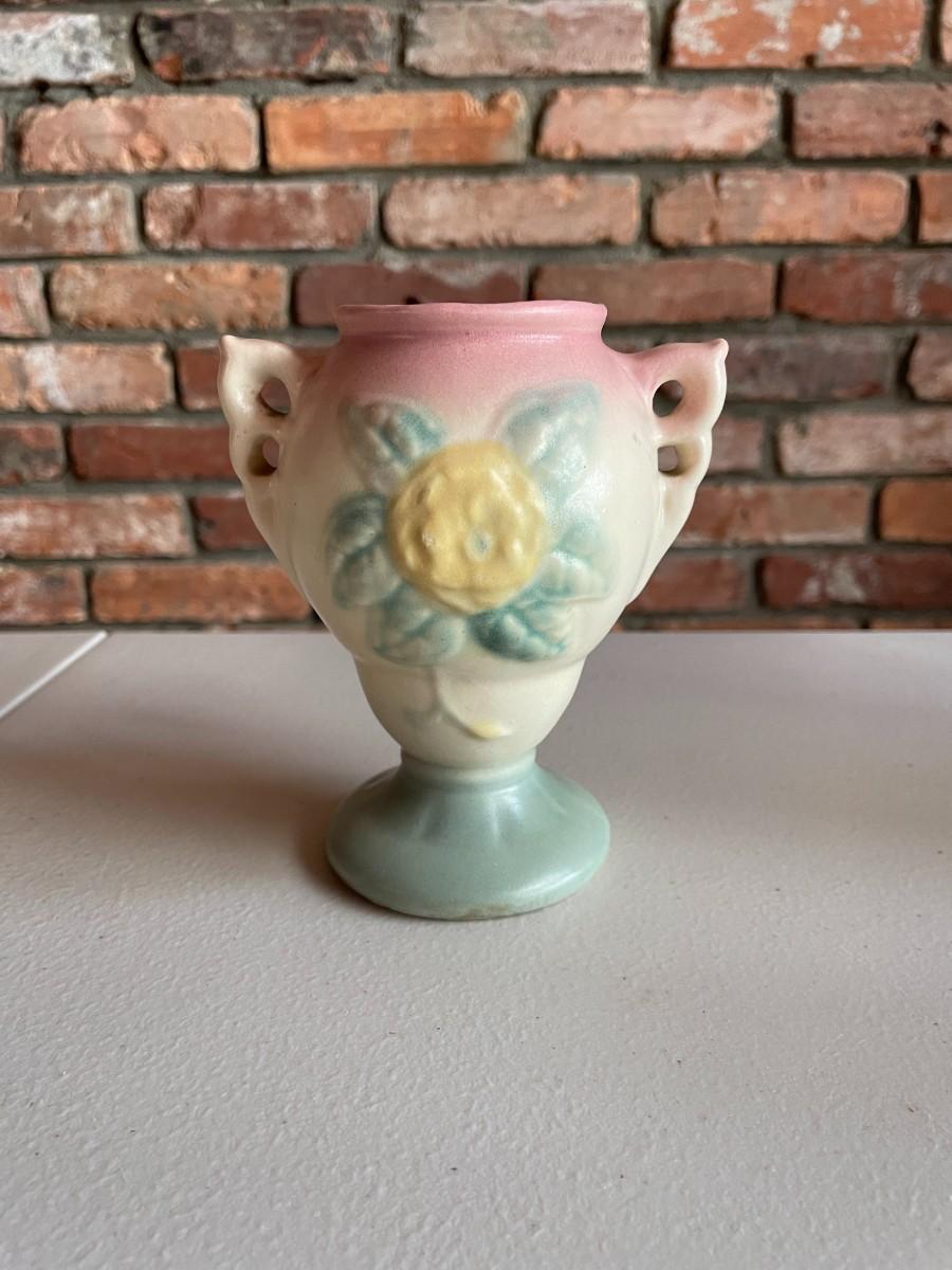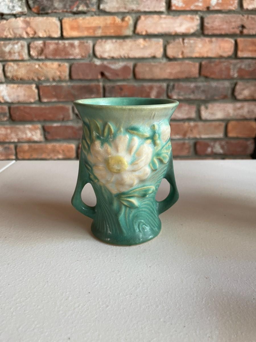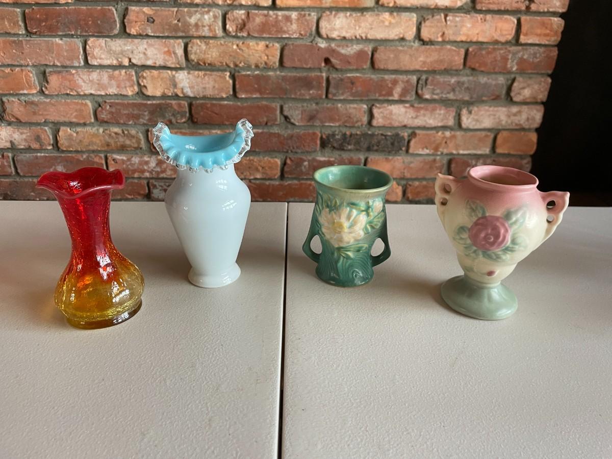 Vintage Hull open rose art pottery. Fenton Aqua Crest double crimp vase. Vintage Roseville pottery green peony vase. Vintage Amberina crackle glass vase.Blue and white: 3 1/2W x 6h